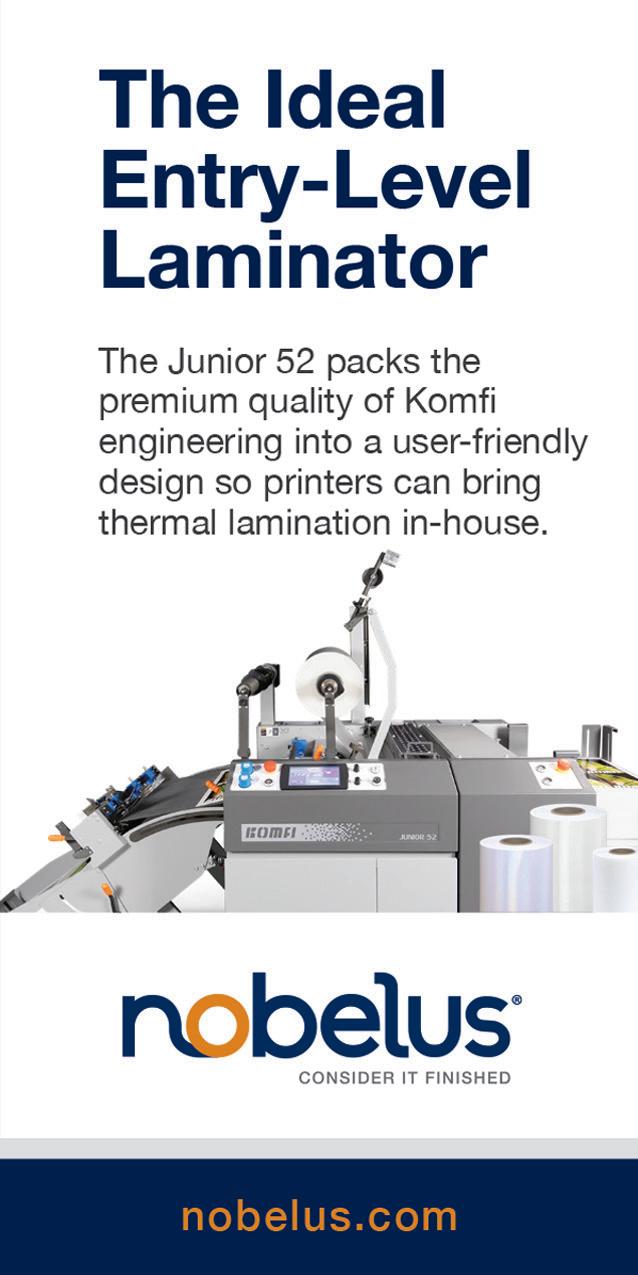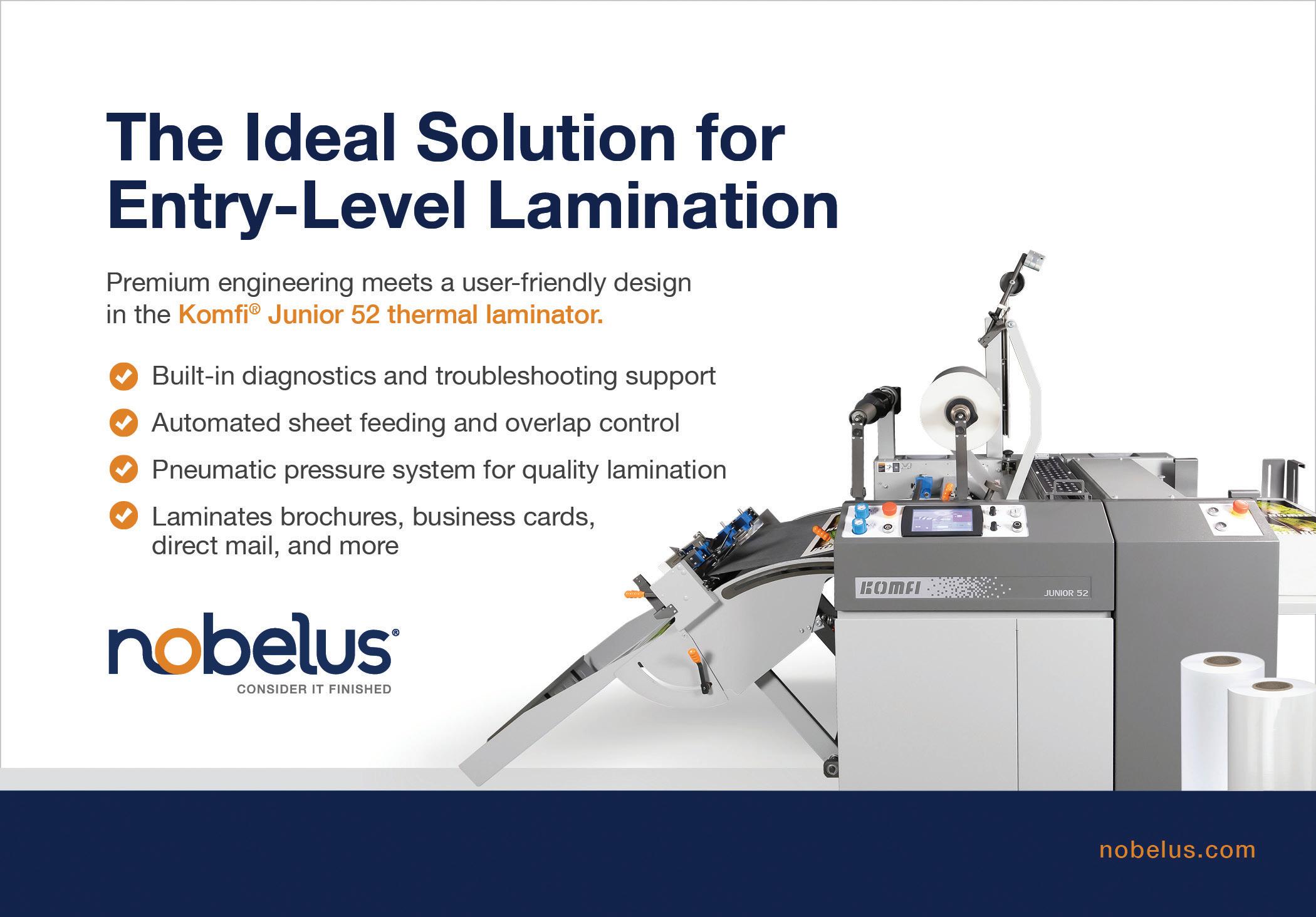 Nobelus, booth 4838, showcases three unique thermal laminators ranging from entry-level lamination to double-sided production volumes. Visit the booth to see these units in action and explore the company’s comprehensive portfolio of specialty laminate finishes, all-PE thermal sealants, and innovative pre-lams for flexible packaging. INFO# 218