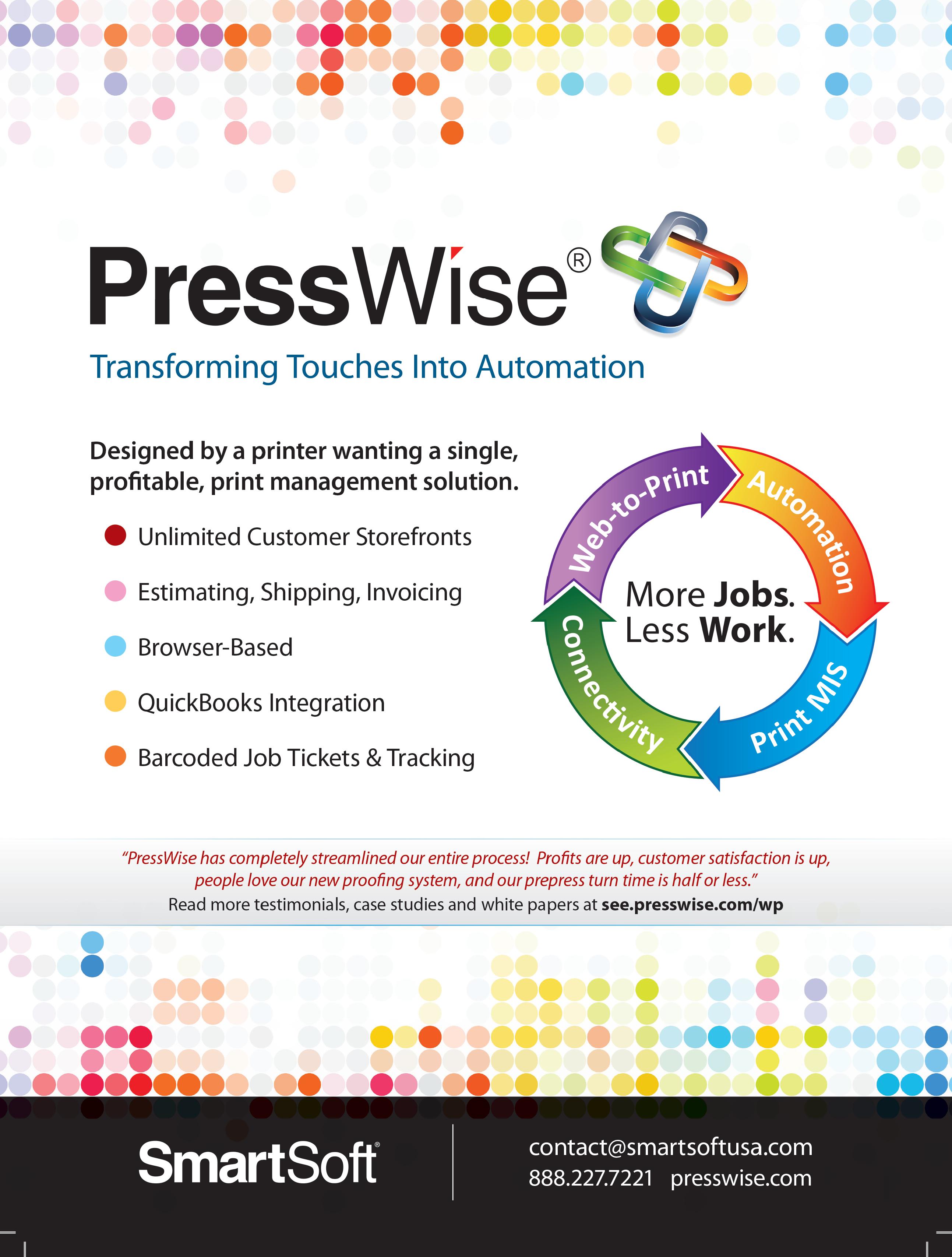 Datatech Smartsoft, booth 1903, shows attendees how to reduce touches fromprint workflows withPressWise, the end-to-end web to print, MIS, and workflowautomationplatform. INFO#205