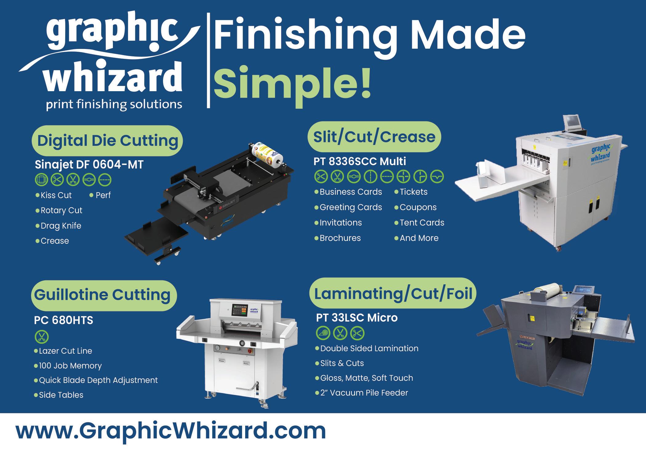 Graphic Whizard, booth 3910, highlights select finishing equipment from its portfolio of slit/crease/cutters, perfect binders, UV coaters, laminators, folders, and digital die cutters. INFO# 210