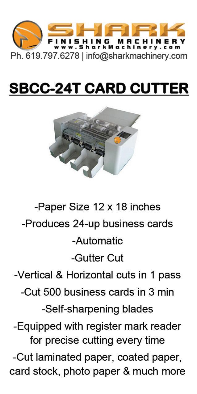 Shark Finishing Machinery, booth 4215, features its line of digital print finishing solutions which includes digital creasers, perforators, paper cutter, business card cutters, digital die cutters, corner rounders, stitchers, UV coaters, perfect binders, and paper joggers. See the new 32.2-inch hydraulic paper cutter, which is completely programmable with air bed, cutline light, safety beams, micro adjustment, auto push out, electronic soft clamp, side tables, and more. INFO# 223