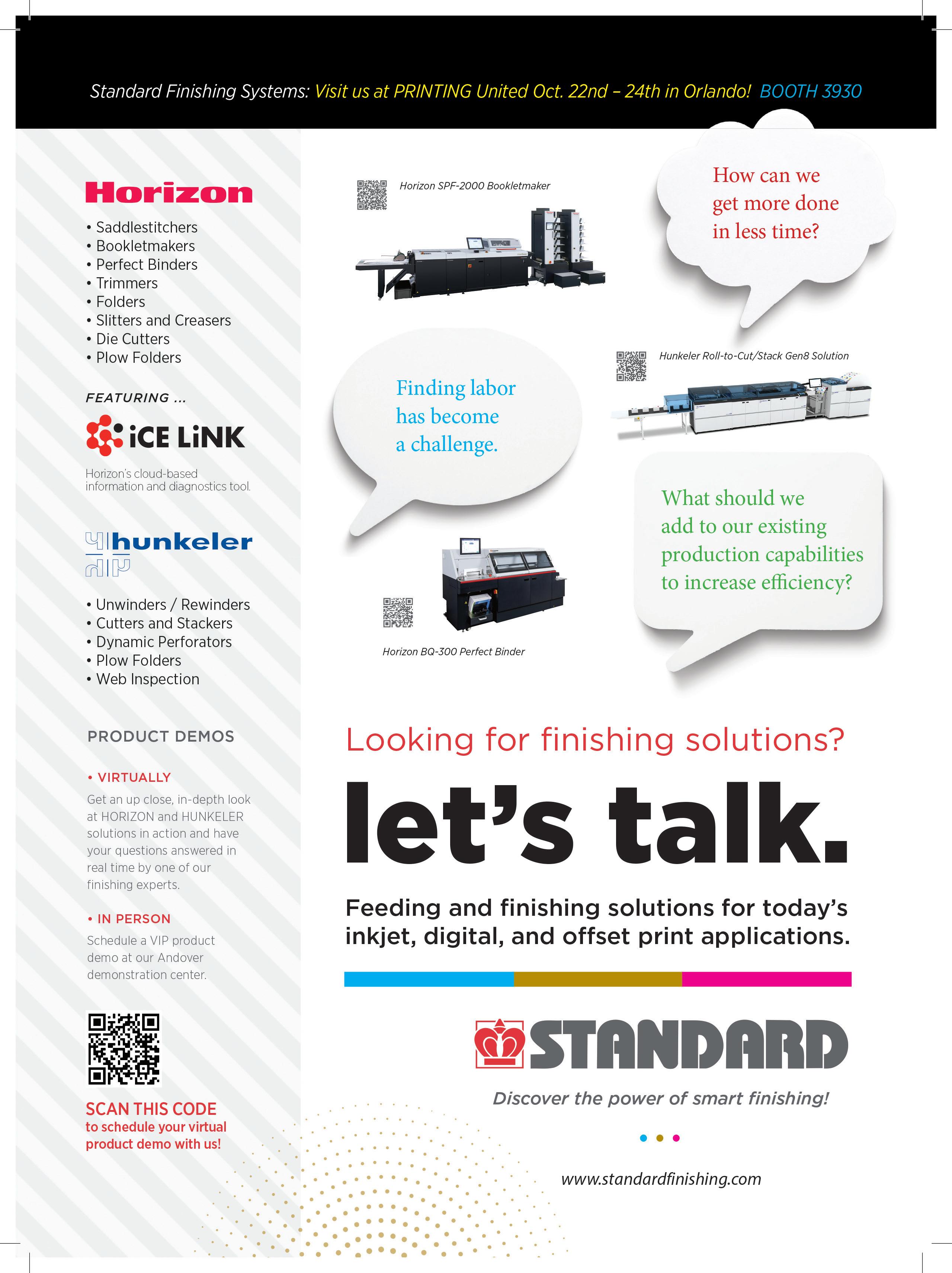 Standard Finishing Systems, booth 3930, offers demonstrations of over 20 finishing solutions from Hunkeler and Horizon in their 5,000 square foot booth, including the Horizon BQ-300 Perfect Binder, the Horizon AFV-566FKT Folder, and the Hunkeler/Horizon Roll-to-Saddlestitch combination solution. INFO# 225
