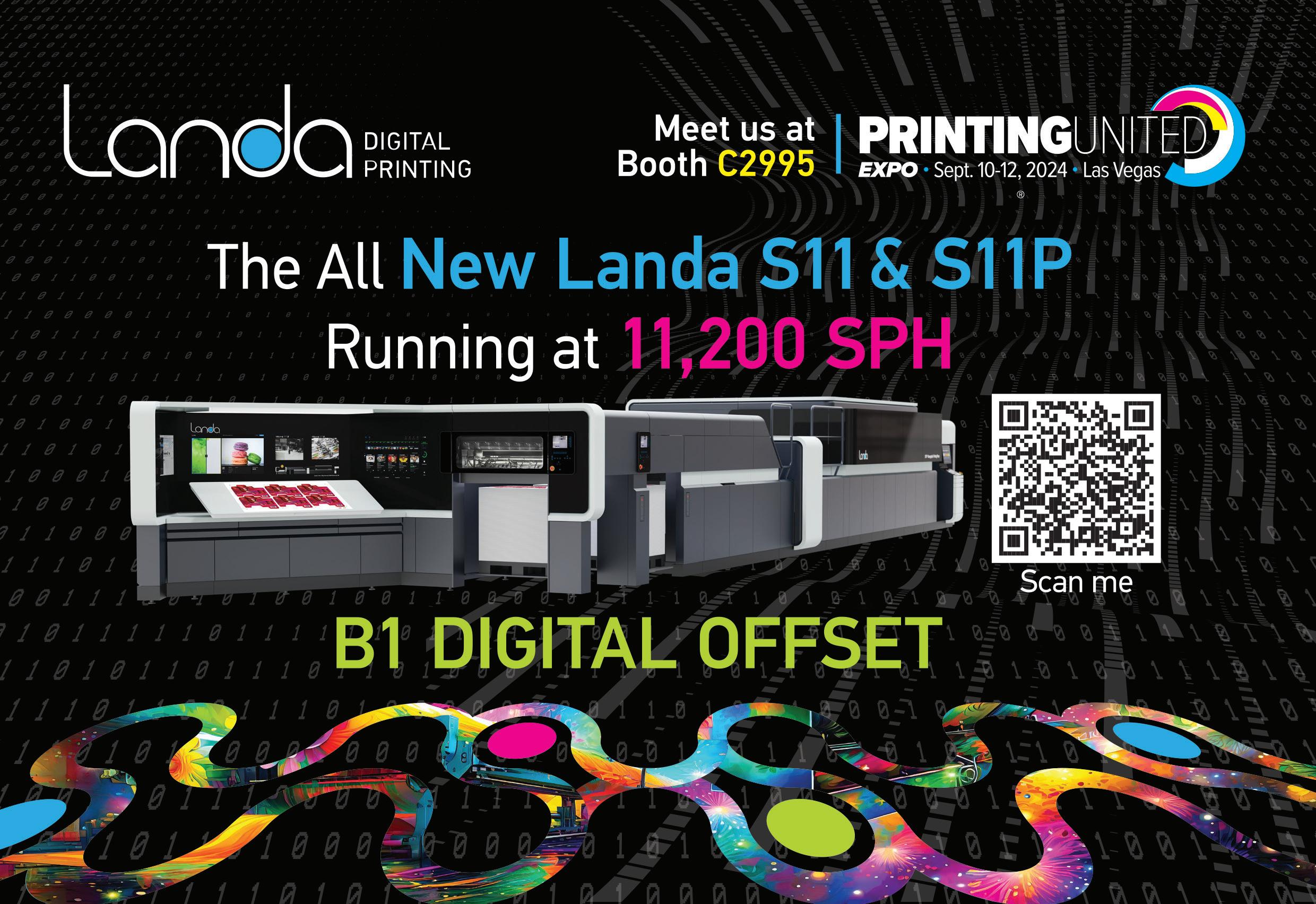 Landa, booth C2995, invites attendees to learn about the Landa Sll & SllP digital Bl offset presses driven by Nanography. These presses offer versatility and productivity, handling various substrates with ease. With unmatched color gamut and printing 11,200 sheets per hour, the Sll & SllP maximize