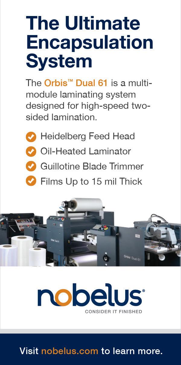 Nobelus demonstrated its new Orbis Dual 61 Laminating System. The multi-module thermal laminating system consists of a feeder, laminator, and trimmer that seamlessly work together to perform high-volume double-sided lamination and encapsulation.