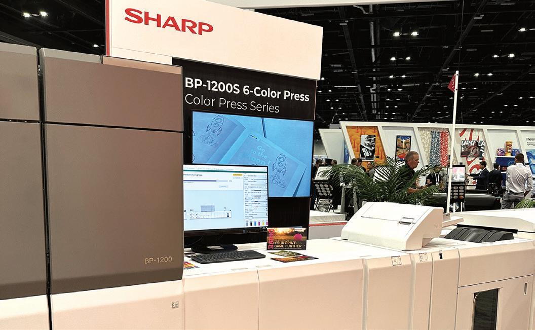 For toner-based production, Sharp previewed its latest innovations in digital press technology, including expanded BP-1200S Color Press Series with sixcolor single-pass output and tactile embellishments, streamlined monochrome production with GBC FuturoPunch ProUpcoming BP-80C80 entry-level