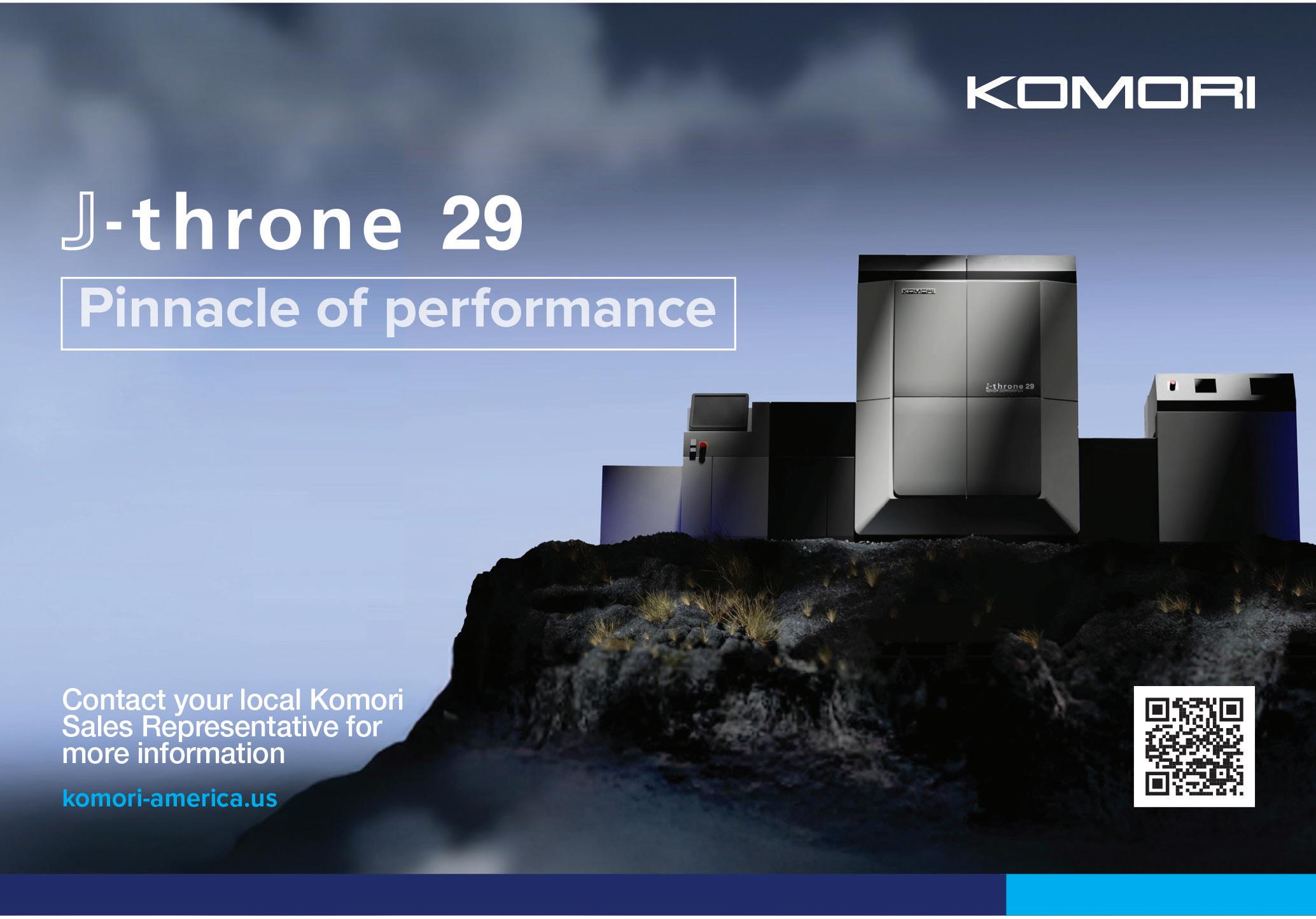 3. With the Muller Martini Sigmaline Compact, digital printers can produce more end products in smaller spaces with fewer staff and a lower waste rate. 4. The Komori J-Throne 29 B2+ press delivers up to 6,000 sheets per hour in single-sided printing.