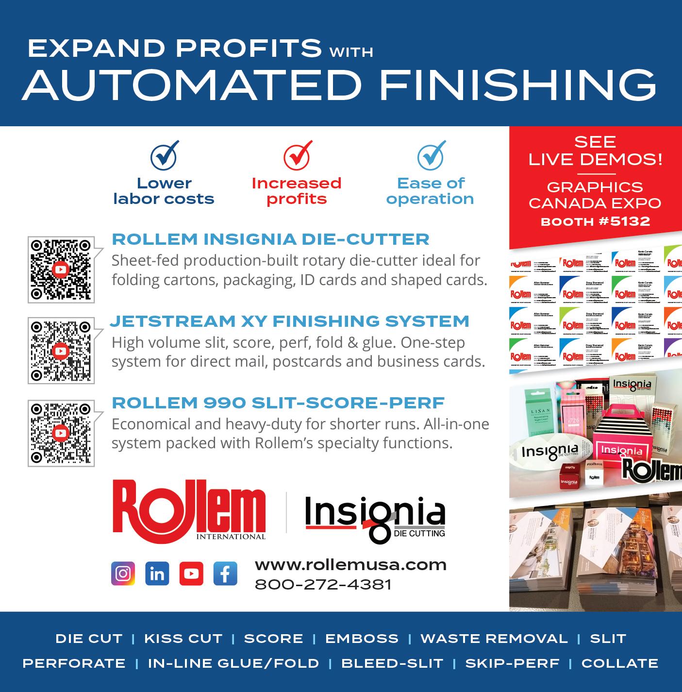 Rollem showcased the new Strata finishing systems, which combine an tight, compact footprint with the high productivity. The touchscreen controls and screw drive adjustments allow for simplified, quick adjustments between size and skew of carton. Utilizing true belt folding technology it overcomes traditional limitations of fixed plough-rail folding systems.