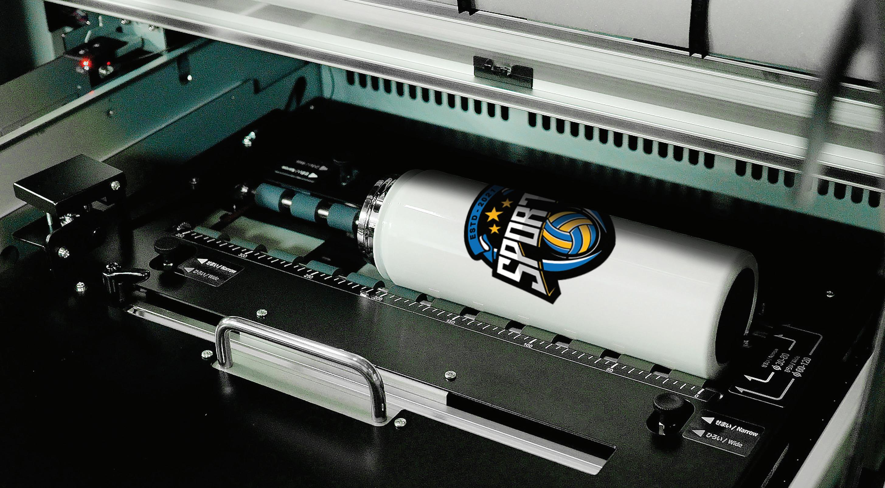 For introductory purposes, a desktopsize UV digital printer is practical and cost effective. Especially for cylindrical objects. It’s easy enough to print a small, flat object and then either place a jig or rotary tool into the printer—if applicable—to print directly to a cylindrical item.