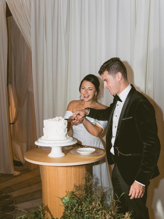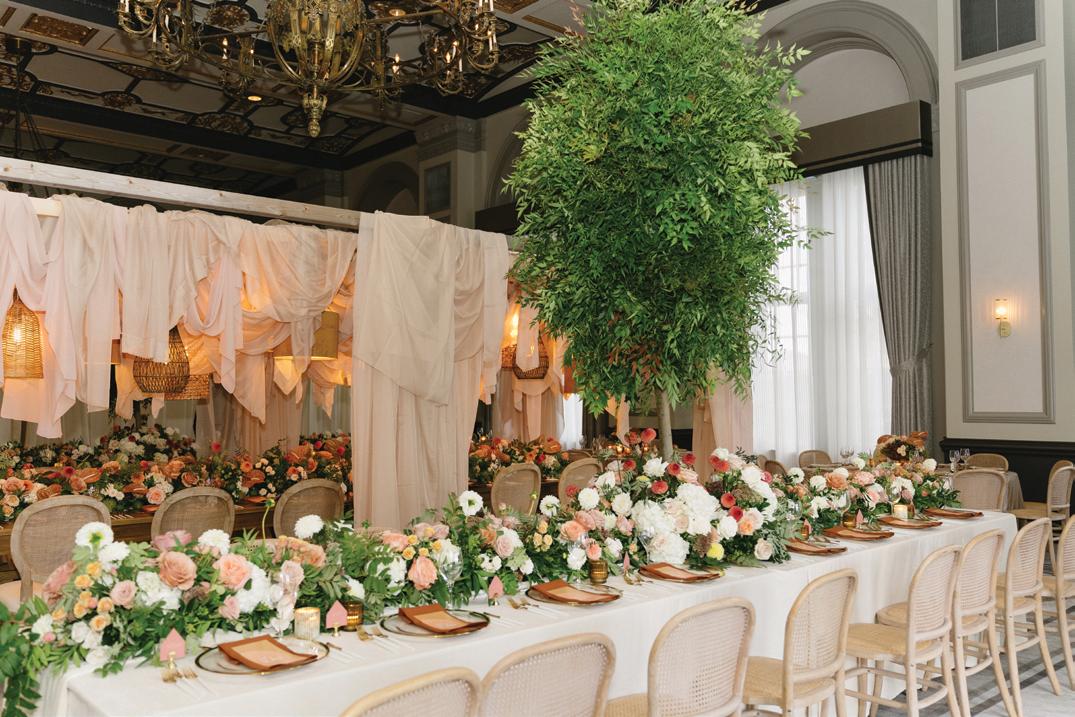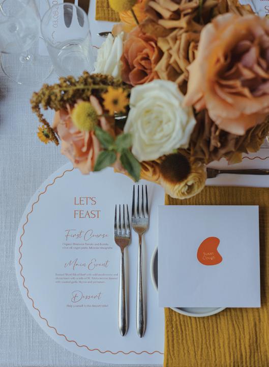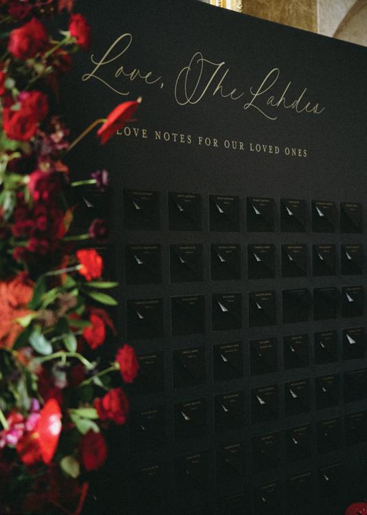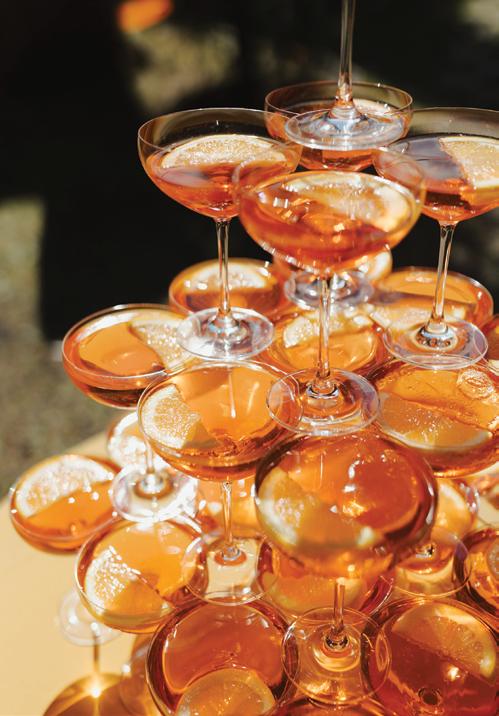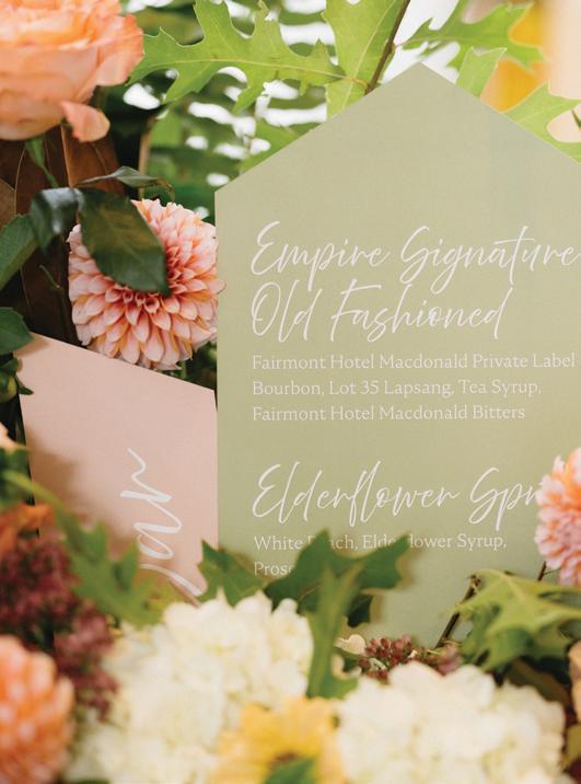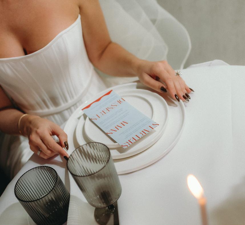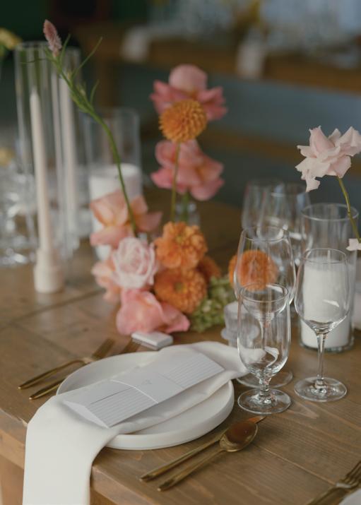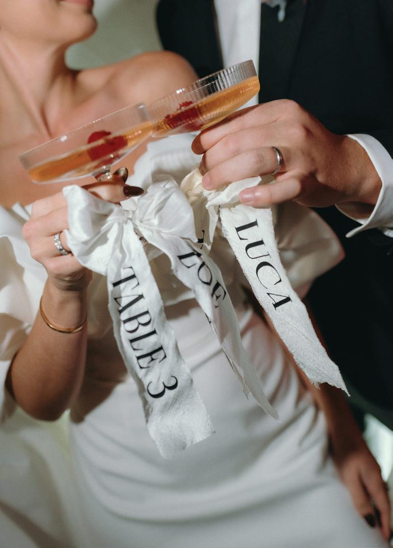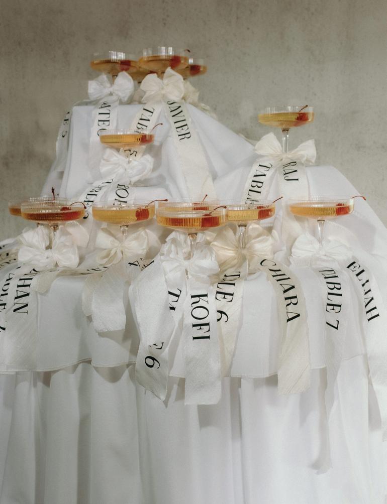 After the ceremony, the bride slipped into a playful white cocktail dress by Jenny Yoo featuring voluminous ruffled sleeves. It was the perfect look for mingling beside the oneof-a-kind champagne tower accessorized with cherries that doubled as a seating chart. Raw silk bows were handmade by Unadorned Stationey with each guest’s name and table number, cascading from coupe glasses for a personalized, fashion-forward moment.