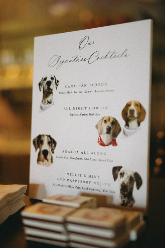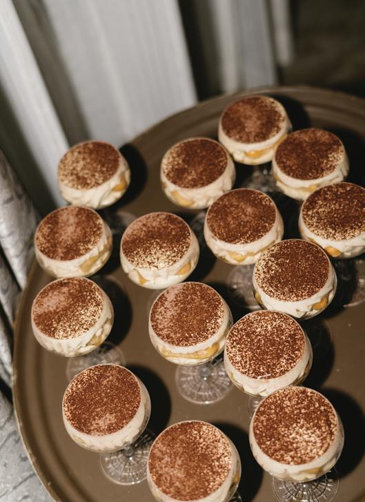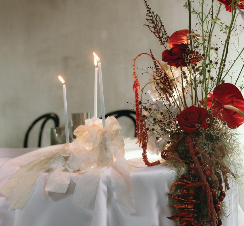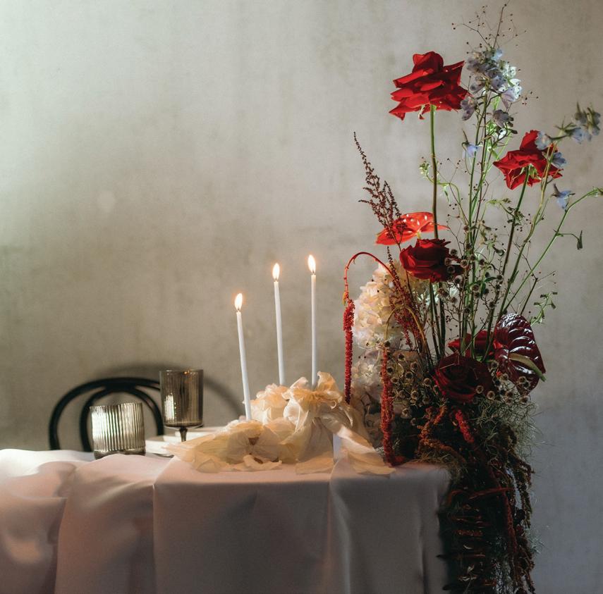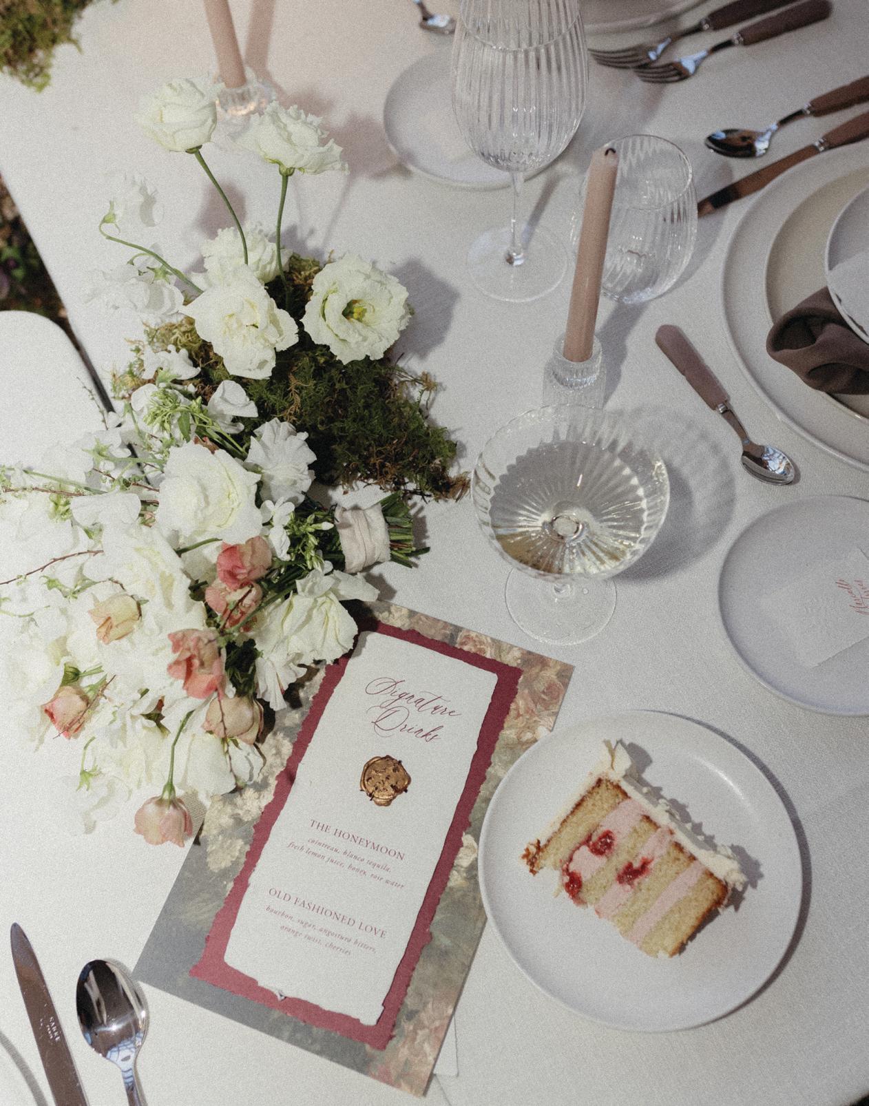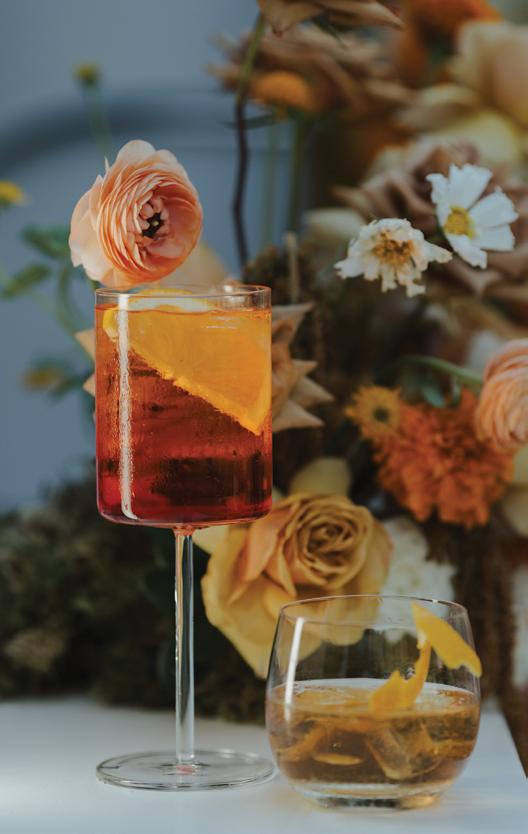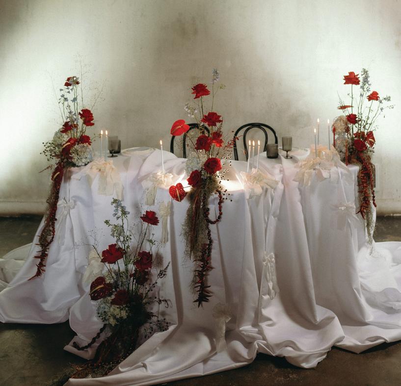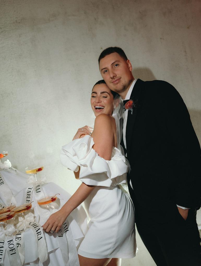 After the ceremony, the bride slipped into a playful white cocktail dress by Jenny Yoo featuring voluminous ruffled sleeves. It was the perfect look for mingling beside the oneof-a-kind champagne tower accessorized with cherries that doubled as a seating chart. Raw silk bows were handmade by Unadorned Stationey with each guest’s name and table number, cascading from coupe glasses for a personalized, fashion-forward moment.