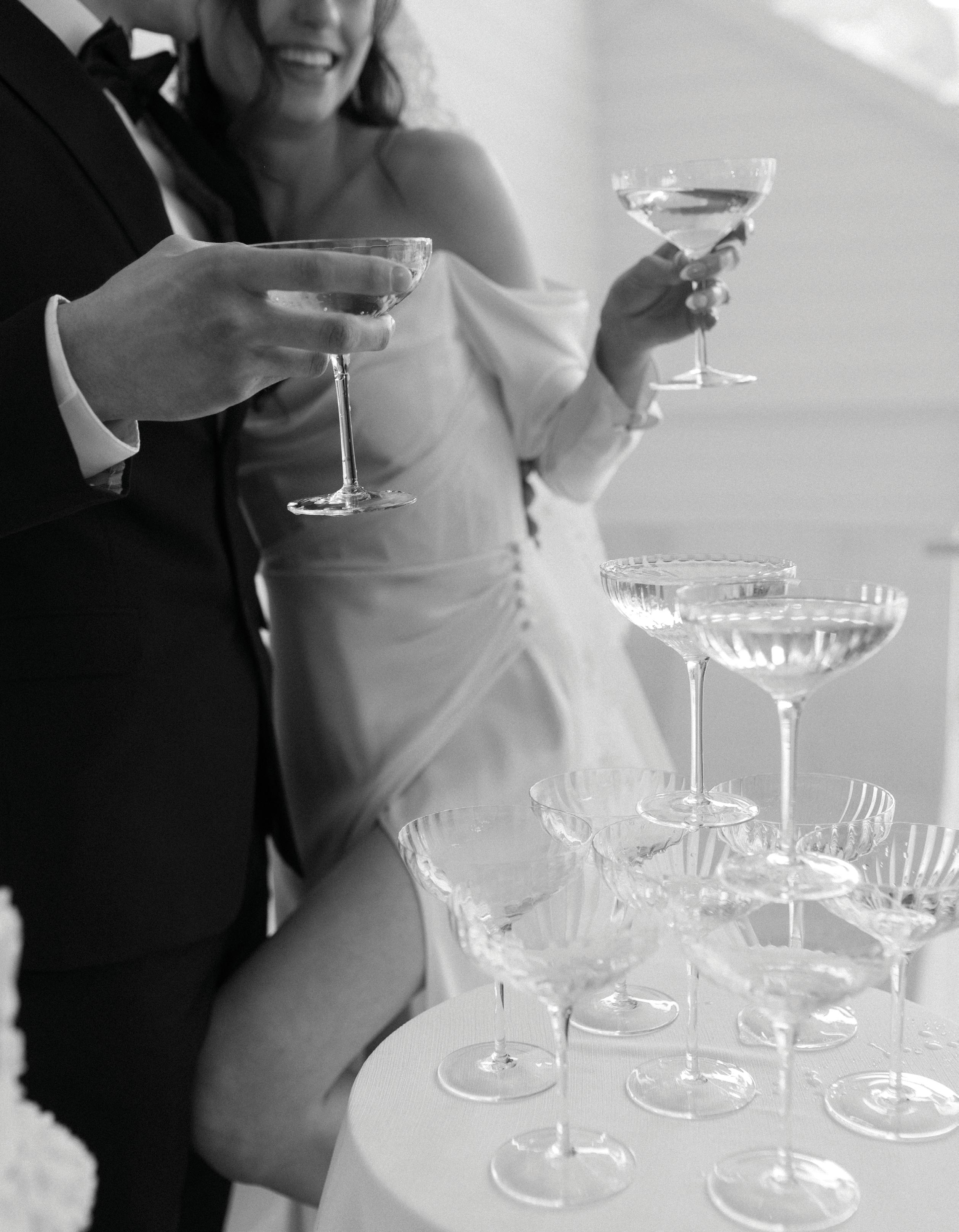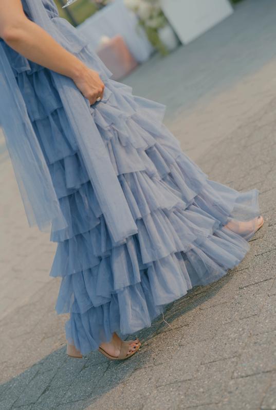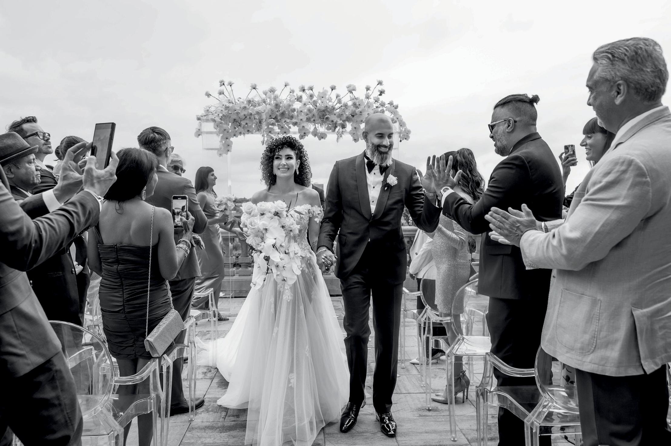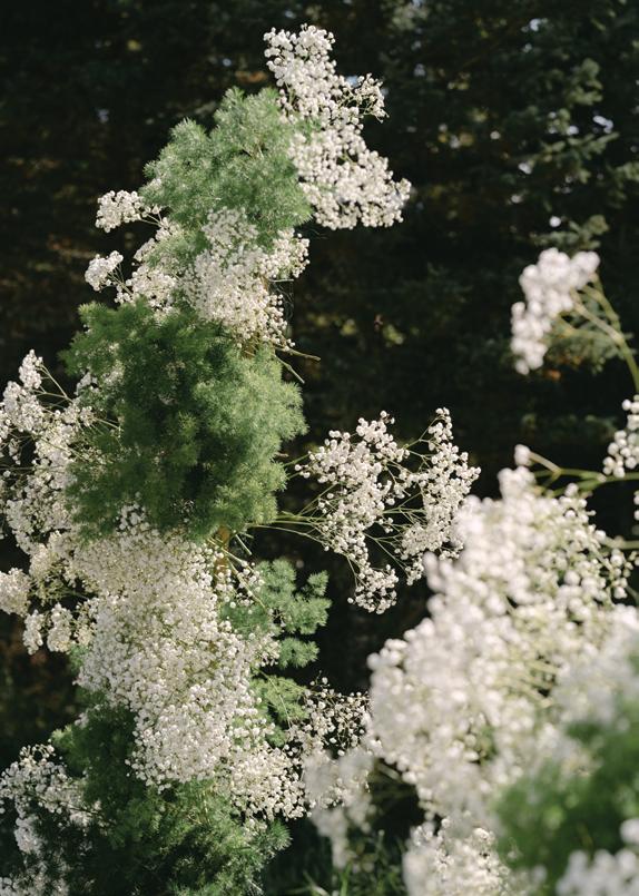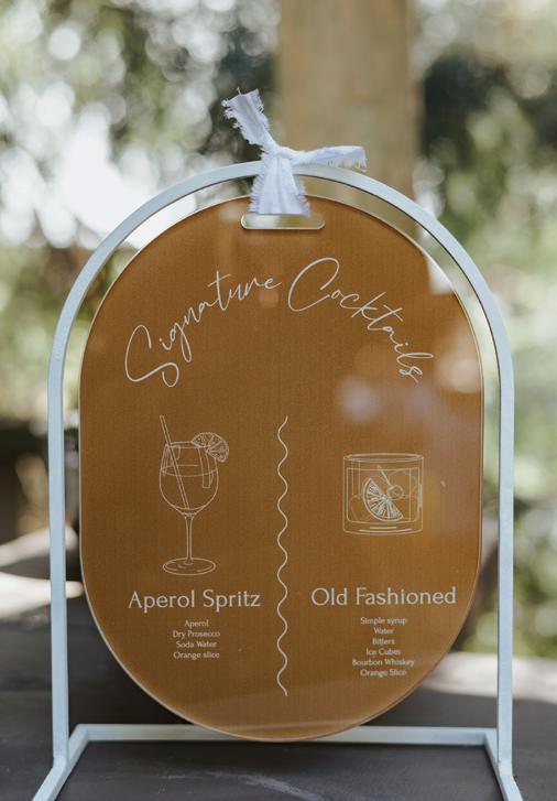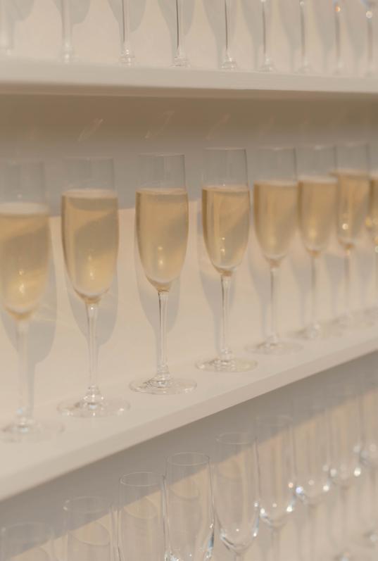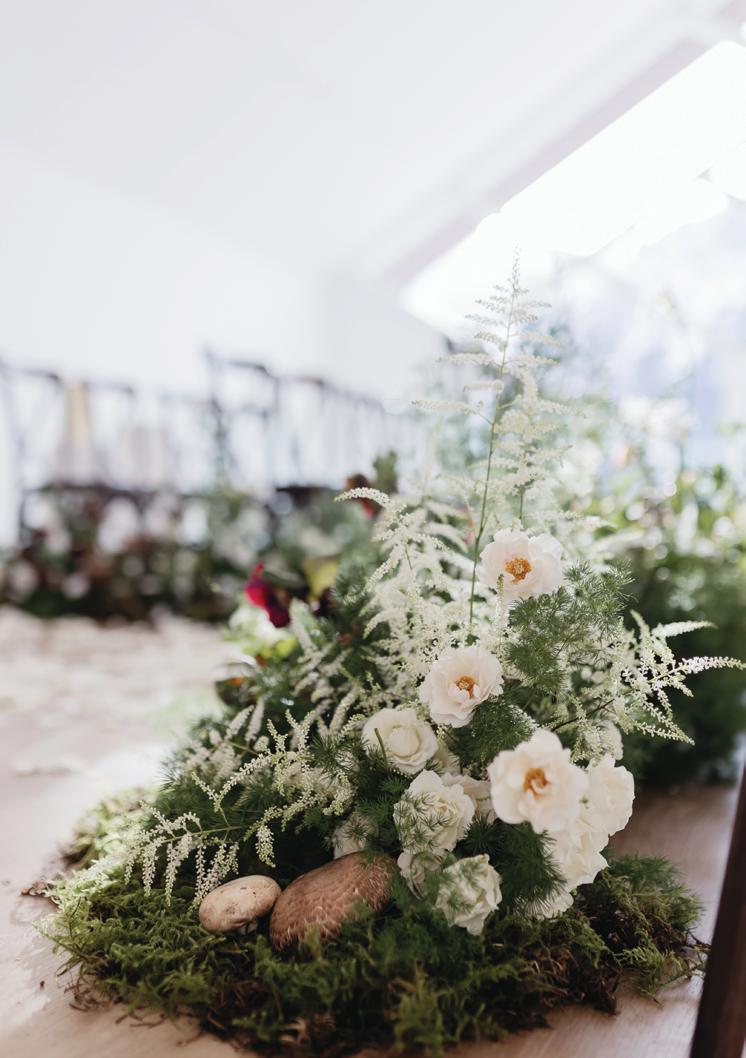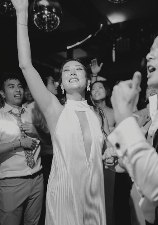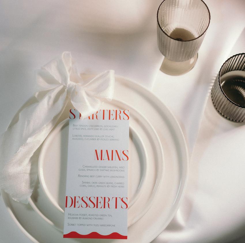After the ceremony, the bride slipped into a playful white cocktail dress by Jenny Yoo featuring voluminous ruffled sleeves. It was the perfect look for mingling beside the oneof-a-kind champagne tower accessorized with cherries that doubled as a seating chart. Raw silk bows were handmade by Unadorned Stationey with each guest’s name and table number, cascading from coupe glasses for a personalized, fashion-forward moment.