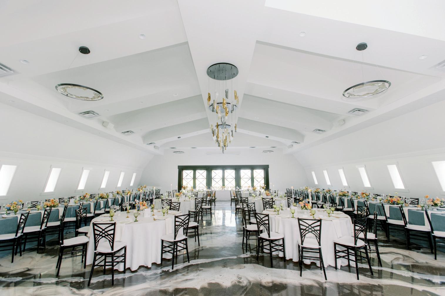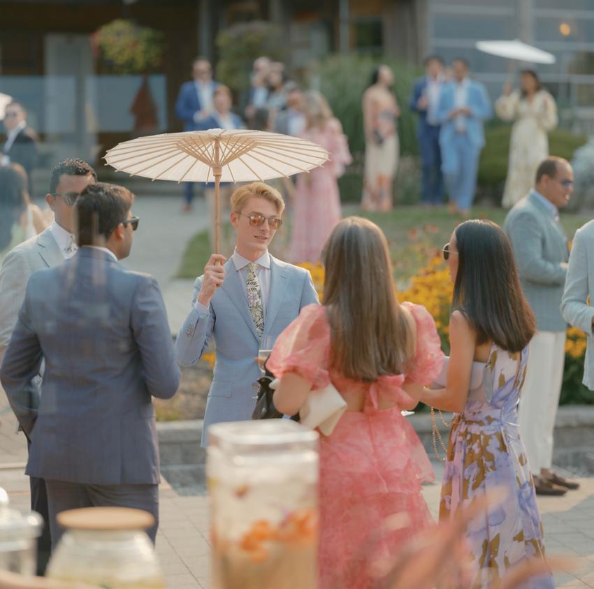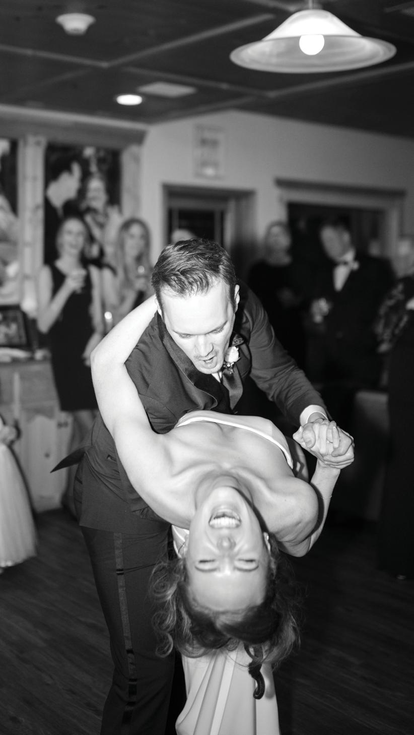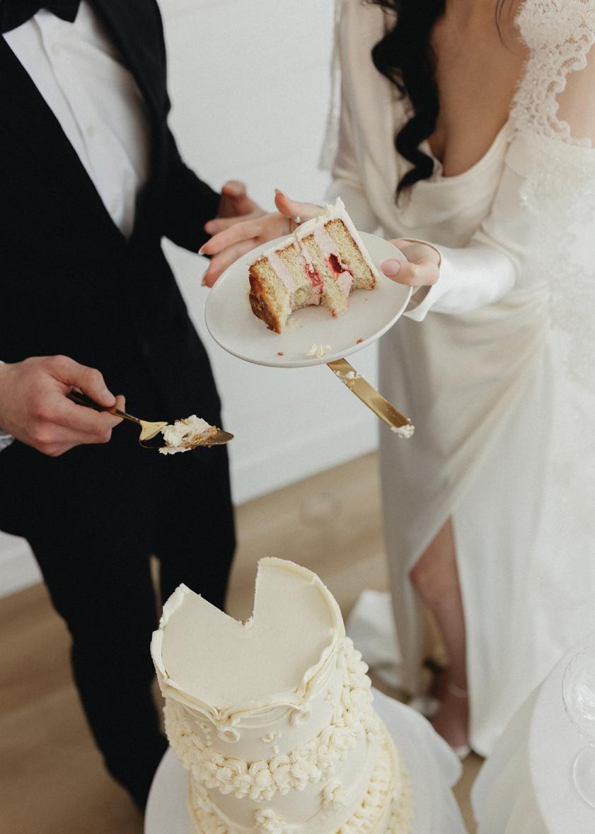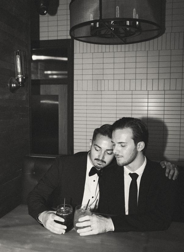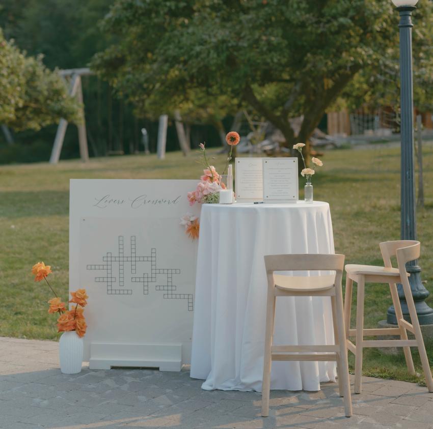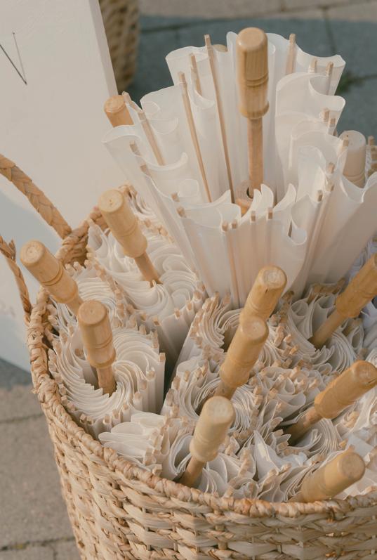 After the ceremony, the bride slipped into a playful white cocktail dress by Jenny Yoo featuring voluminous ruffled sleeves. It was the perfect look for mingling beside the oneof-a-kind champagne tower accessorized with cherries that doubled as a seating chart. Raw silk bows were handmade by Unadorned Stationey with each guest’s name and table number, cascading from coupe glasses for a personalized, fashion-forward moment.