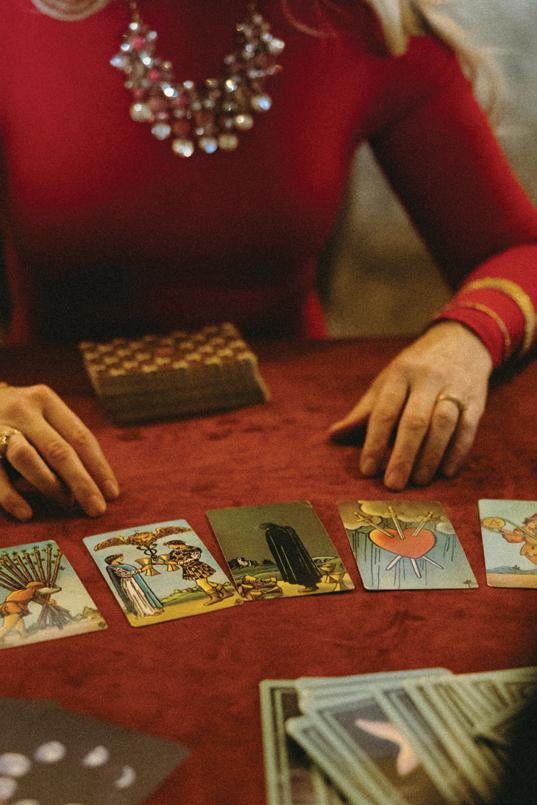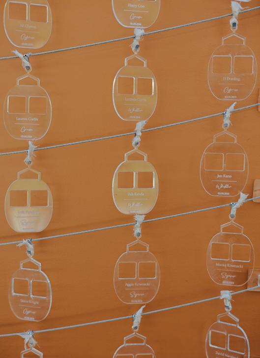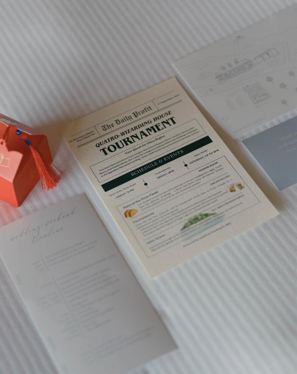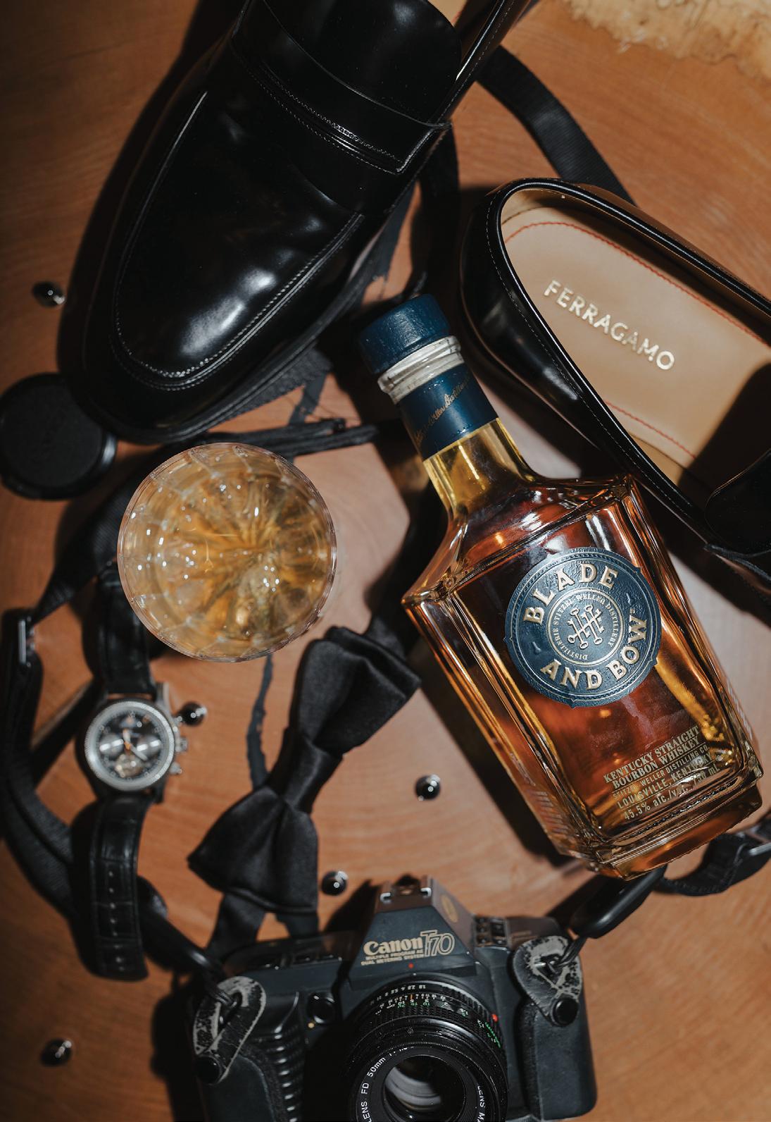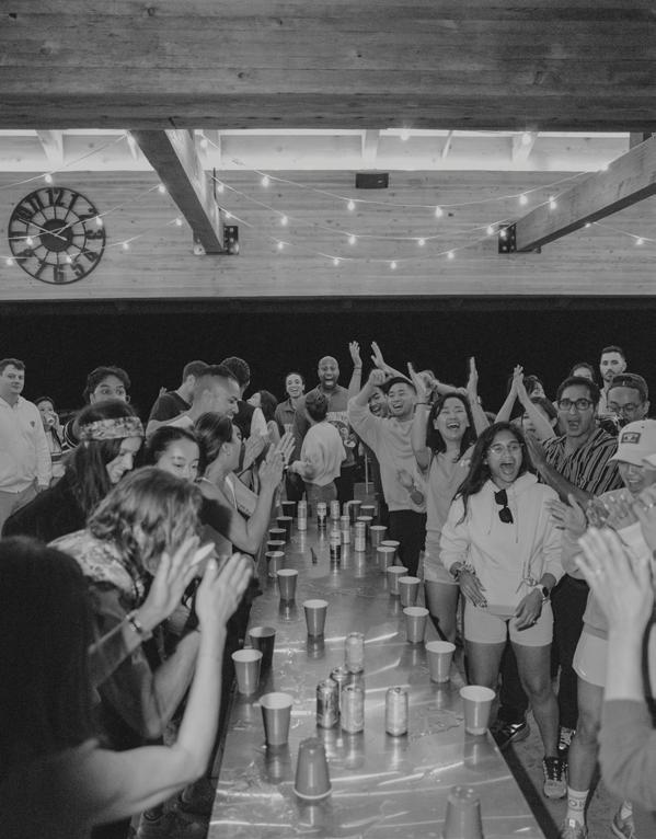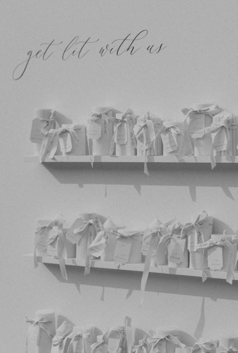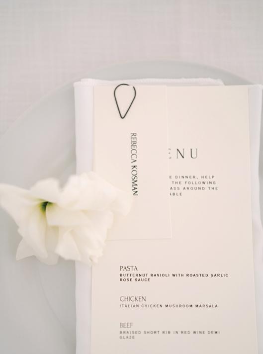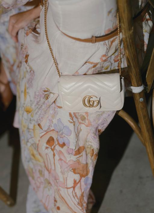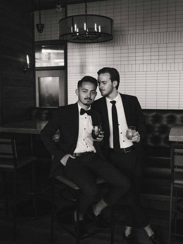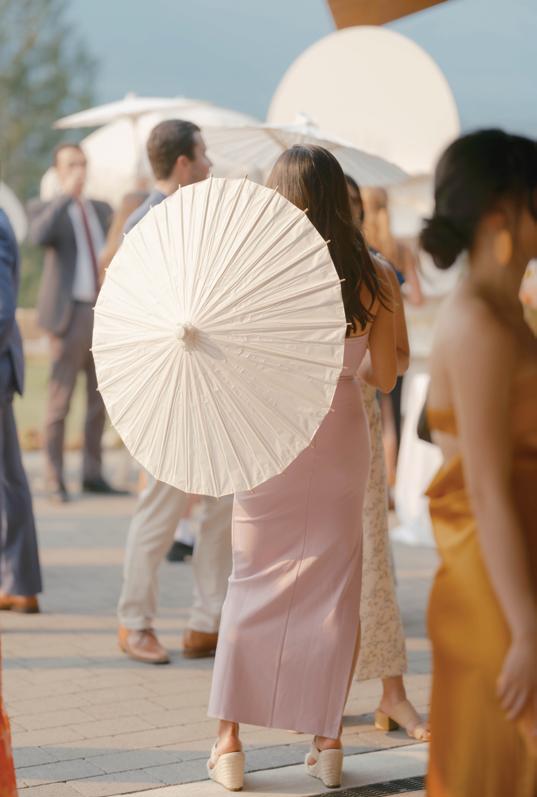 After the ceremony, the bride slipped into a playful white cocktail dress by Jenny Yoo featuring voluminous ruffled sleeves. It was the perfect look for mingling beside the oneof-a-kind champagne tower accessorized with cherries that doubled as a seating chart. Raw silk bows were handmade by Unadorned Stationey with each guest’s name and table number, cascading from coupe glasses for a personalized, fashion-forward moment.