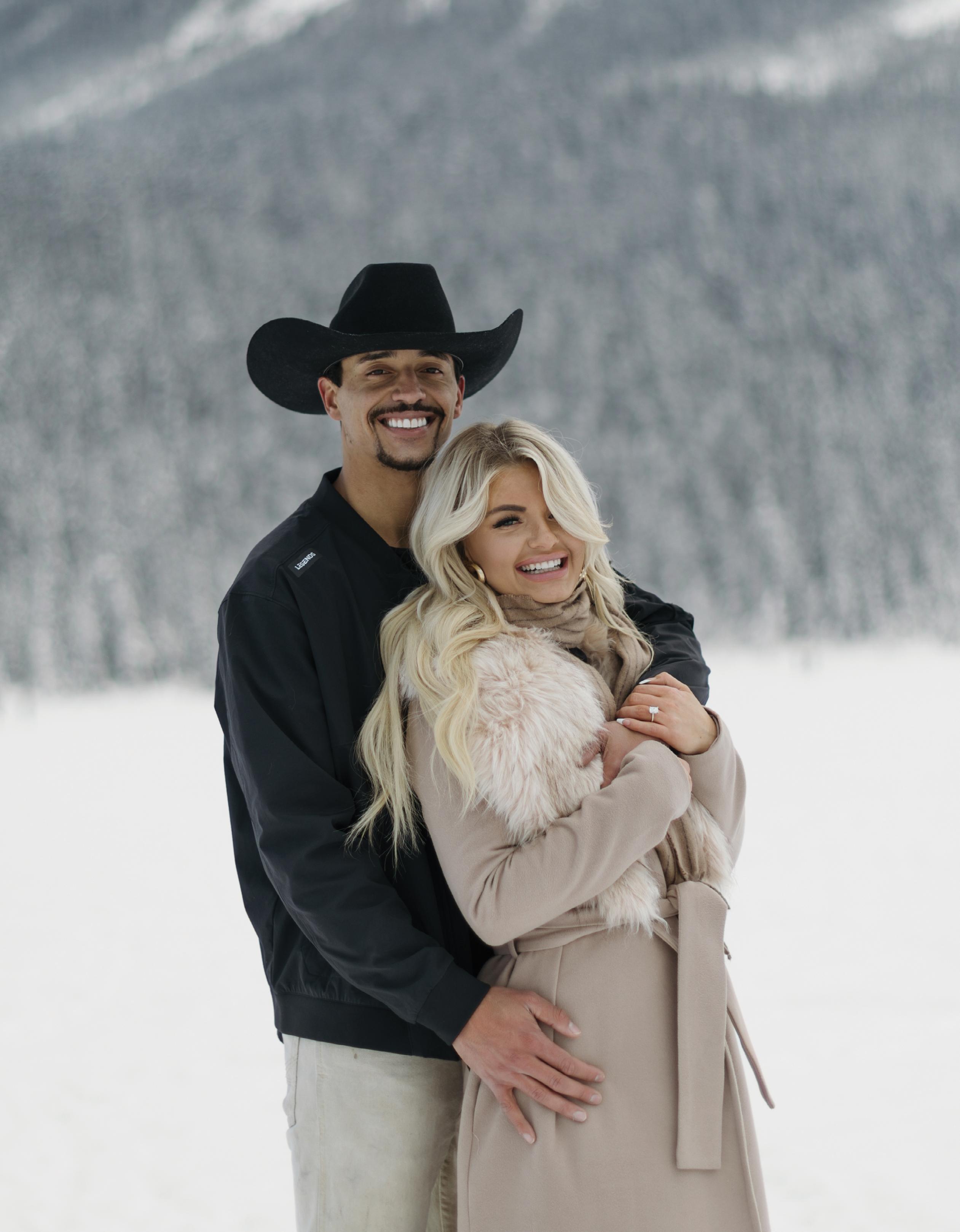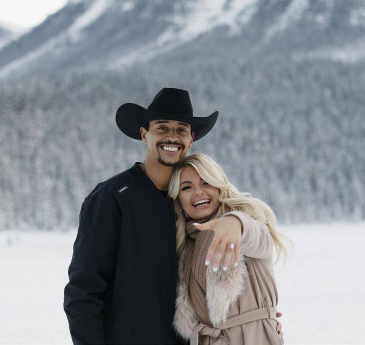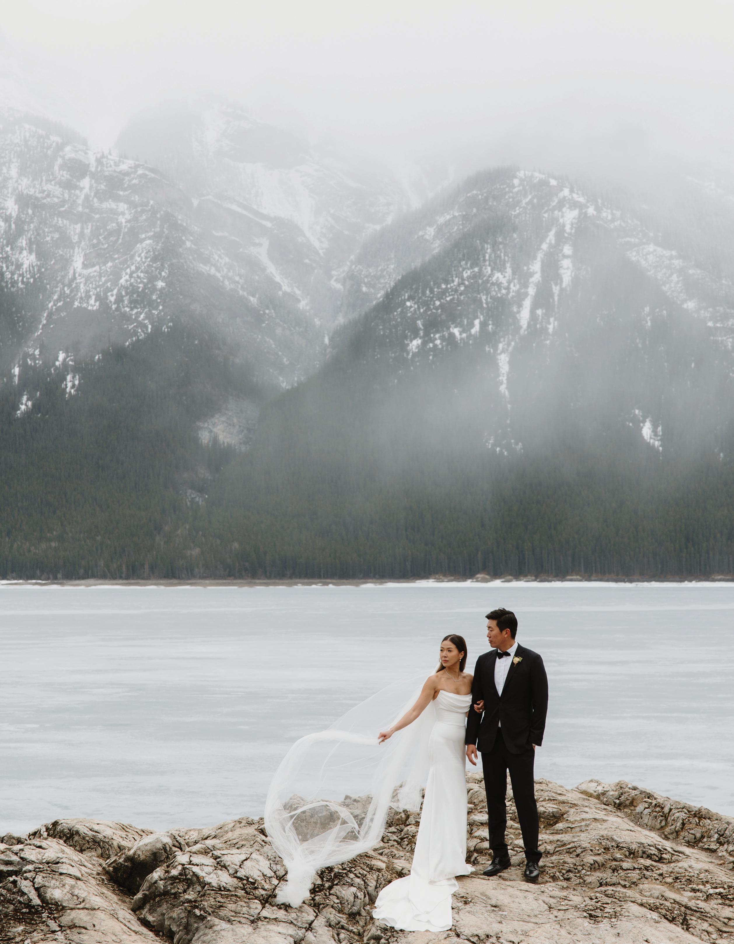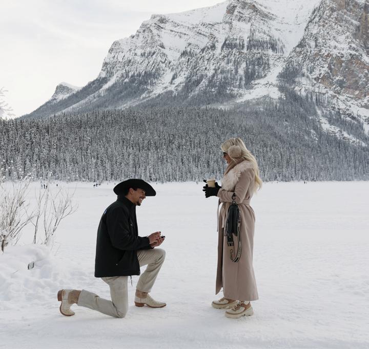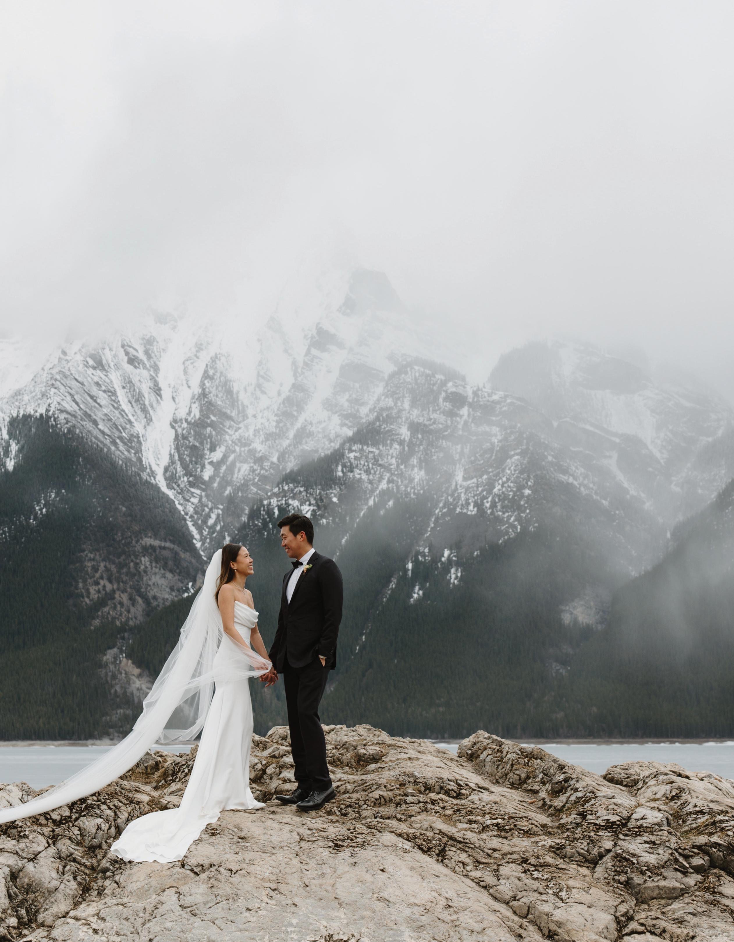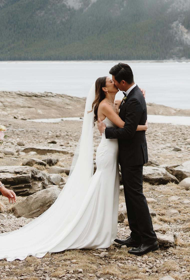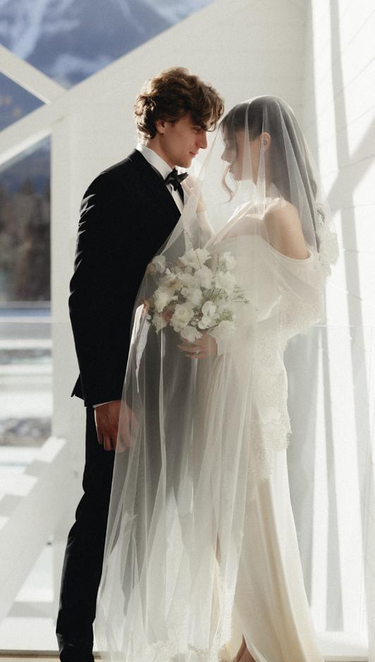 When it came time to plan their wedding, Megan and Derrick knew they wanted somewhere that felt meaningful to them, and that place was Banff. “There’s just something about the mountains, the fresh air, the stillness. It always takes our breath away,” Megan shares. With Lake Minnewanka serving as the ultimate backdrop, Megan and Derrick said “I do” with just five family members present. Megan wore a custom silk gown by Studio Kariz with a sleek mermaid silhouette and a long, romantic veil for the ceremony. After the ceremony, Megan traded her veil for a soft tulle cape, adding an ethereal and refined elegance to her look. The couple later hiked through the snow to capture portraits at Peyto Lake, where snowflakes began to fall. To end the evening, Megan and Derrick gathered with their guests for an intimate dinner at The Vermillion Room located in the iconic Fairmont Banff Springs.