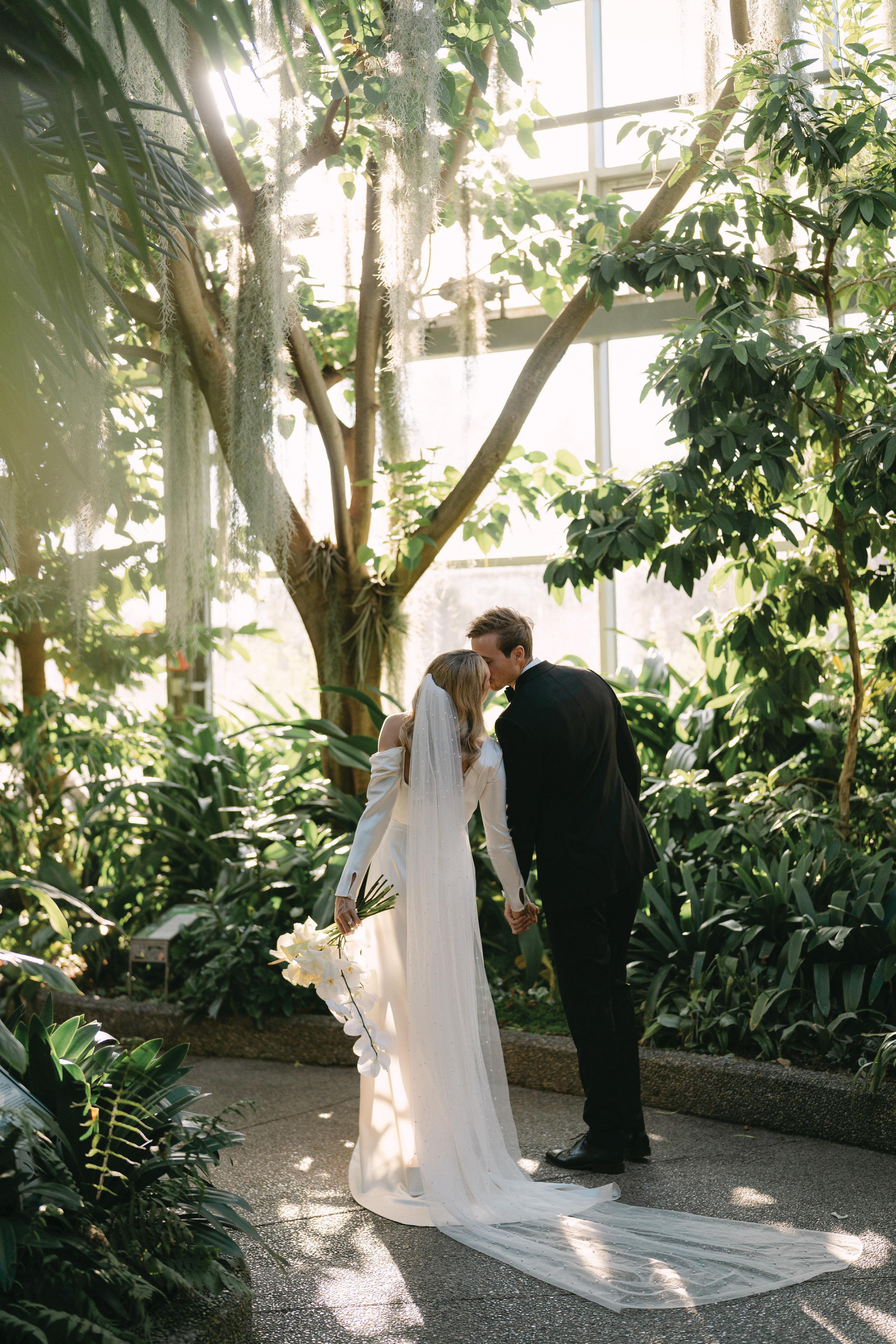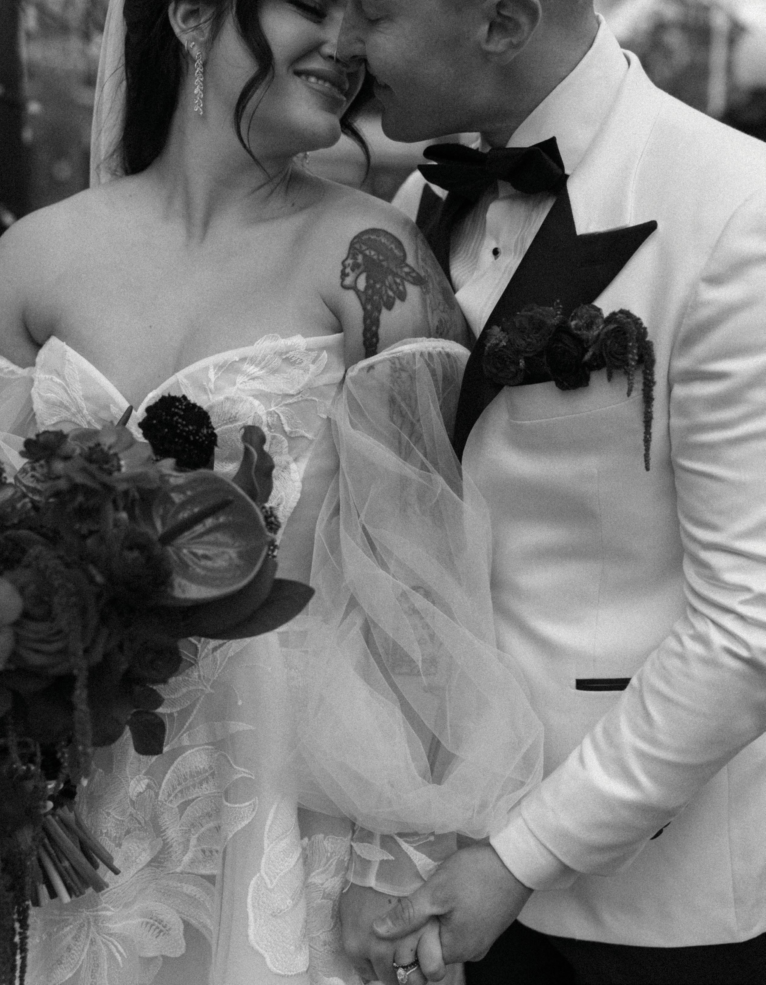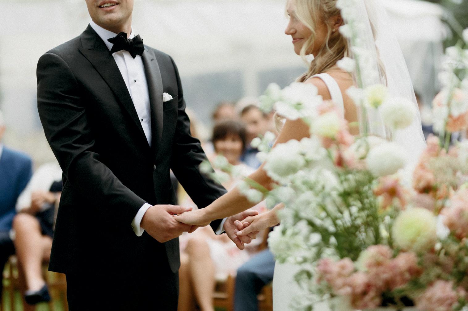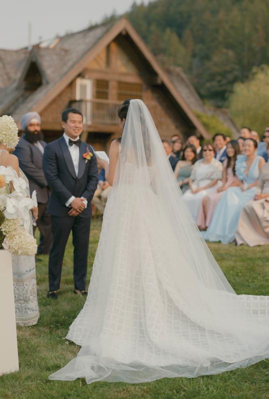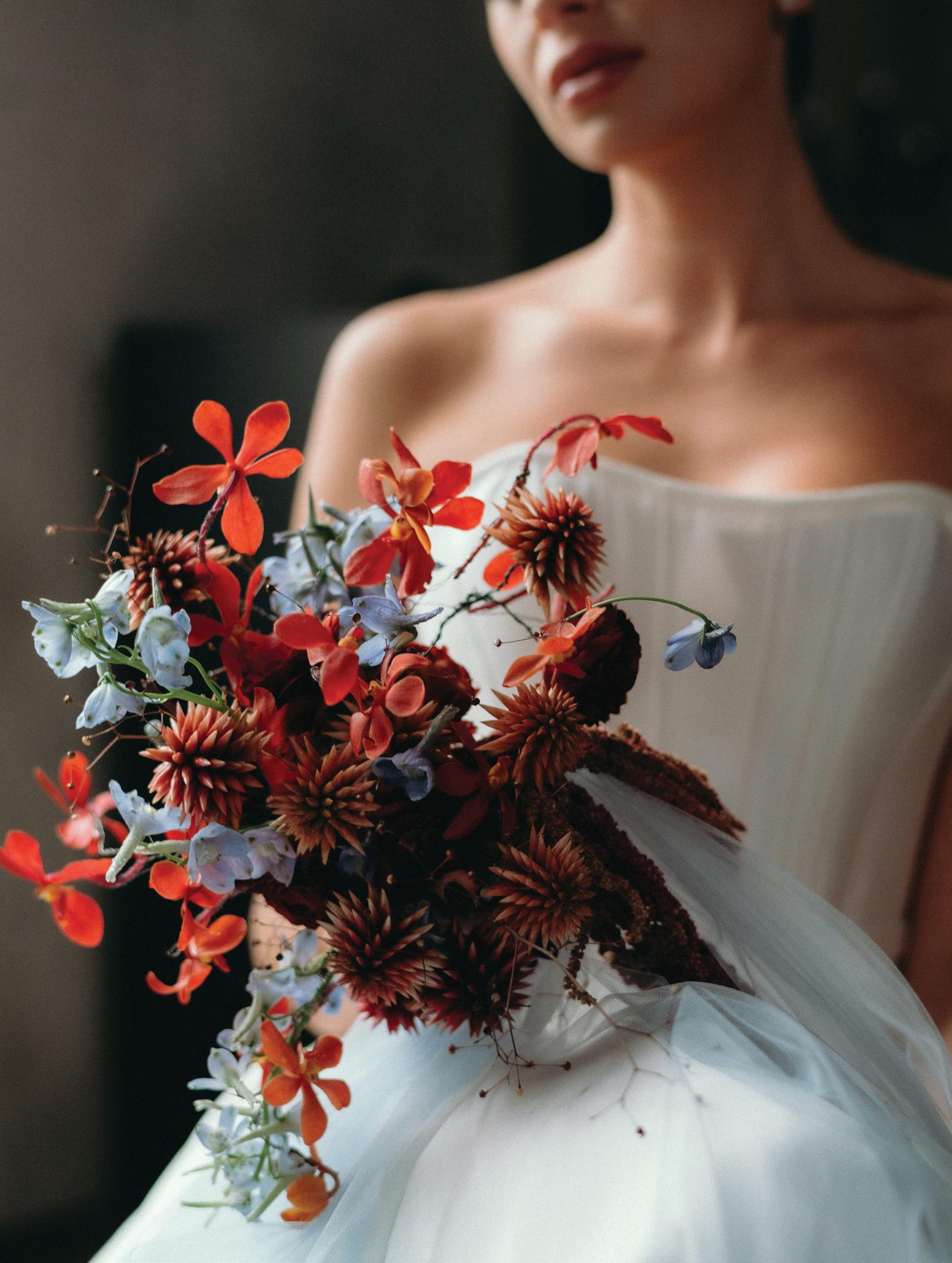 The bride, styled with high fashion in mind, wore a structured strapless gown from FLOURE, paired with a two-tier veil by Jane Rhyan The Collection and sleek Amina Muaddi heels. Her bouquet, a sculptural mix of Mokara orchids, amaranth, ranunculus and delphinium, was both bold and whimsical, bursting with unexpected texture and colour. Meanwhile, the groom’s classic black tux provided a crisp contrast to the ceremony setup.