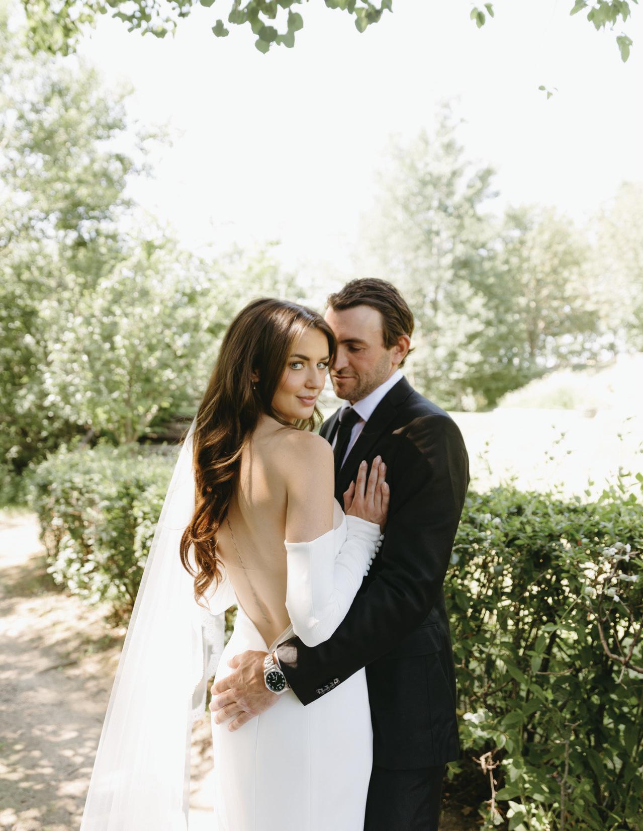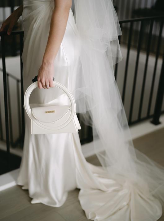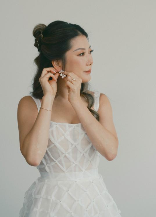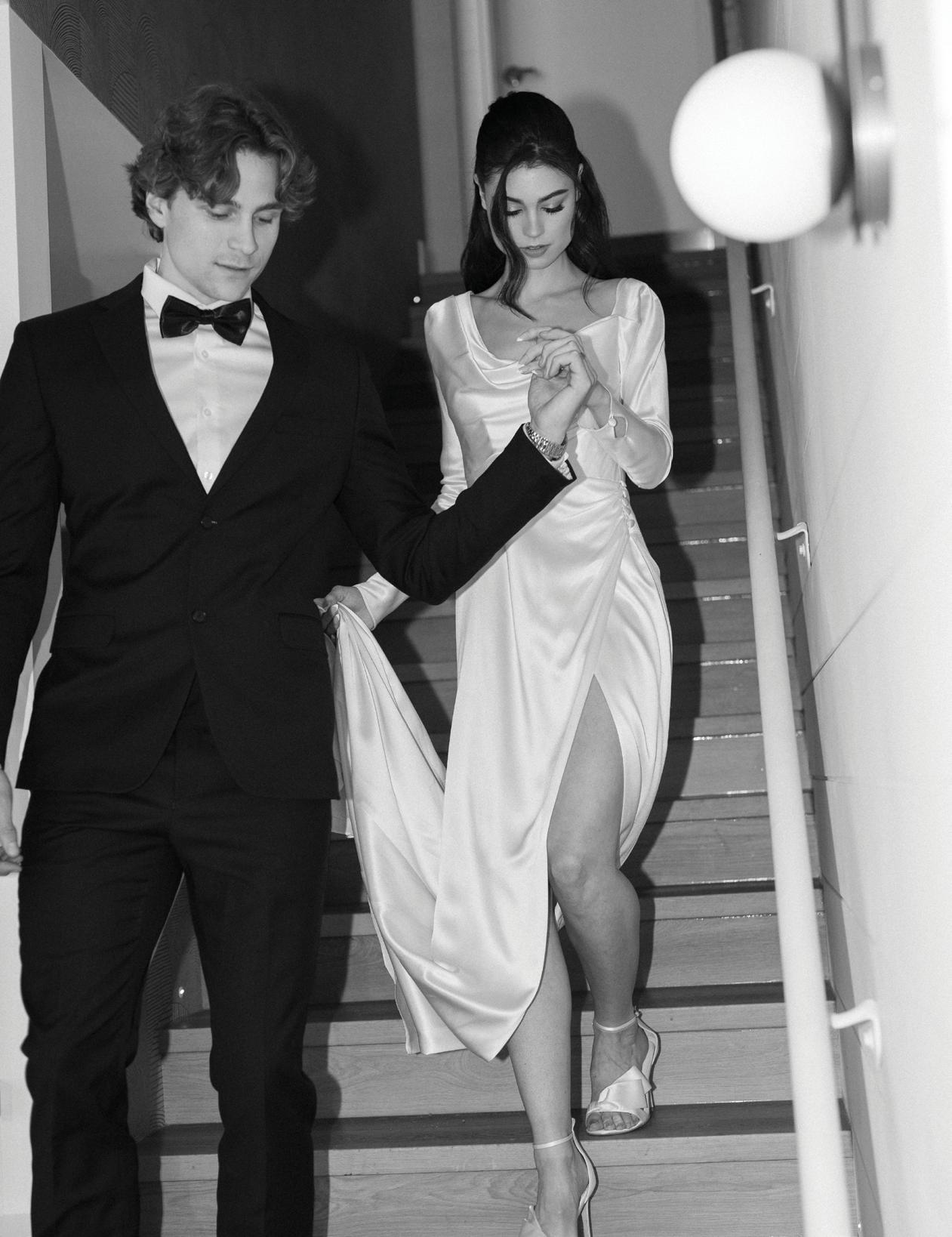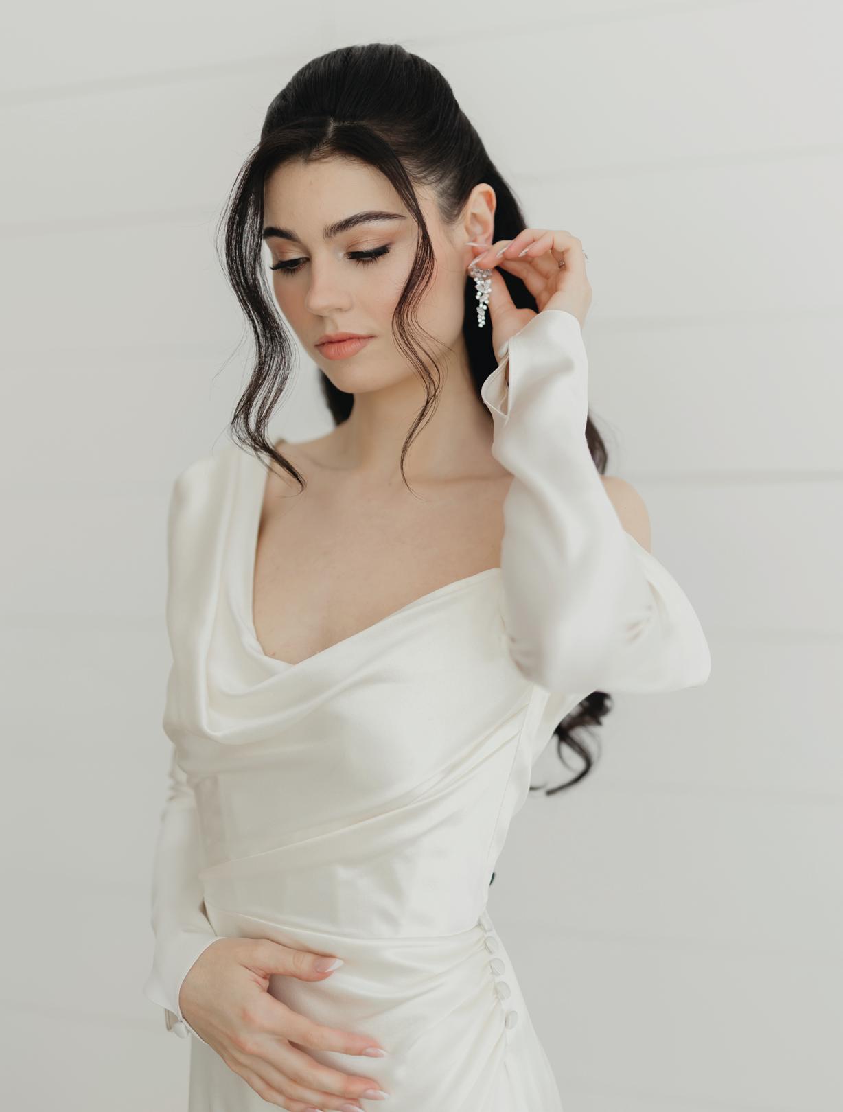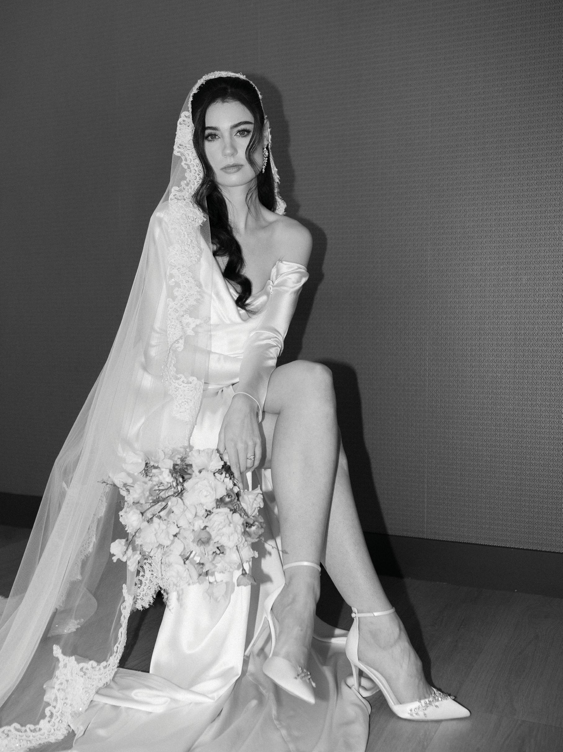 The bride was styled in the ‘Jules’ gown by Katherine Tash, sourced from Blush & Raven. The figure-skimming silhouette was crafted from soft silk satin crepe, featuring long sleeves, an asymmetrical neckline and a high leg opening. Designed to feel as if it had gently slipped off the shoulder, the gown’s delicate draping and side button closure created graceful movement. A wispy lace veil from Untamed Petals and dainty accessories from Blessings Bridal Accessories brought in a little romance, while pointed-toe heels by Bella Belle Shoes gave the look a contemporary edge.