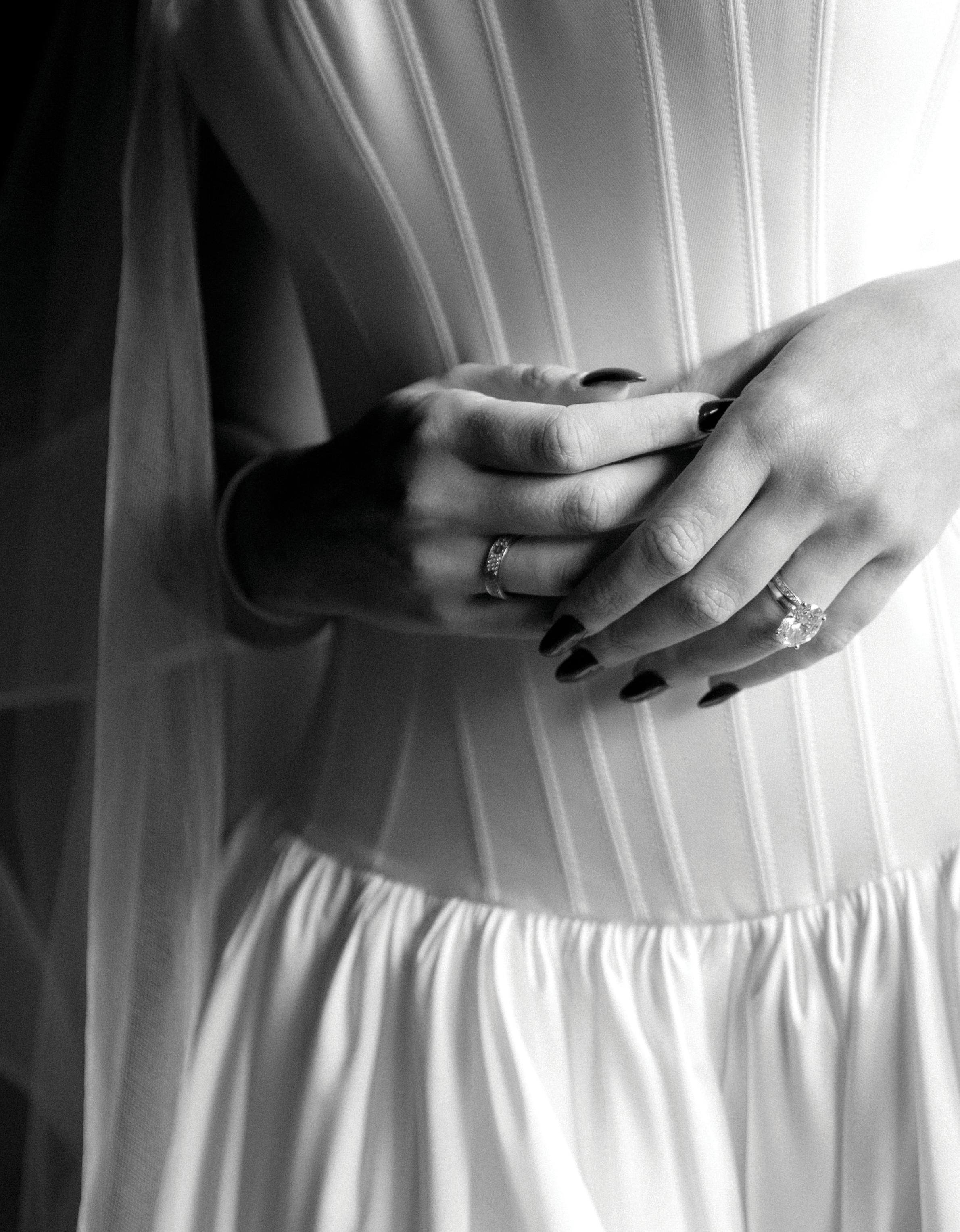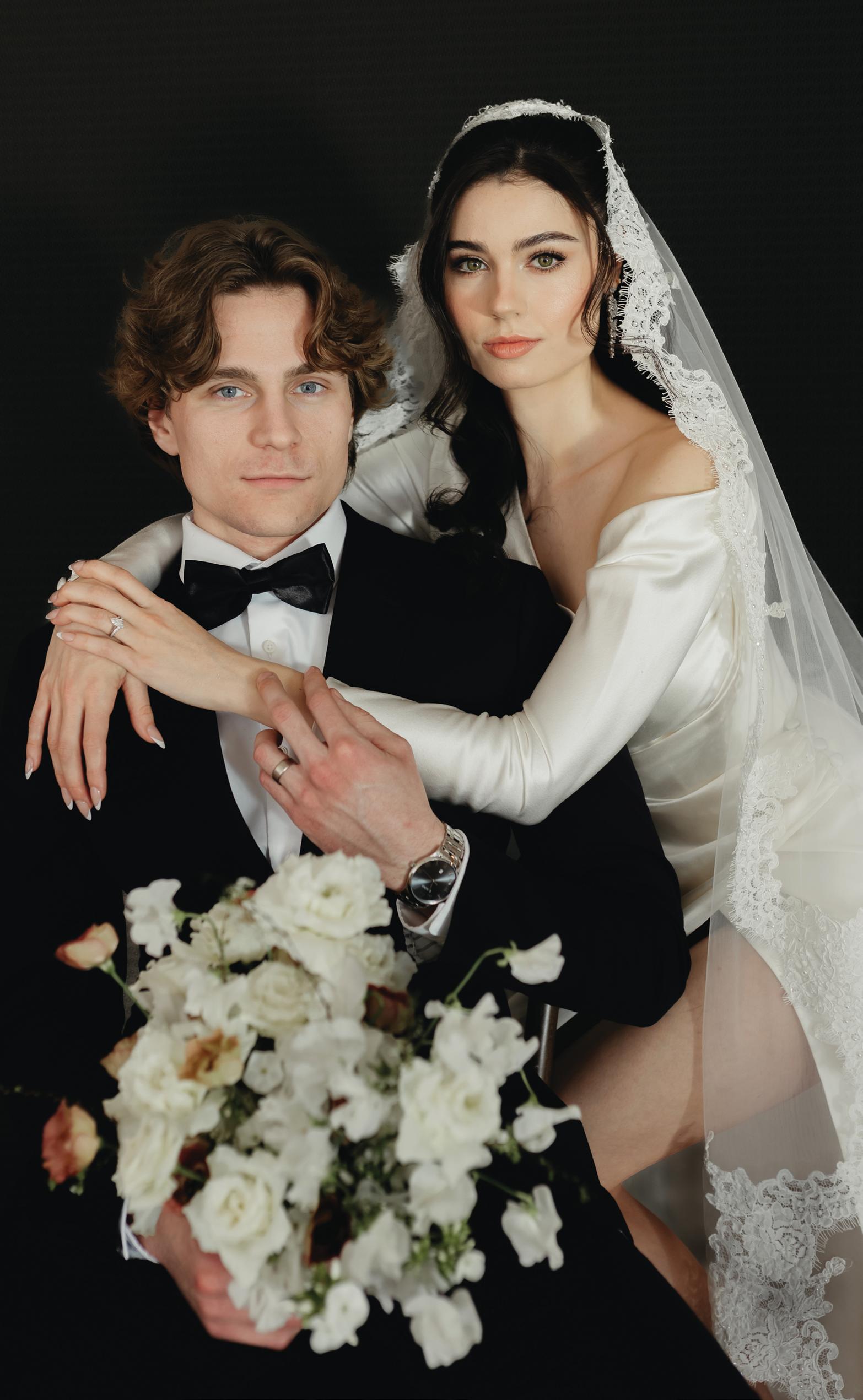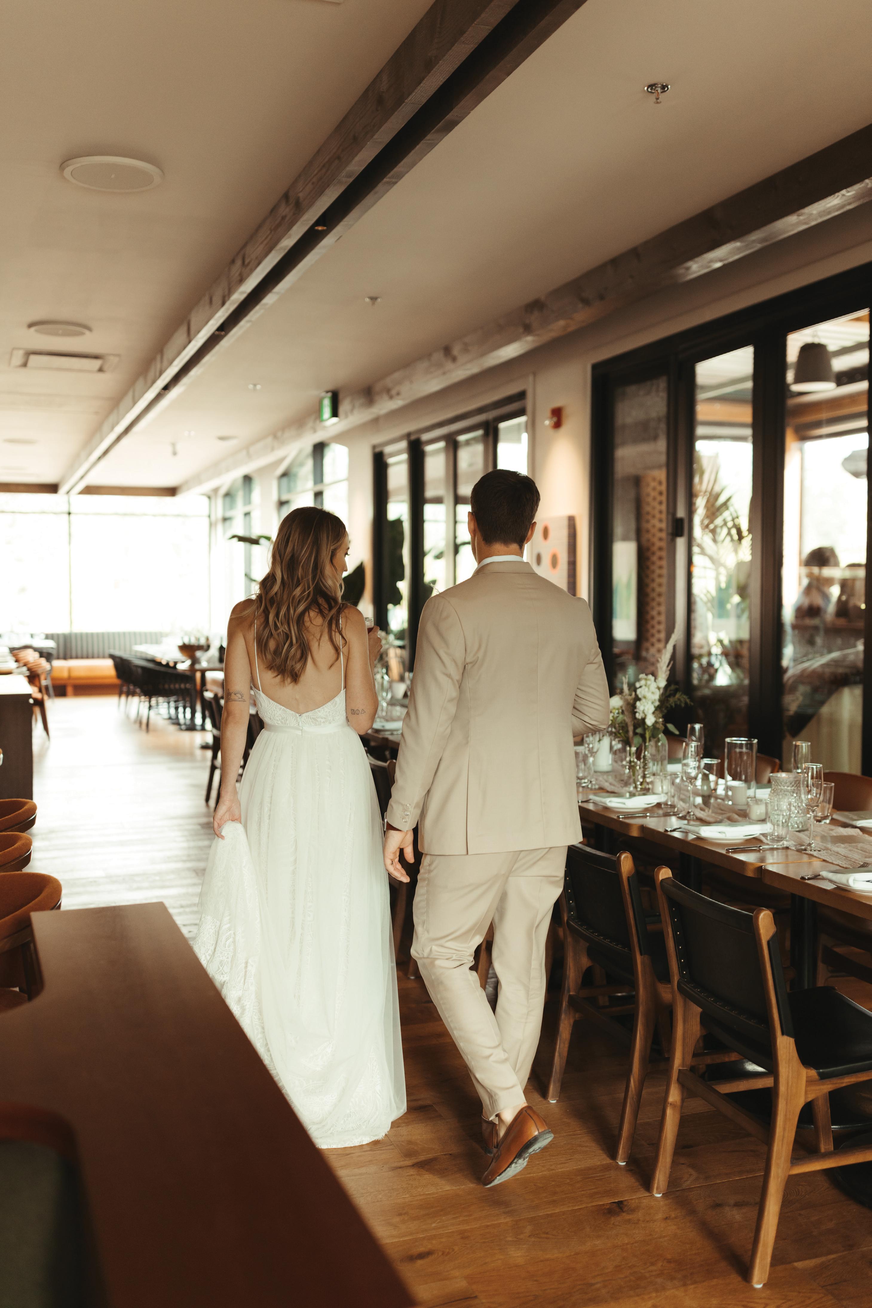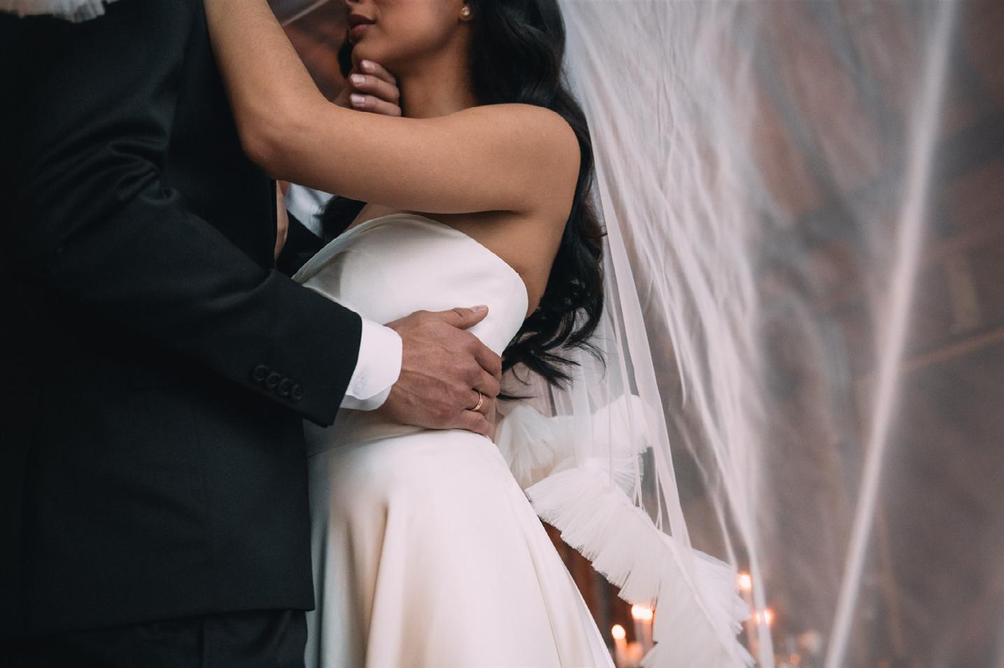 The bride was styled in the ‘Jules’ gown by Katherine Tash, sourced from Blush & Raven. The figure-skimming silhouette was crafted from soft silk satin crepe, featuring long sleeves, an asymmetrical neckline and a high leg opening. Designed to feel as if it had gently slipped off the shoulder, the gown’s delicate draping and side button closure created graceful movement. A wispy lace veil from Untamed Petals and dainty accessories from Blessings Bridal Accessories brought in a little romance, while pointed-toe heels by Bella Belle Shoes gave the look a contemporary edge.