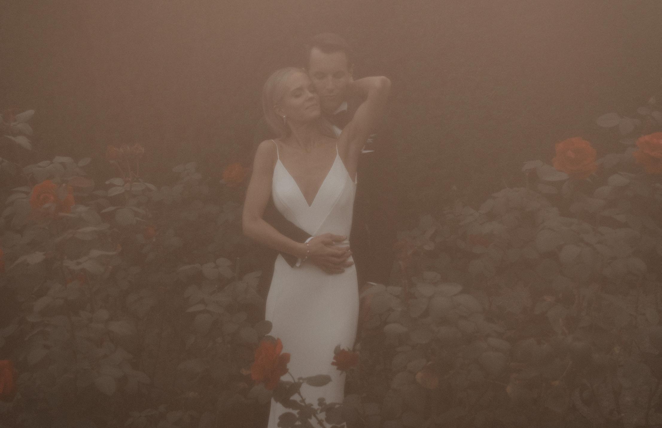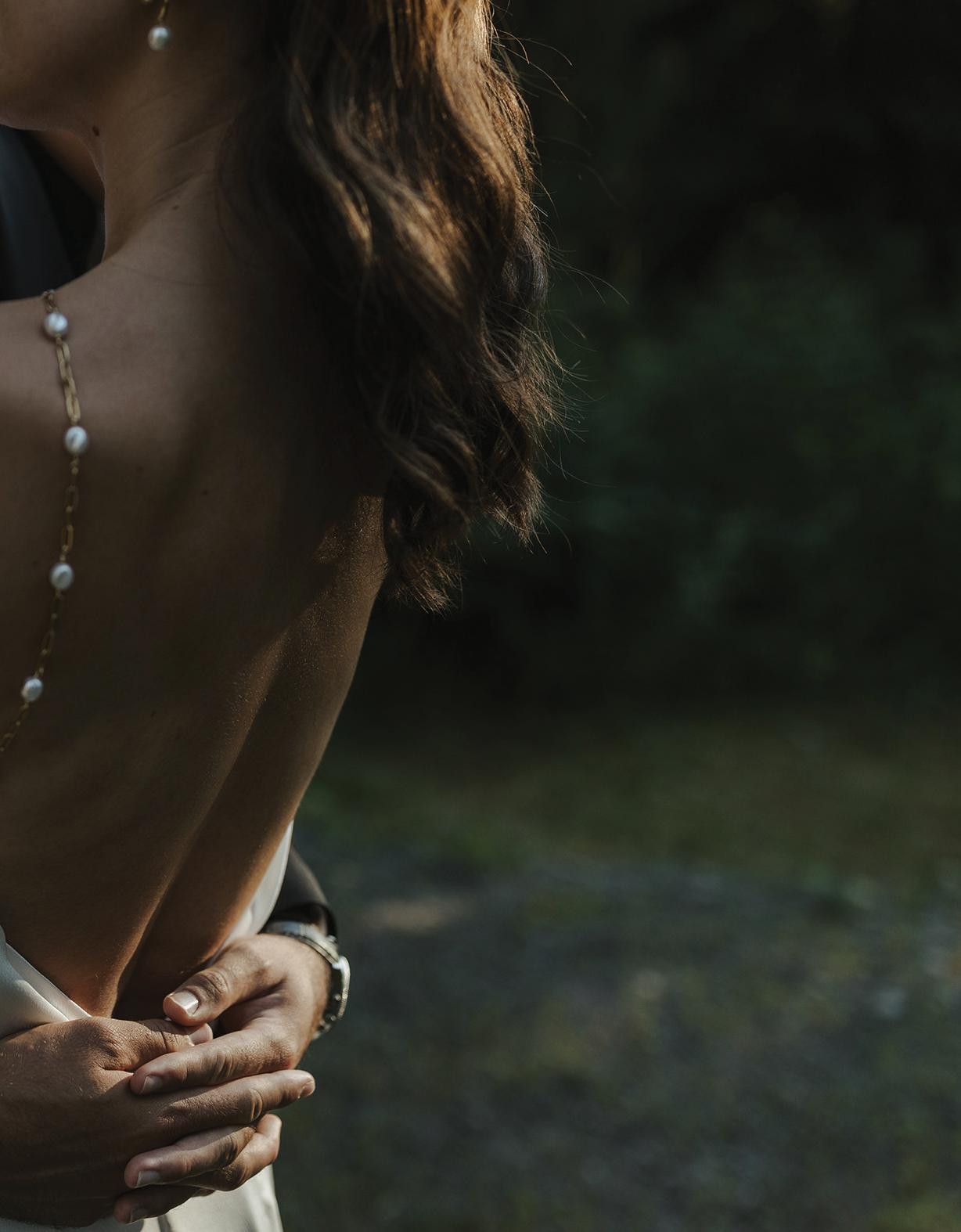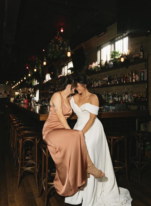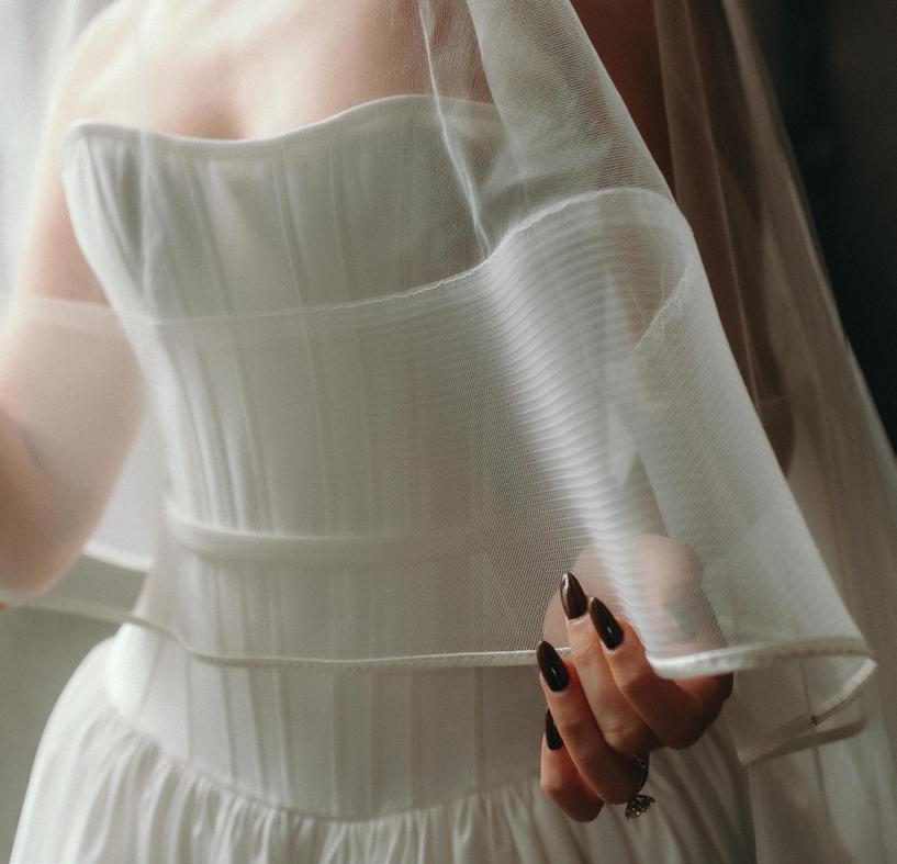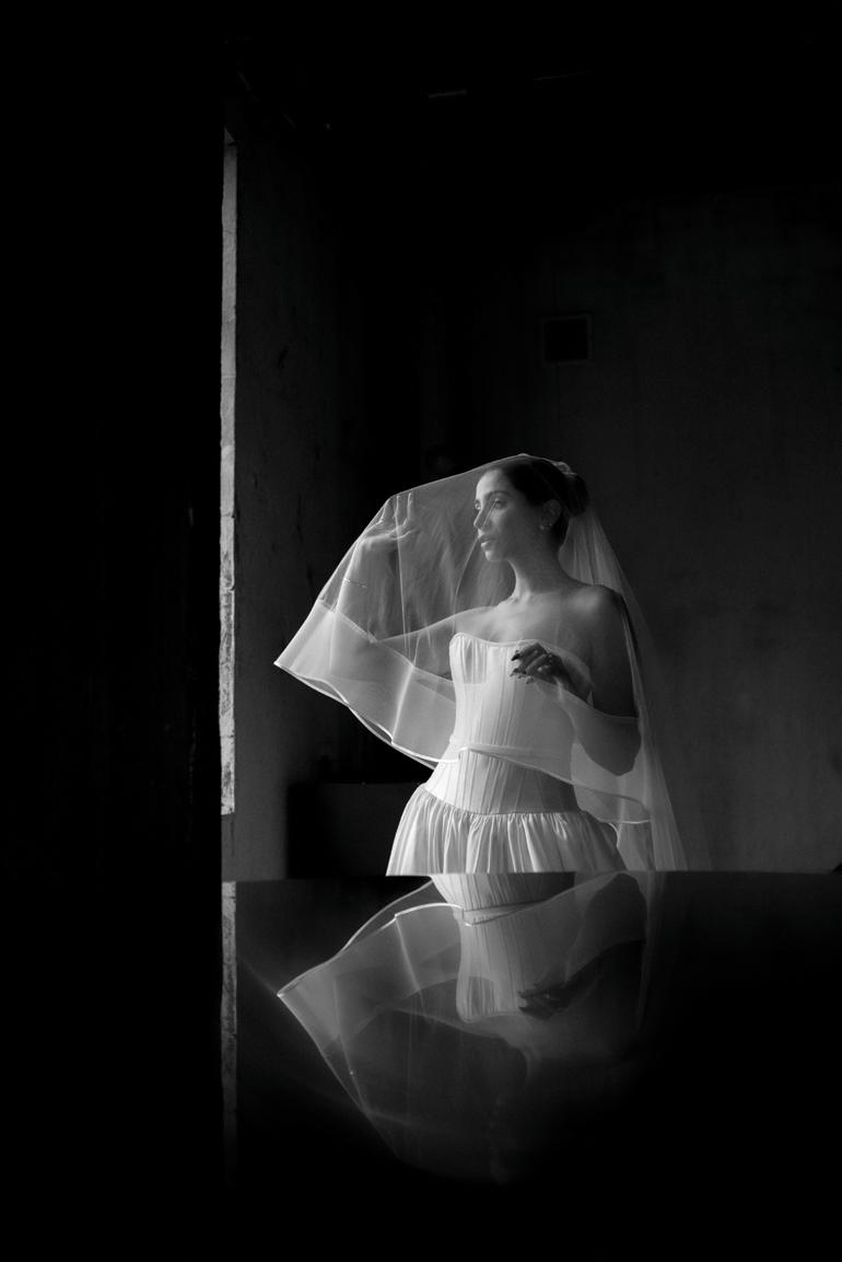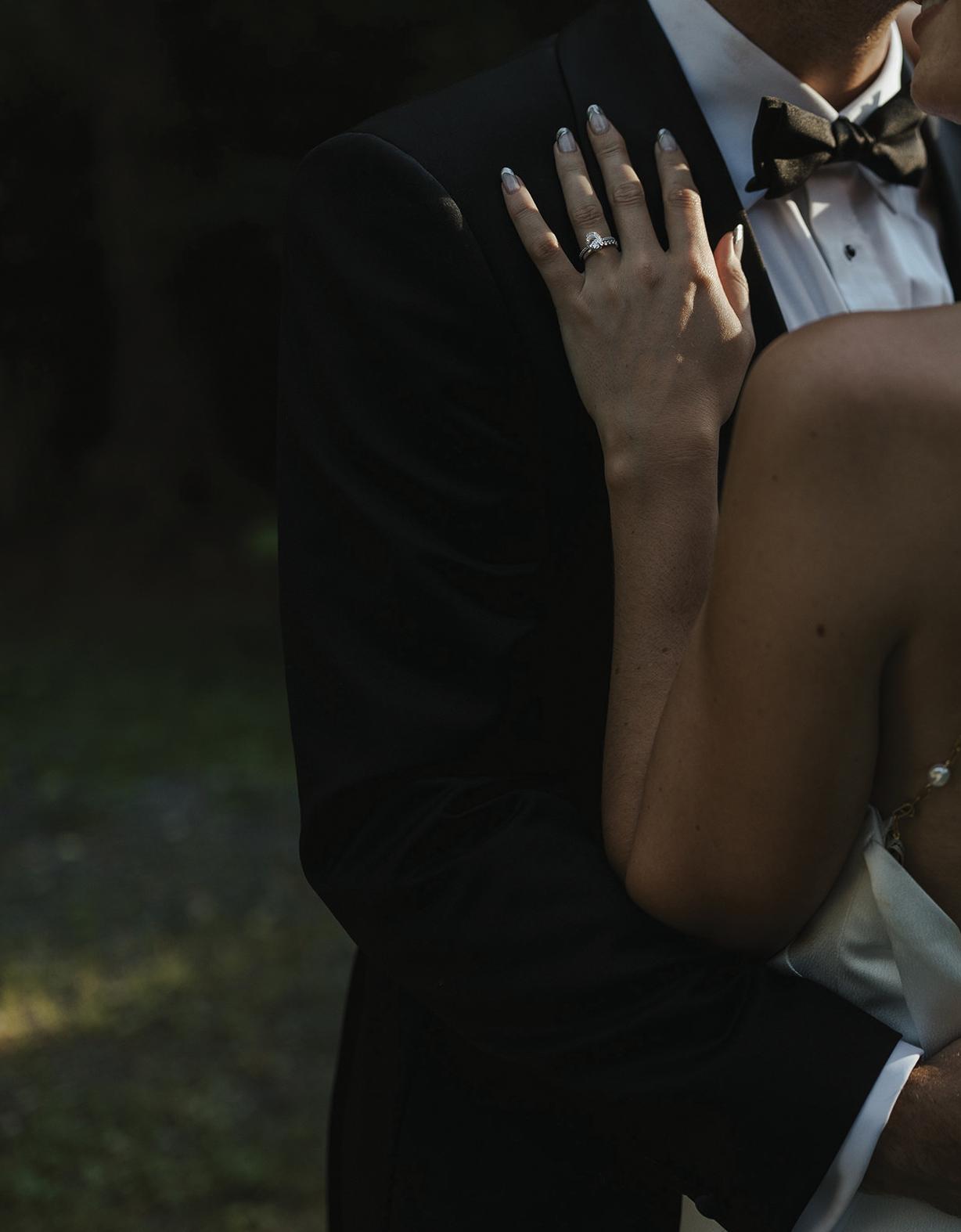 The bride was styled in the ‘Jules’ gown by Katherine Tash, sourced from Blush & Raven. The figure-skimming silhouette was crafted from soft silk satin crepe, featuring long sleeves, an asymmetrical neckline and a high leg opening. Designed to feel as if it had gently slipped off the shoulder, the gown’s delicate draping and side button closure created graceful movement. A wispy lace veil from Untamed Petals and dainty accessories from Blessings Bridal Accessories brought in a little romance, while pointed-toe heels by Bella Belle Shoes gave the look a contemporary edge.