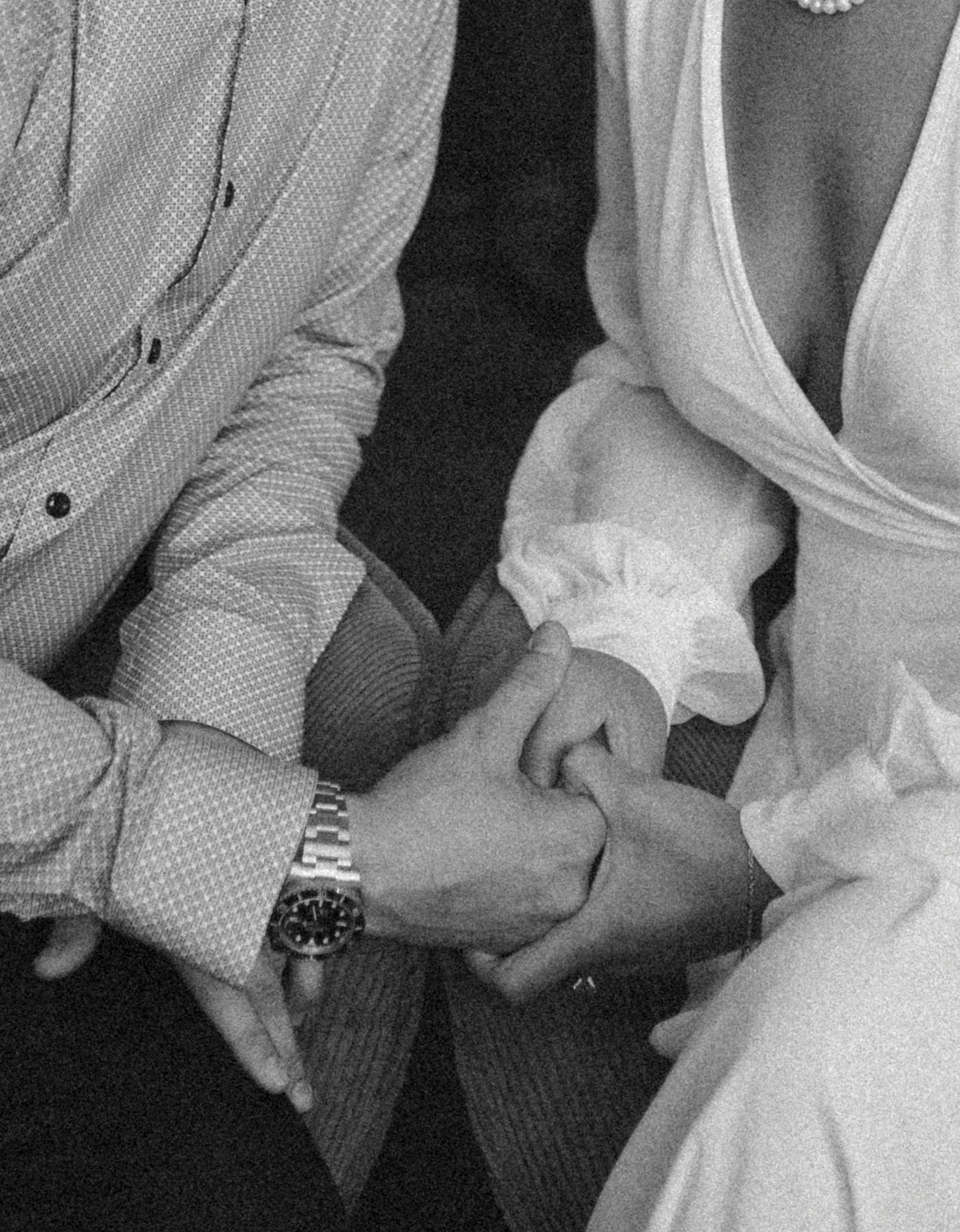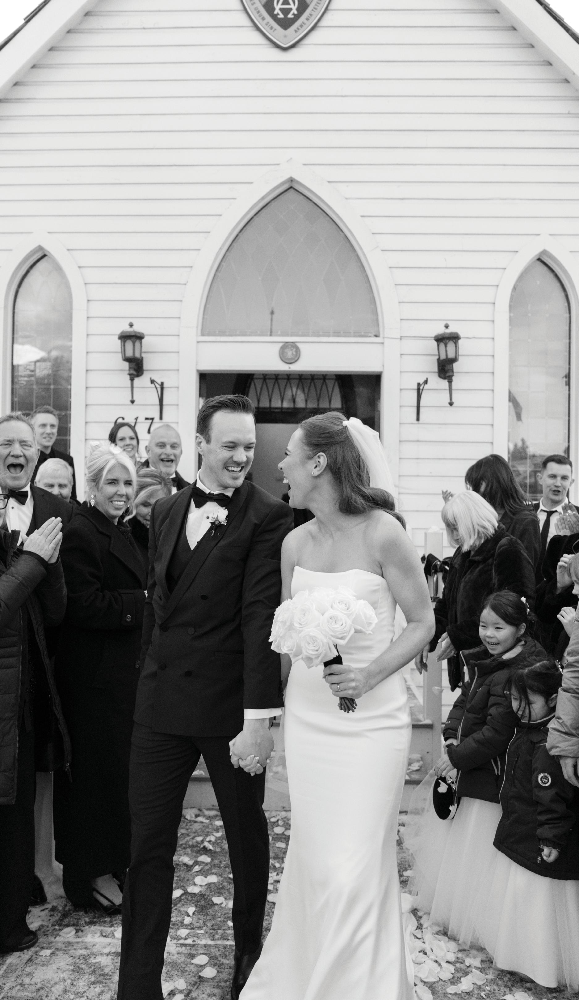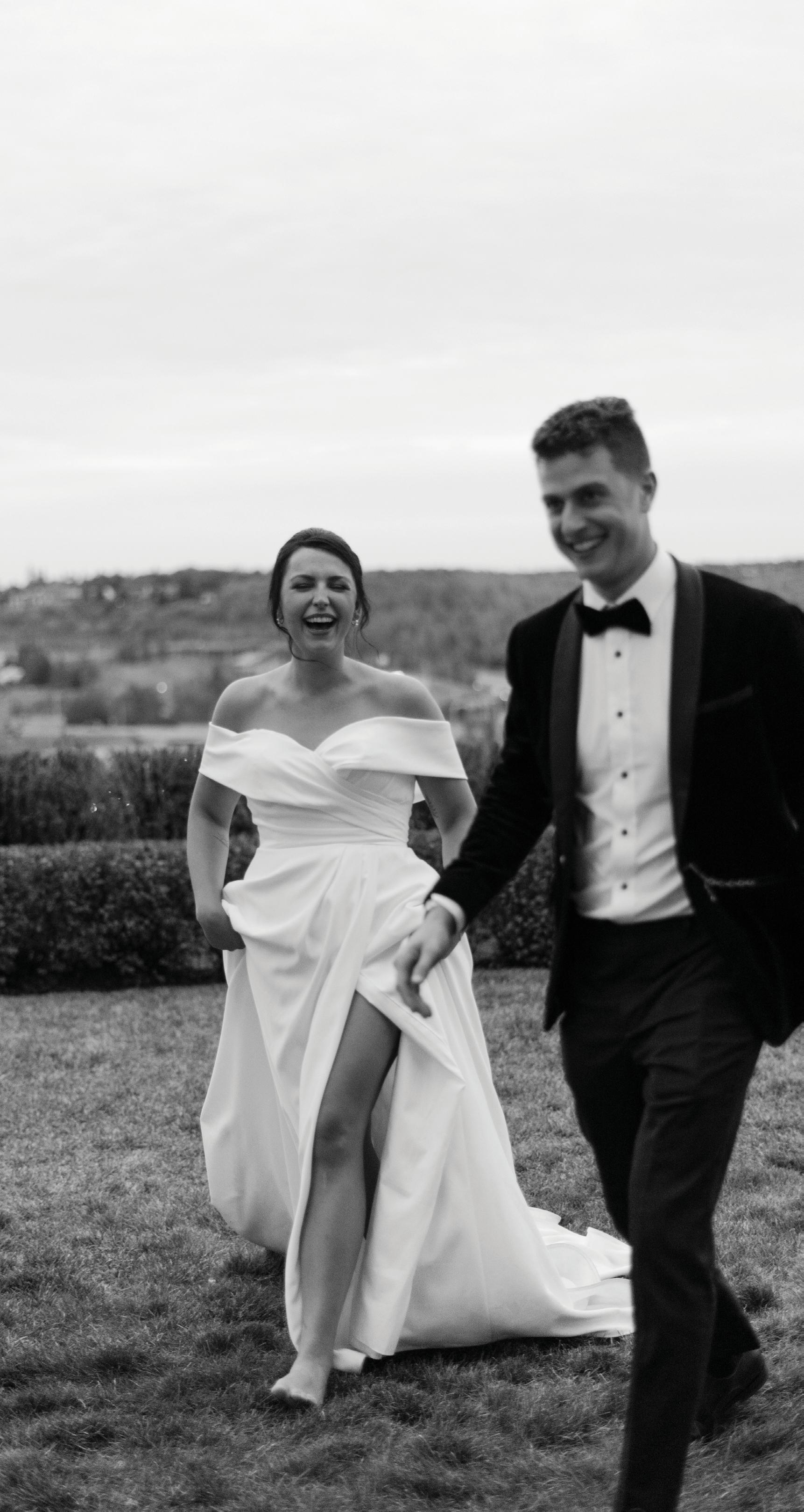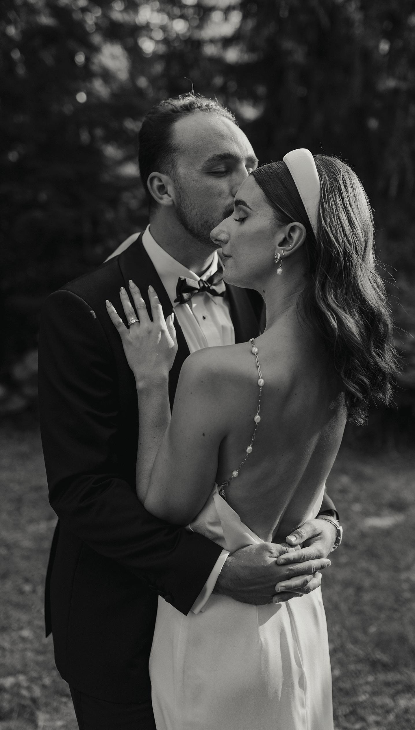 The bride was styled in the ‘Jules’ gown by Katherine Tash, sourced from Blush & Raven. The figure-skimming silhouette was crafted from soft silk satin crepe, featuring long sleeves, an asymmetrical neckline and a high leg opening. Designed to feel as if it had gently slipped off the shoulder, the gown’s delicate draping and side button closure created graceful movement. A wispy lace veil from Untamed Petals and dainty accessories from Blessings Bridal Accessories brought in a little romance, while pointed-toe heels by Bella Belle Shoes gave the look a contemporary edge.