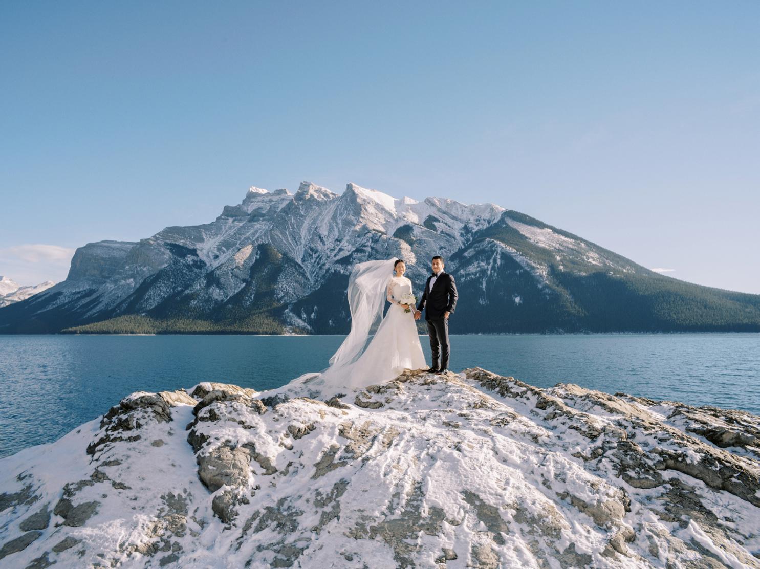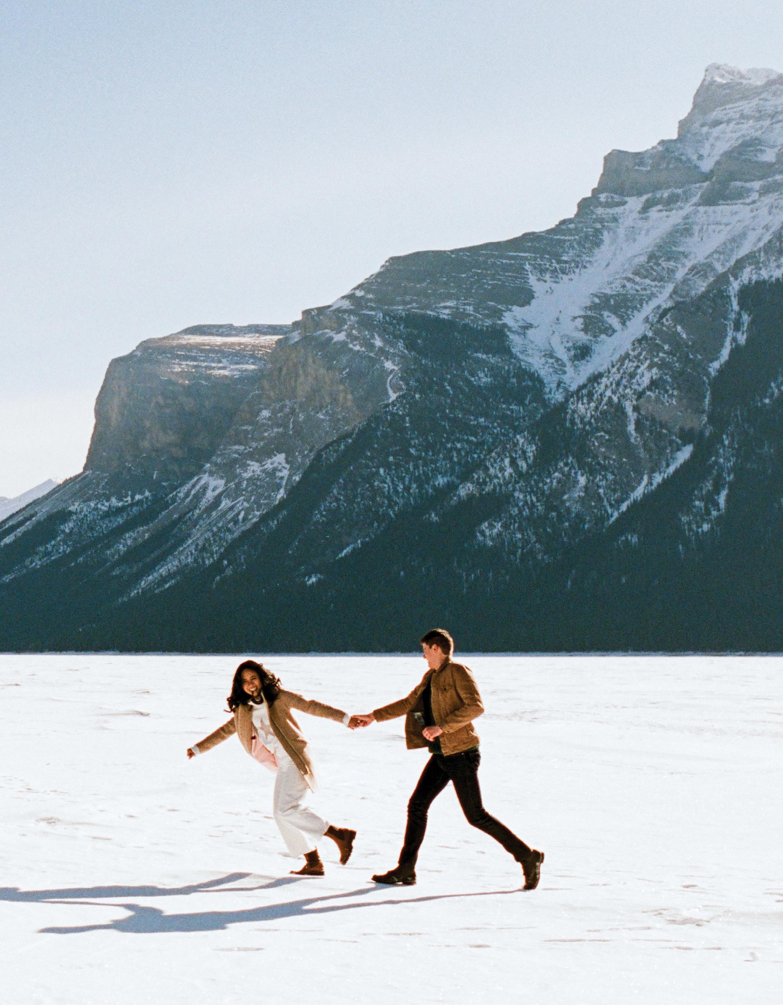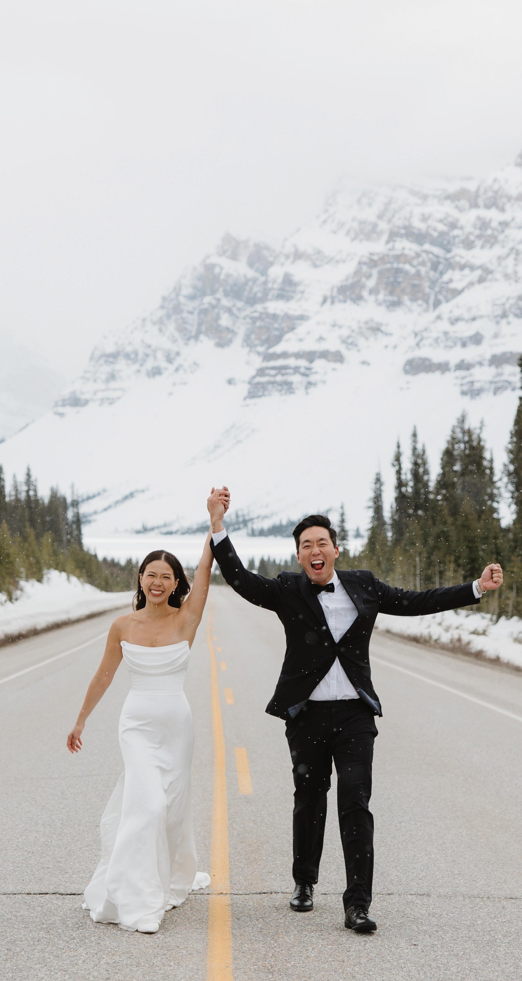 After the ceremony when we went to Peyto Lake for a photo. The trail up had really thick snow, so it was a bit challenging, but we just laughed the whole way up. It was such a fun, carefree moment. When we finally got to the top, it started snowing, which felt like such a beautiful blessing. In many cultures, snow on your wedding day is seen as a good omen, and it made the moment feel even more special.