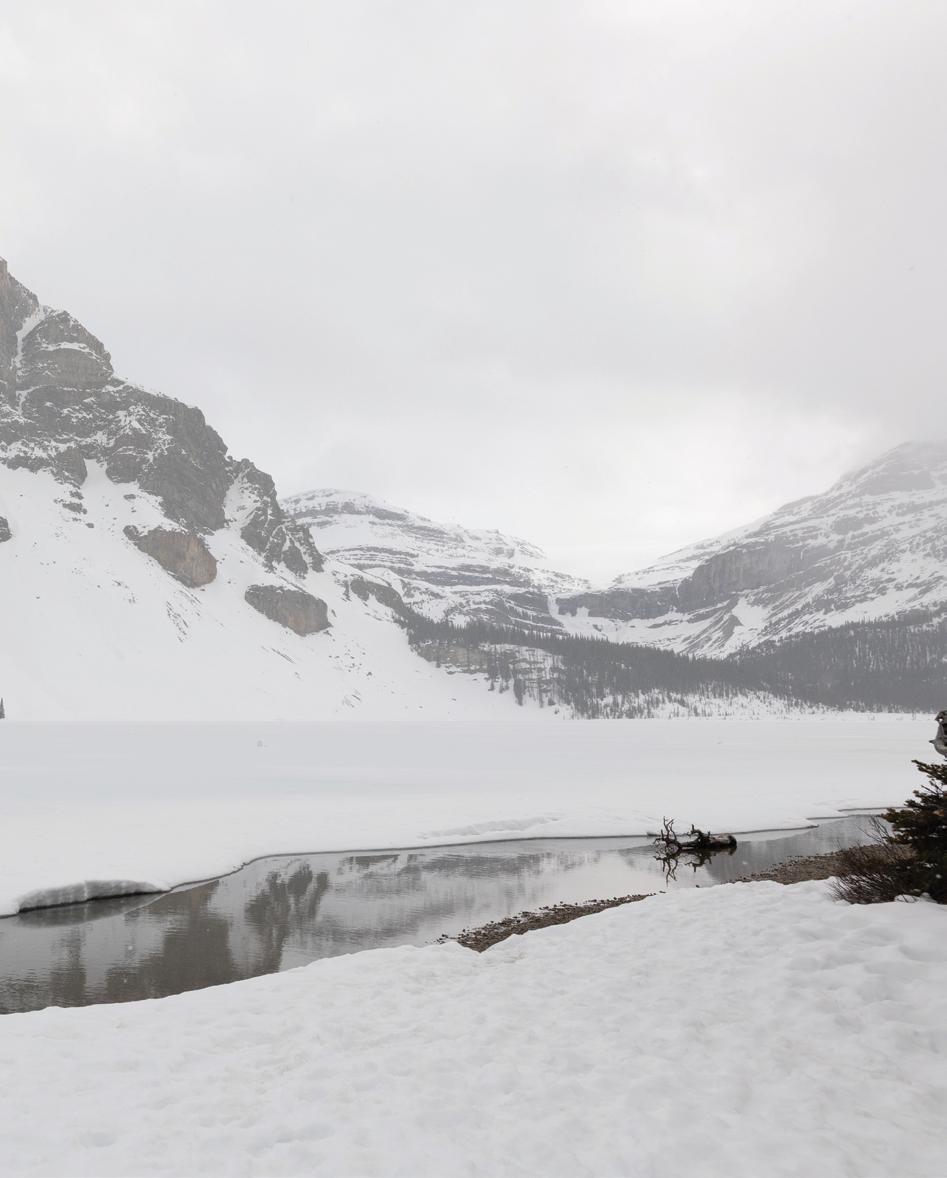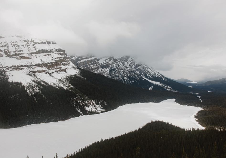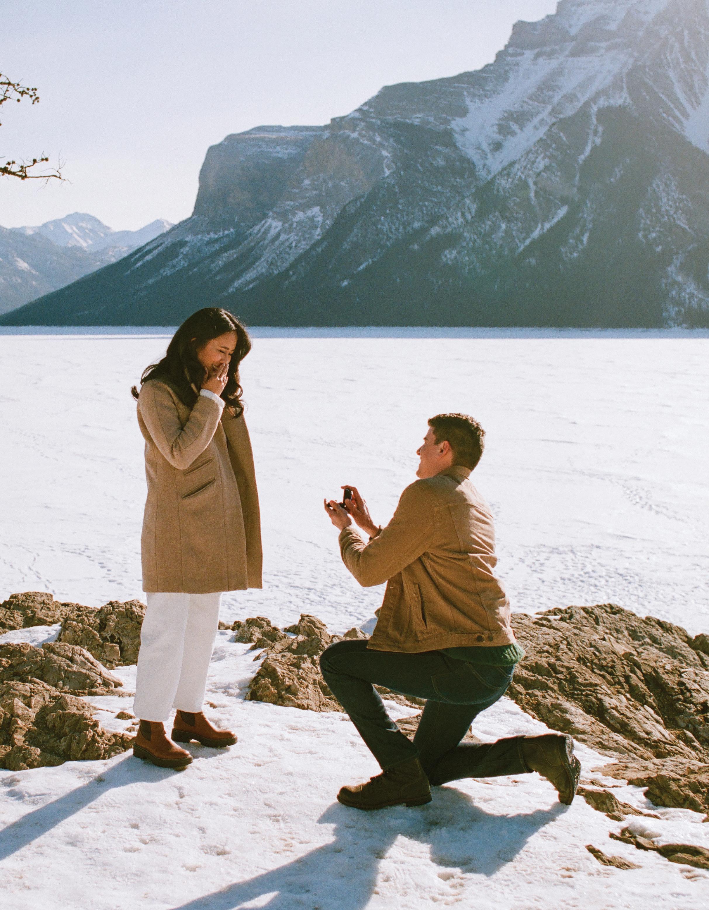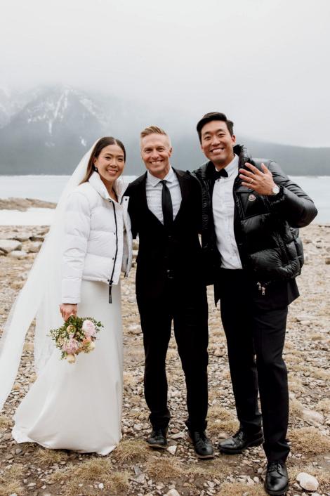 After the ceremony when we went to Peyto Lake for a photo. The trail up had really thick snow, so it was a bit challenging, but we just laughed the whole way up. It was such a fun, carefree moment. When we finally got to the top, it started snowing, which felt like such a beautiful blessing. In many cultures, snow on your wedding day is seen as a good omen, and it made the moment feel even more special.
