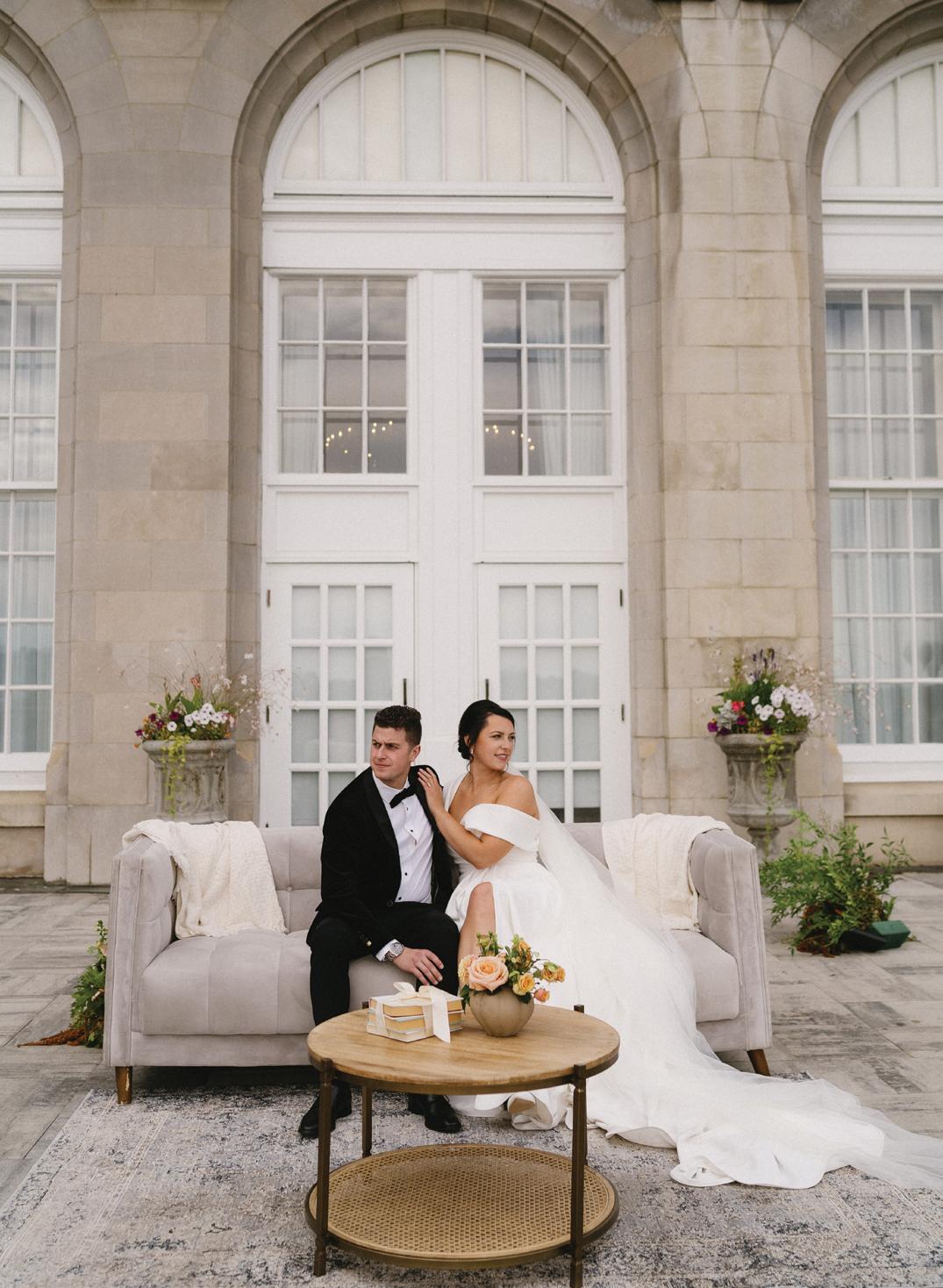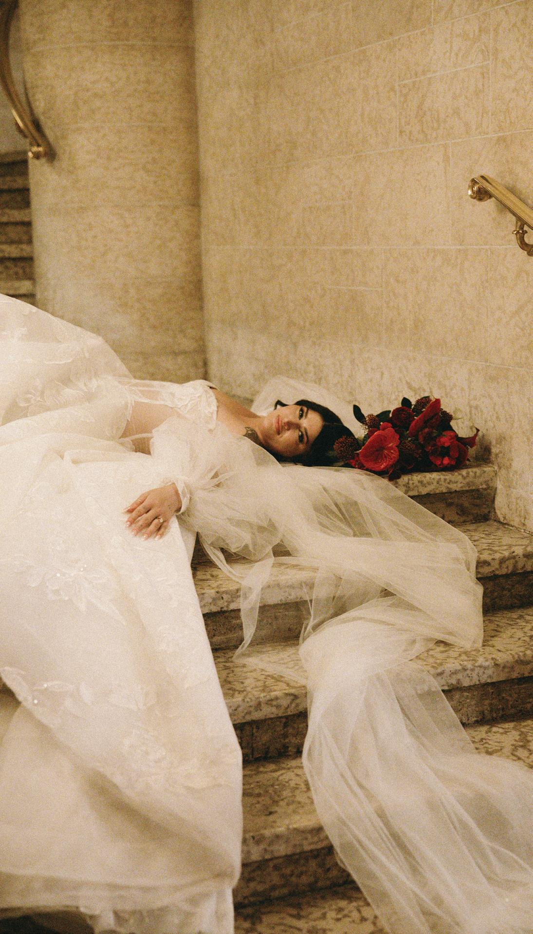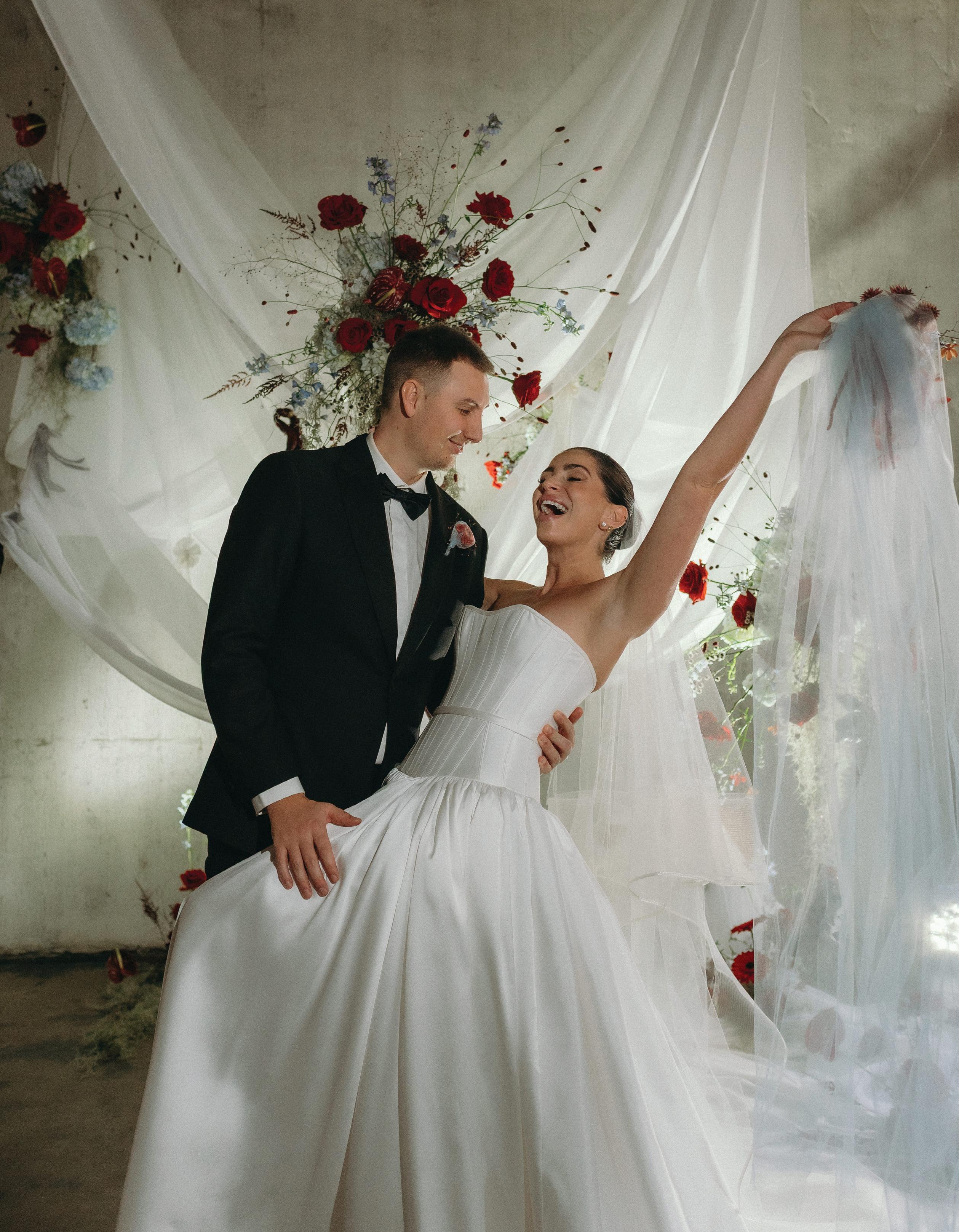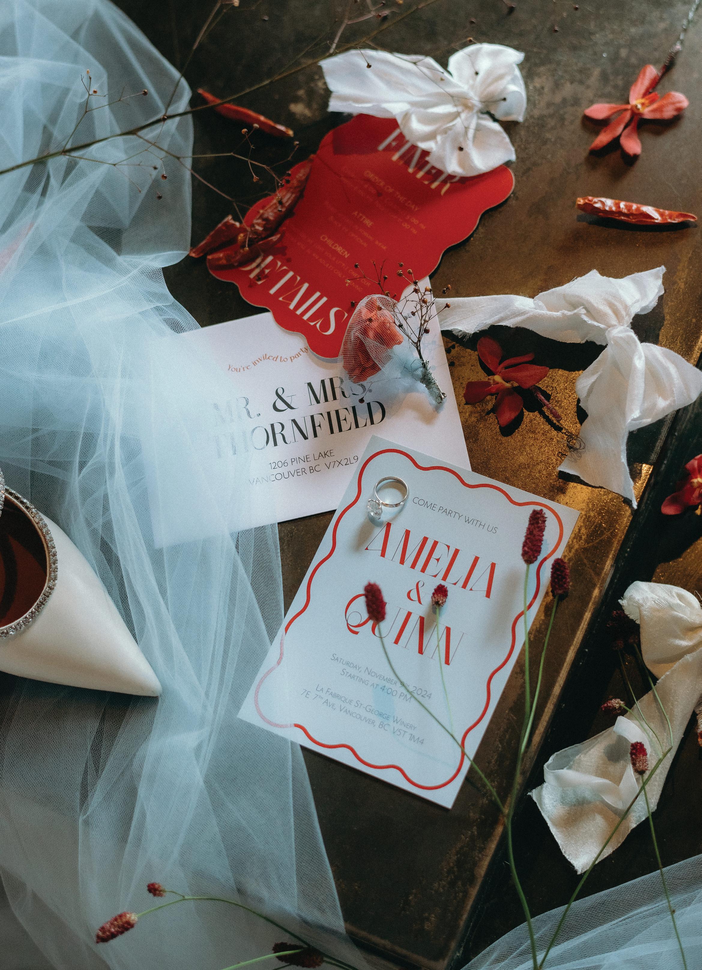 Planner Jodie Garneau of Thistle & Thorne Weddings teamed up with Sara Rogers Photography to create this stunning editorial that fused minimalism with maximalism. Set against the modern, industrial backdrop of La Fabrique St-George in Vancouver, the shoot embraced stark contrasts and layered textures. A timeless black and white palette was brought to life through flowing drapery, bold silhouettes and vivid pops of red and pastel blue. From the movement of sheer fabric to striking design choices, every element was chosen to balance softness with strength.