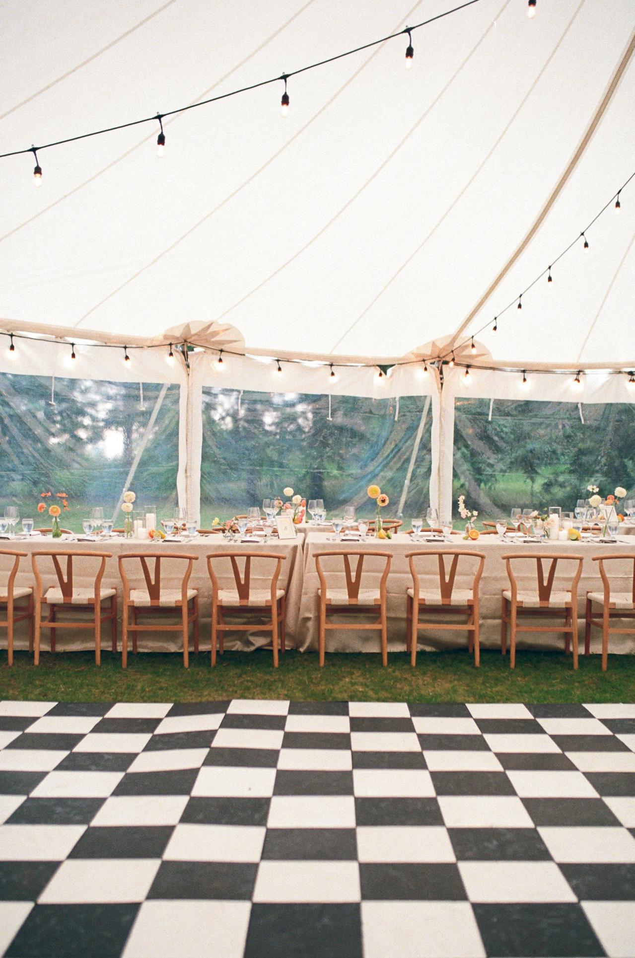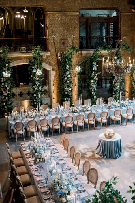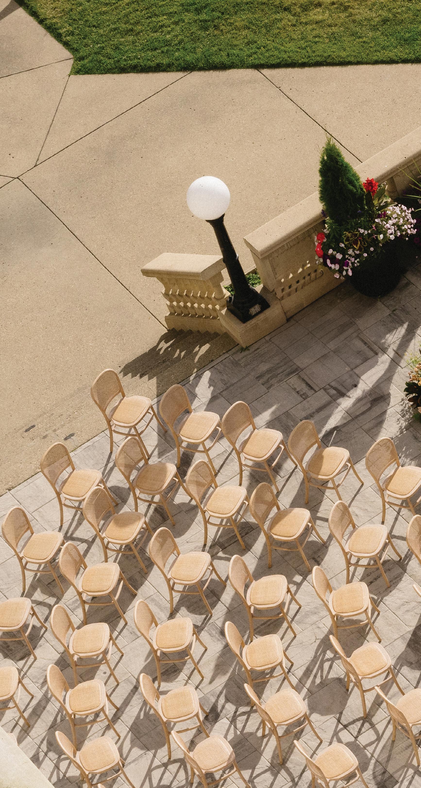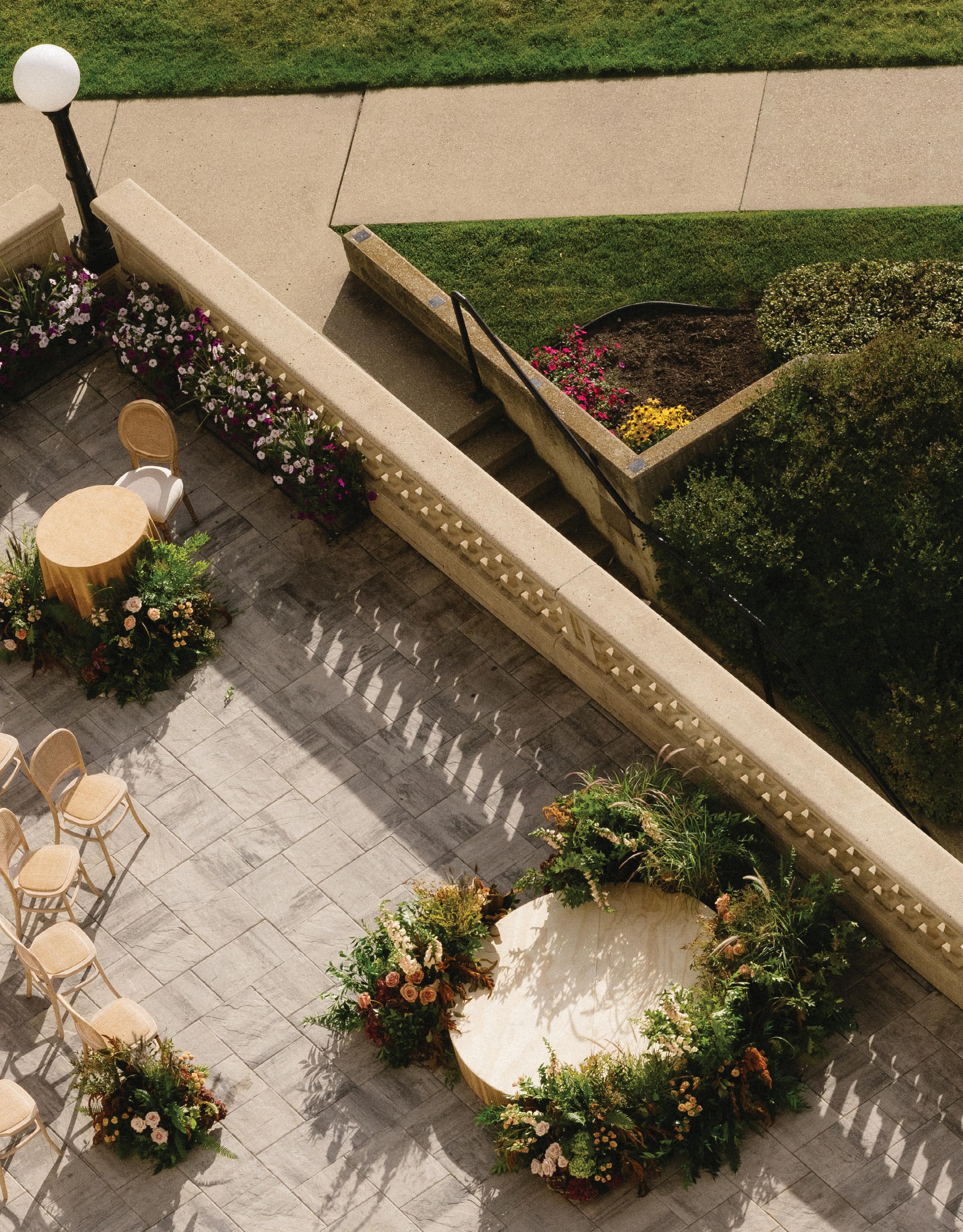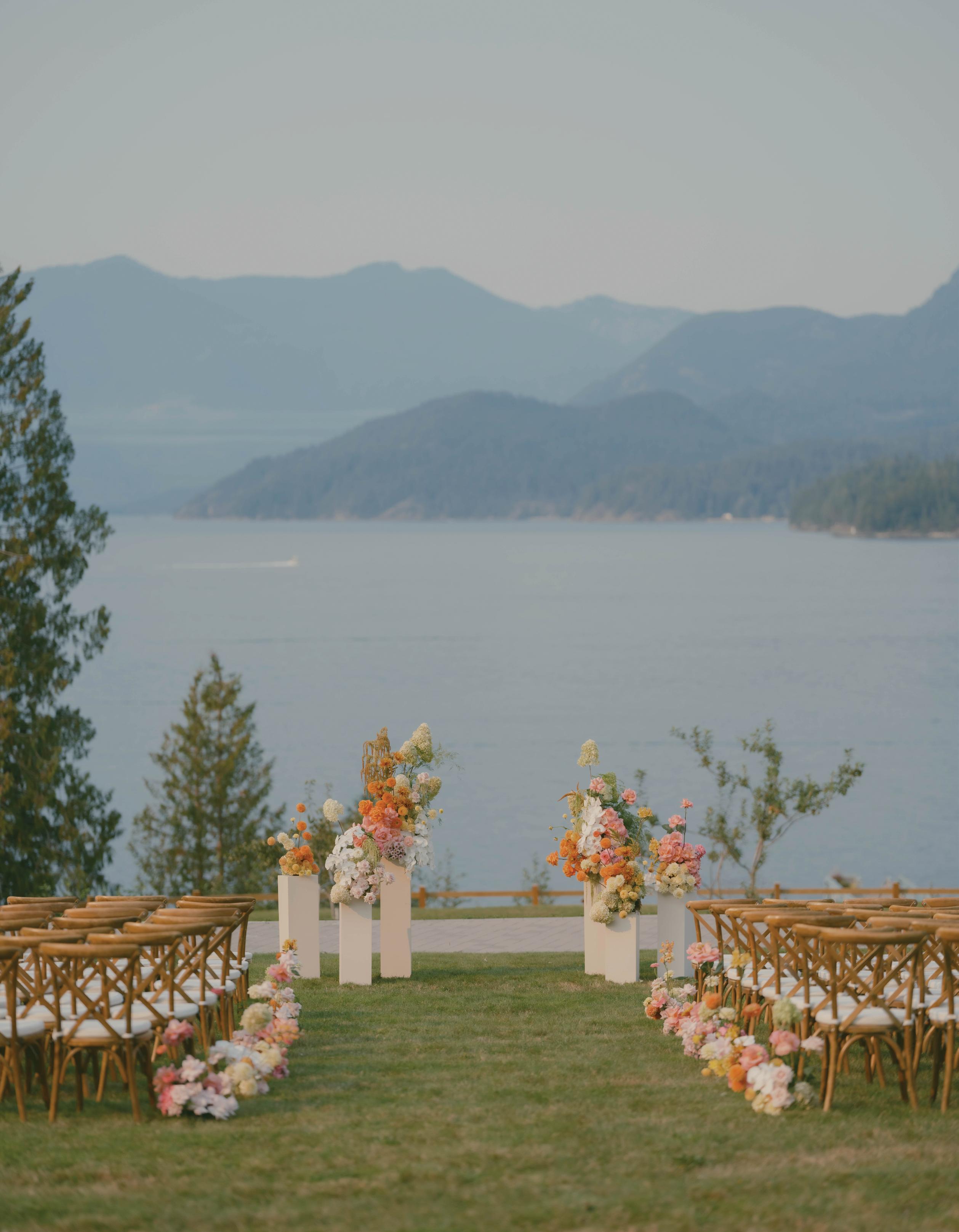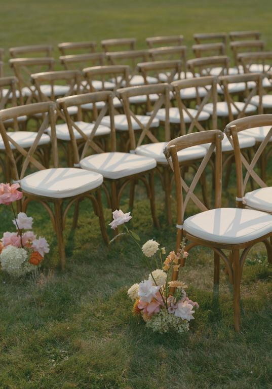 Rather than a traditional straight aisle, the team opted for an artistic, staggered seating arrangement that created an immersive path for the bride and groom to walk through.