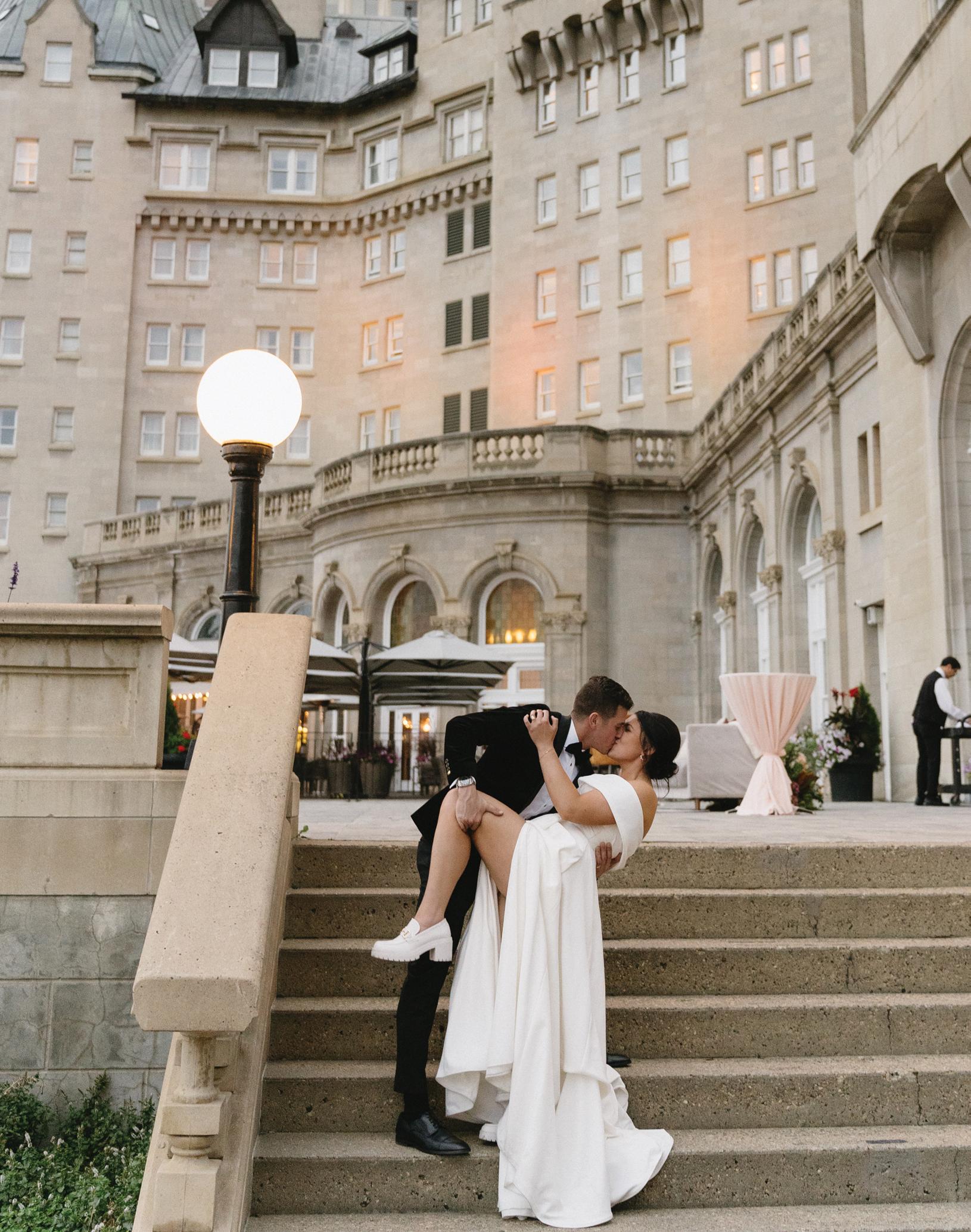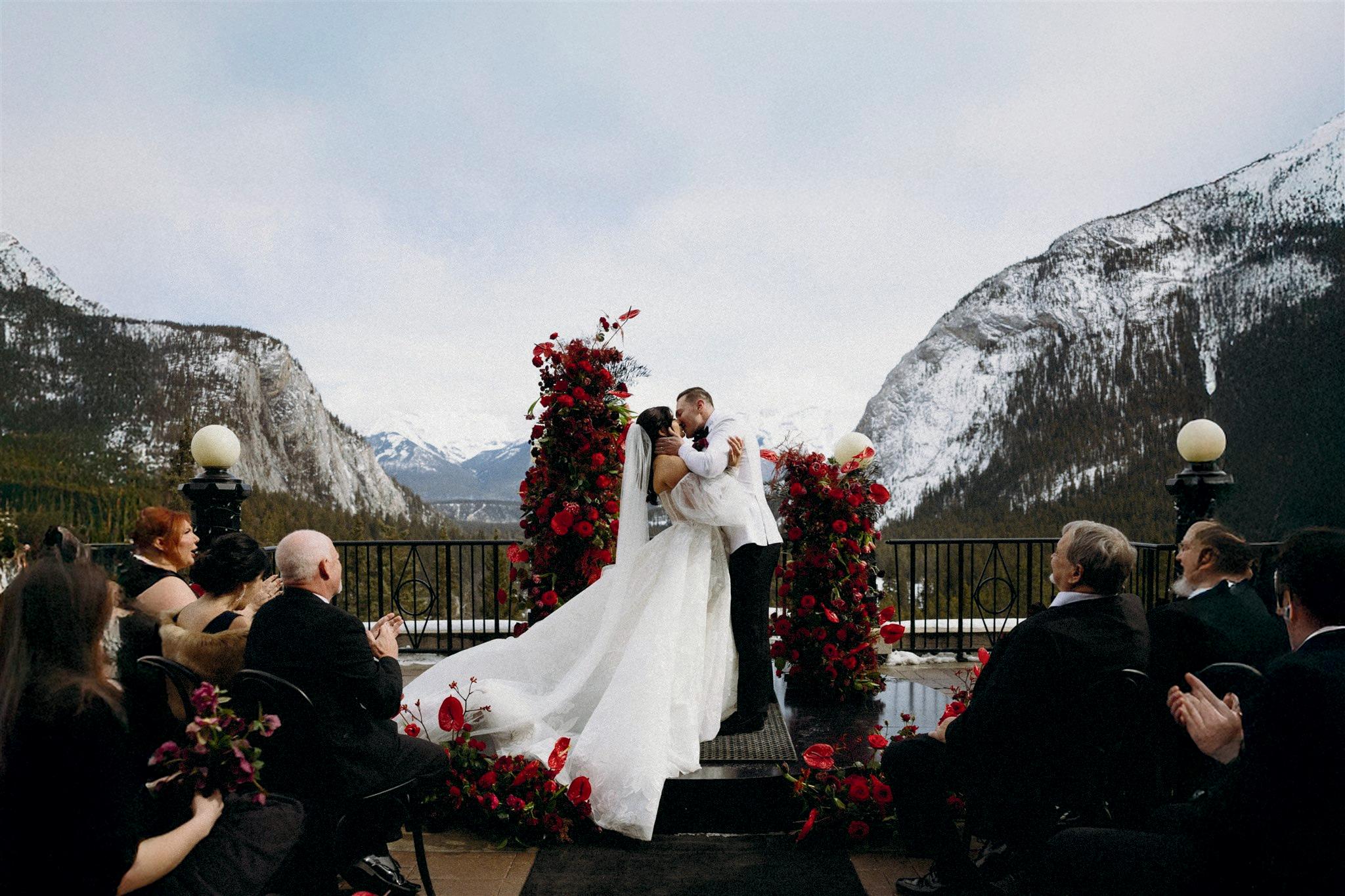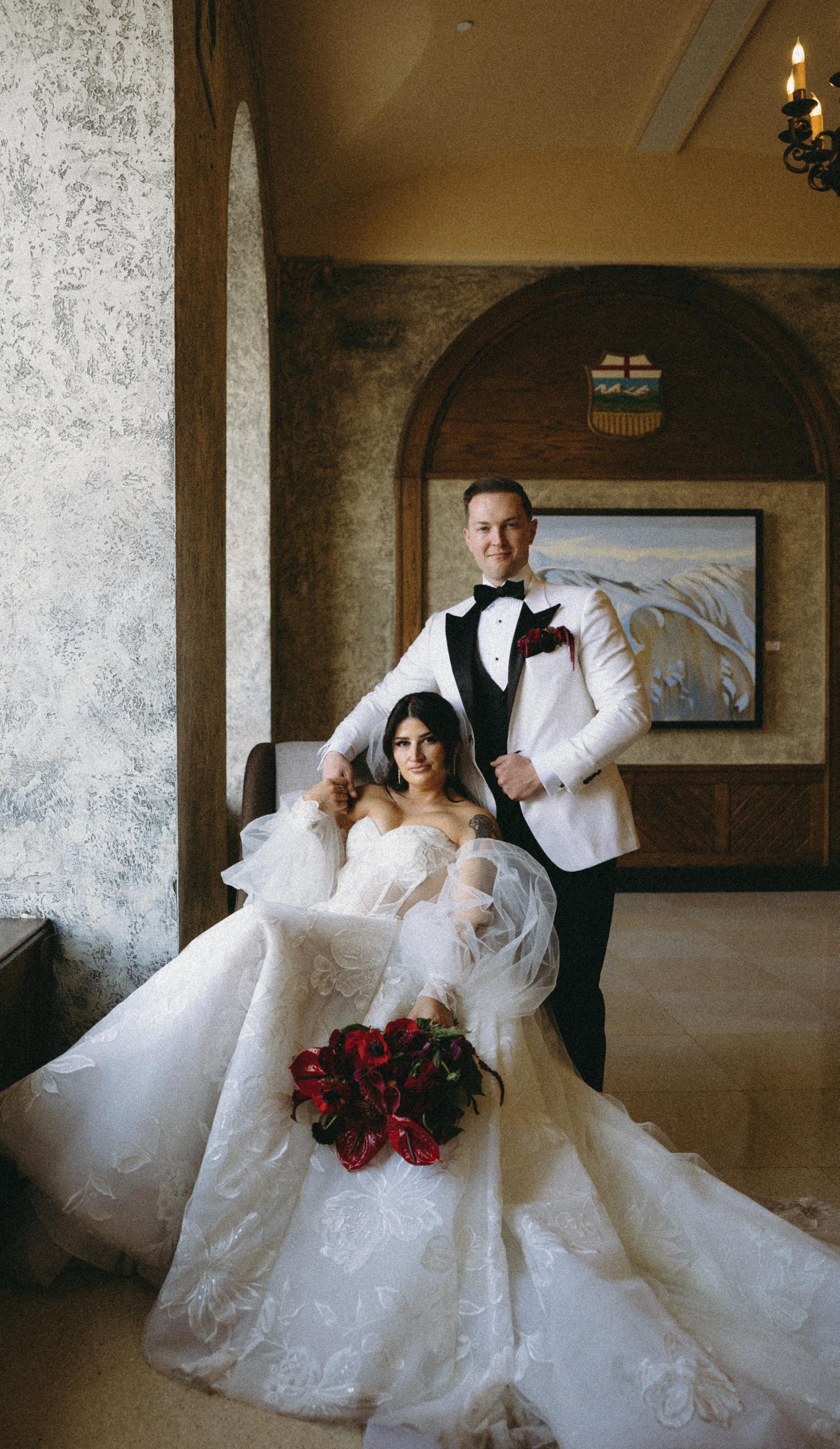 Alex and Ian planned a dark and romantic wedding day at the Fairmont Banff Springs, with just 55 guests in attendance. The venue was a true reflection of their personalities, blending Ian’s love of nature with Alex’s fascination for all things dark and spooky. For their wedding looks, Ian wore a custom white suit from Suitsupply paired with black velvet Christian Louboutin loafers, the perfect blend of timeless and bold. Alex chose a customized gown from Galia Lahav, complete with a matching veil and Jimmy Choo heels. Later in the evening, she changed into a floor-length black mermaid gown by Maggie Sottero, embracing the moody elegance that defined the day.