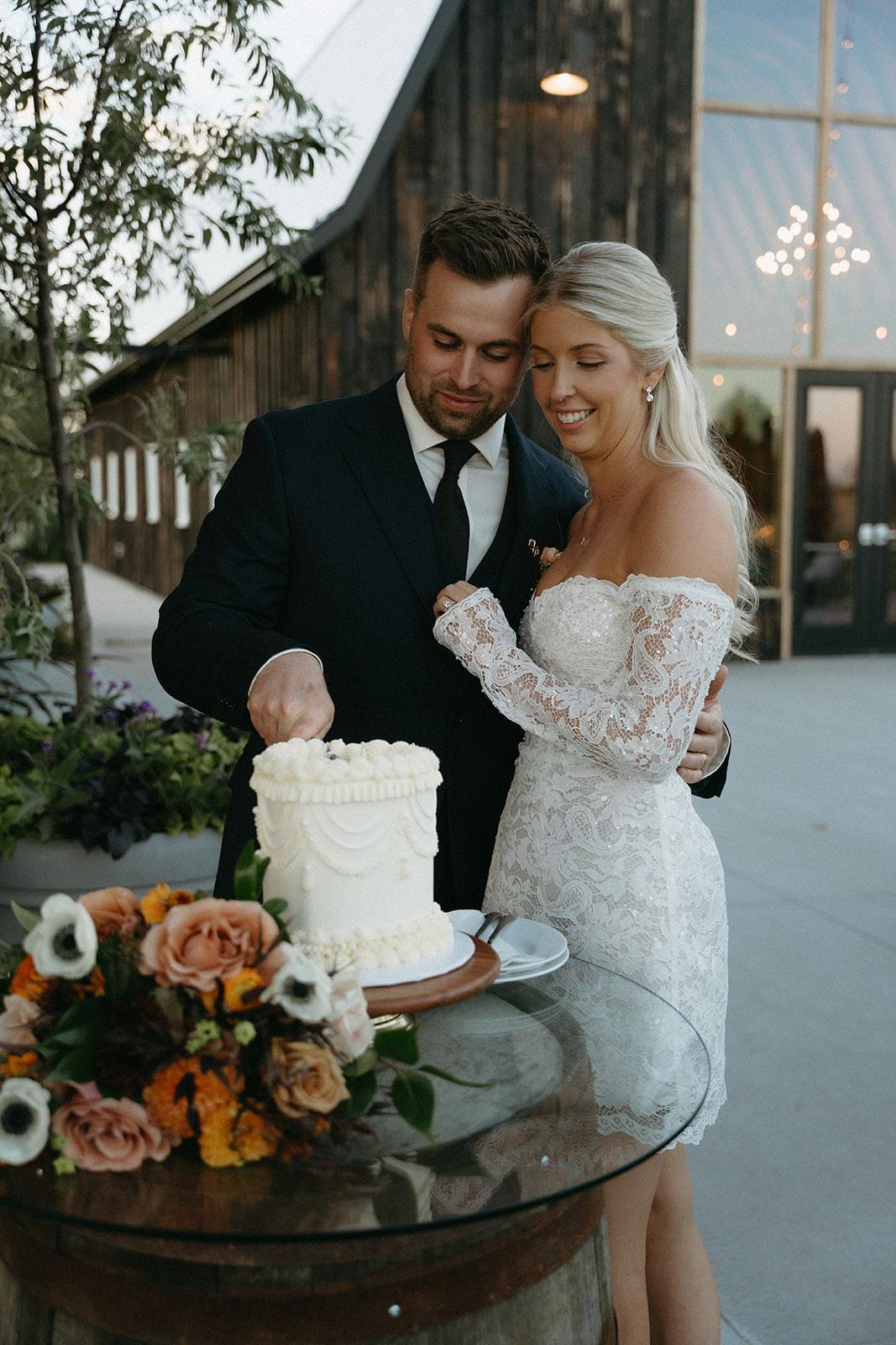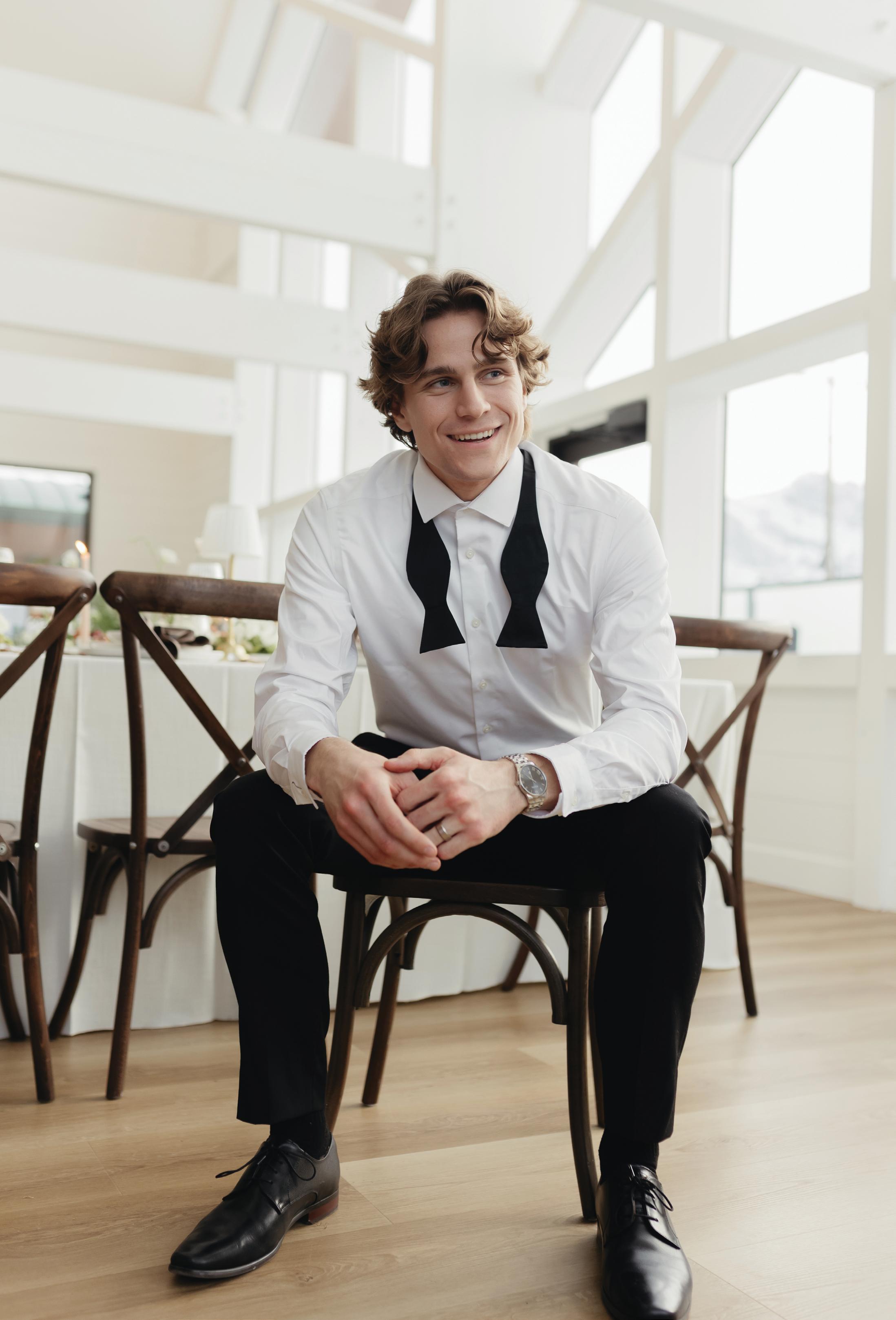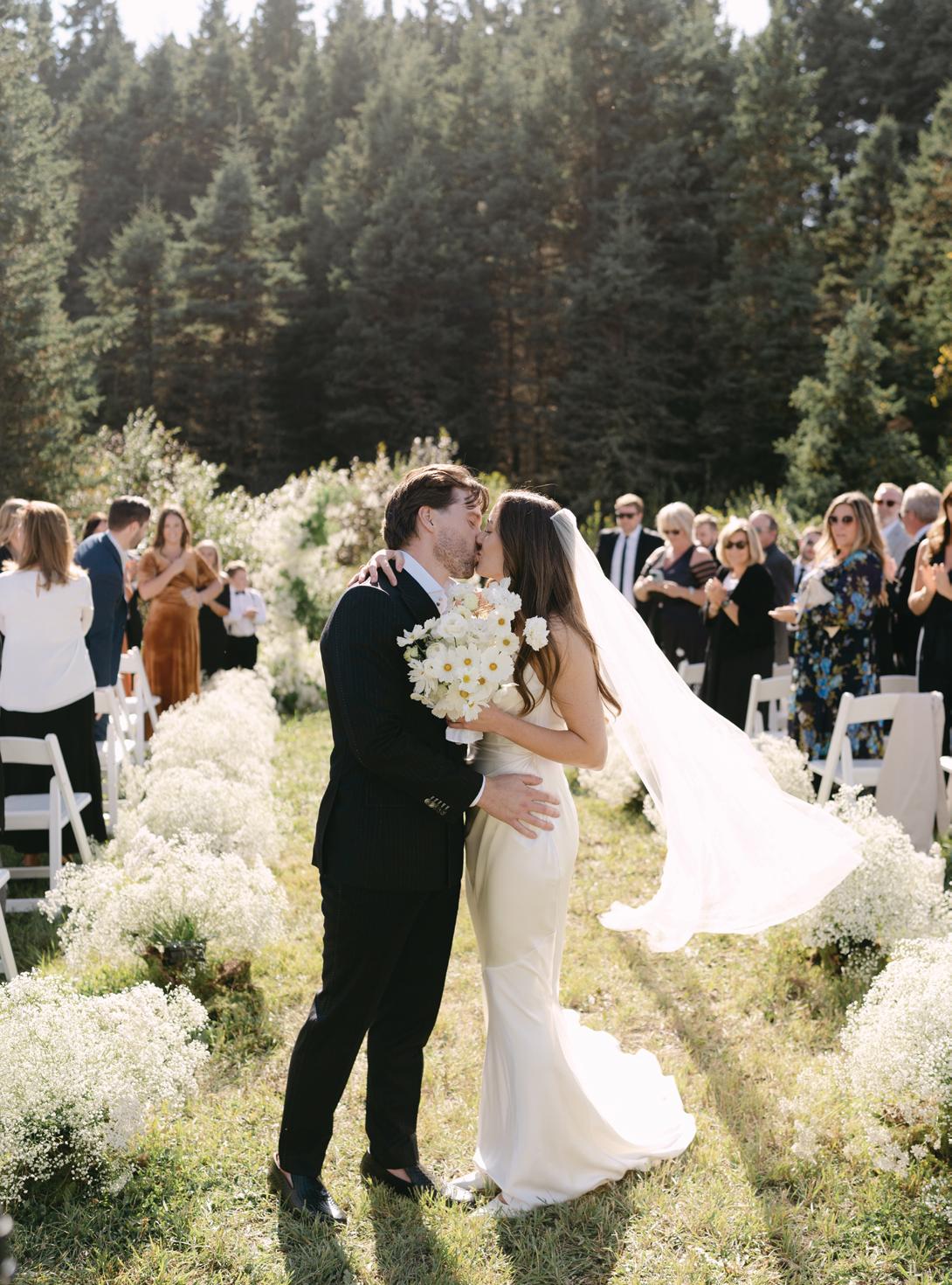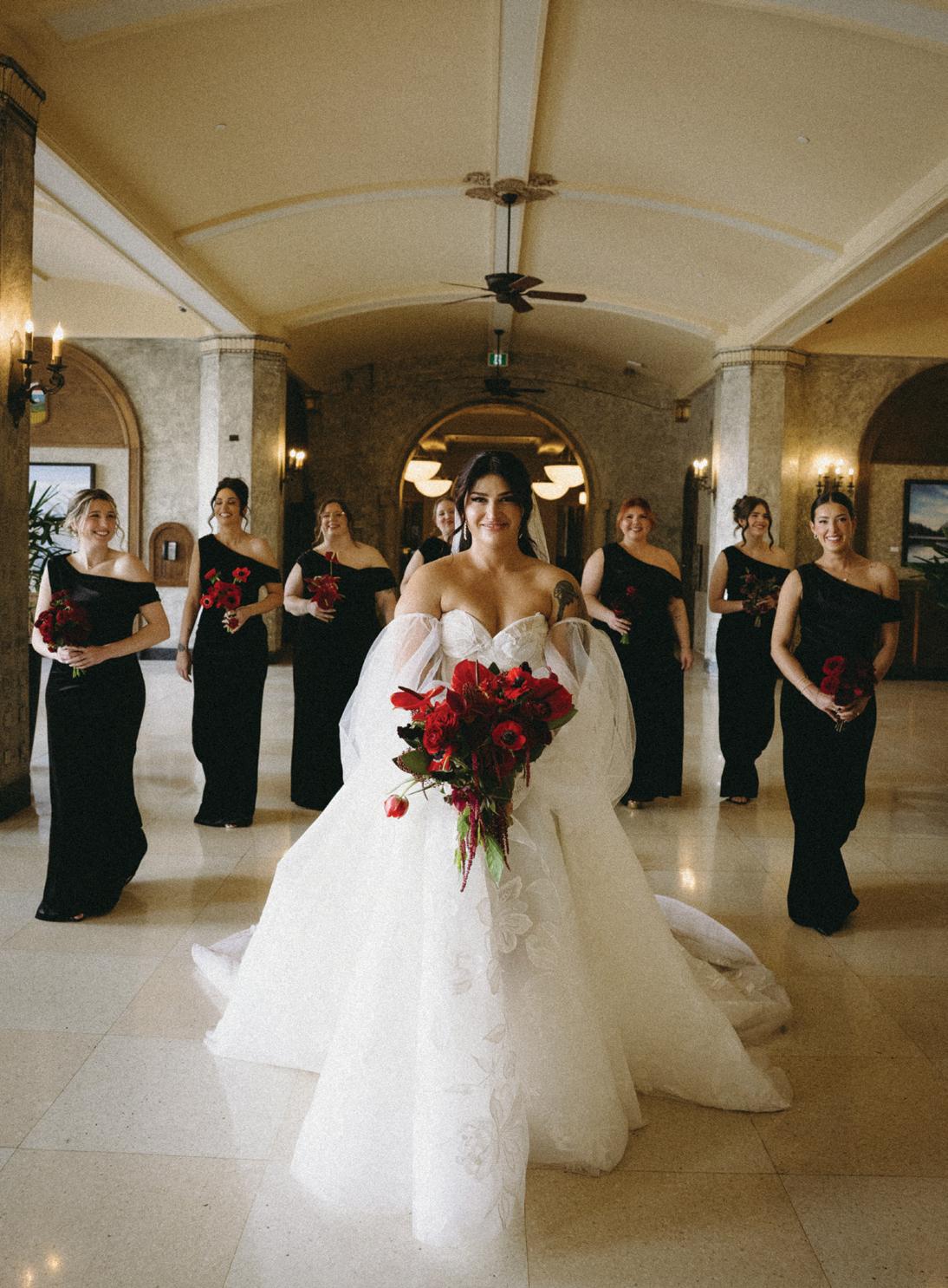 Alex and Ian planned a dark and romantic wedding day at the Fairmont Banff Springs, with just 55 guests in attendance. The venue was a true reflection of their personalities, blending Ian’s love of nature with Alex’s fascination for all things dark and spooky. For their wedding looks, Ian wore a custom white suit from Suitsupply paired with black velvet Christian Louboutin loafers, the perfect blend of timeless and bold. Alex chose a customized gown from Galia Lahav, complete with a matching veil and Jimmy Choo heels. Later in the evening, she changed into a floor-length black mermaid gown by Maggie Sottero, embracing the moody elegance that defined the day.