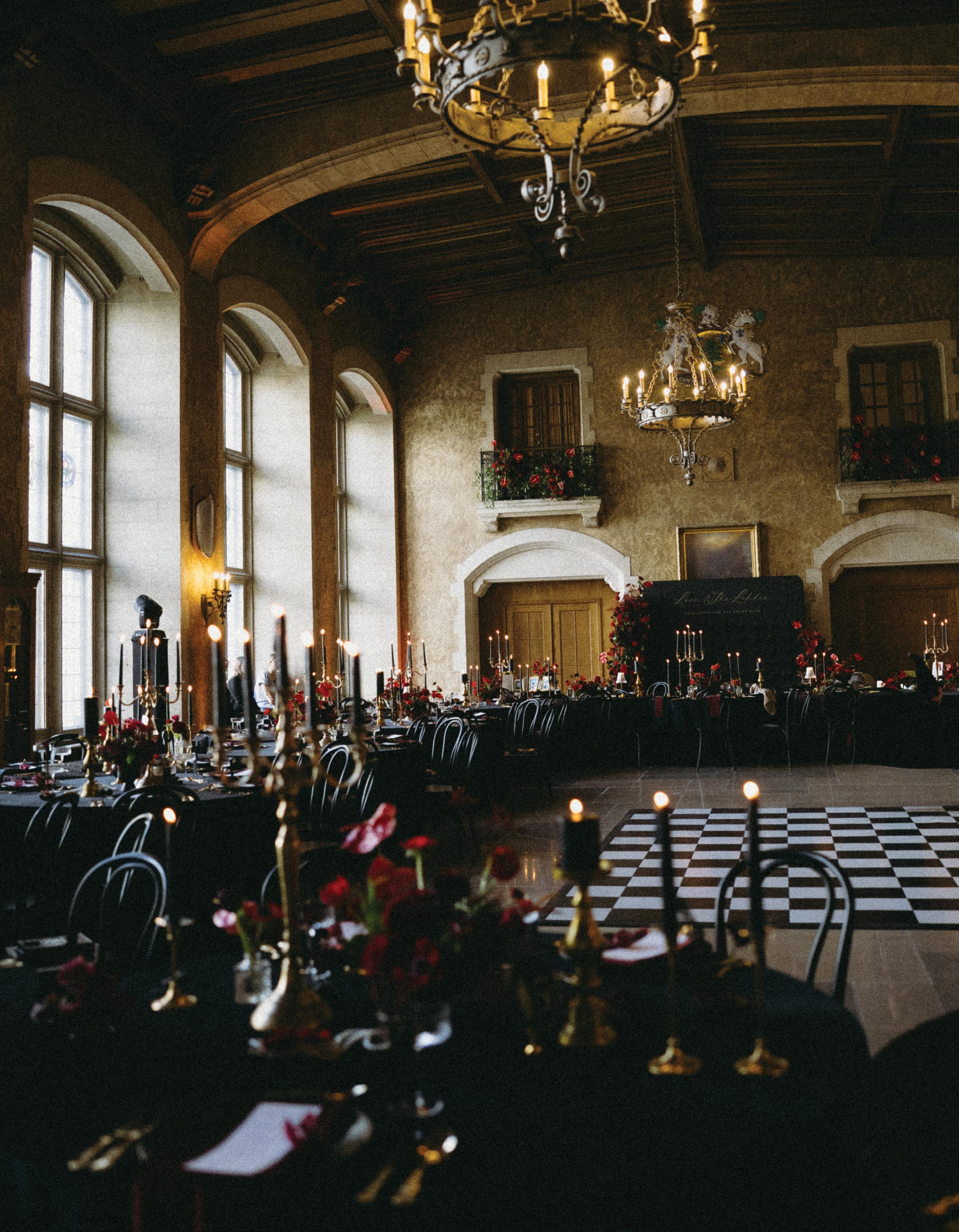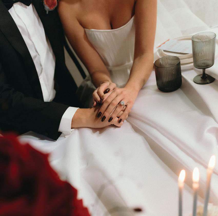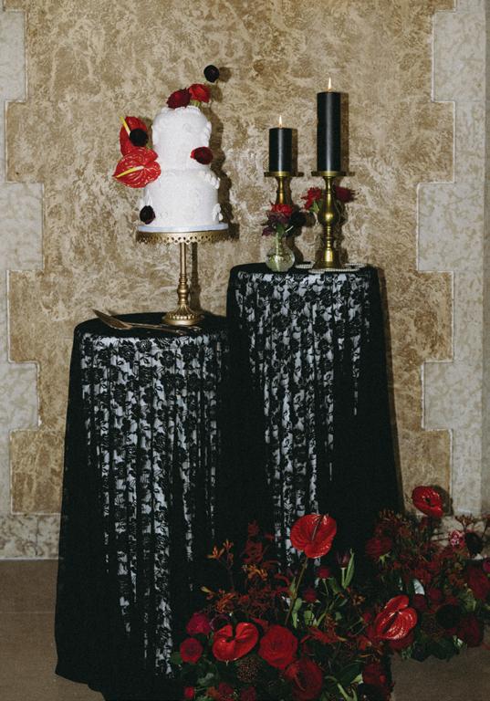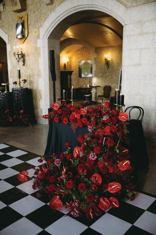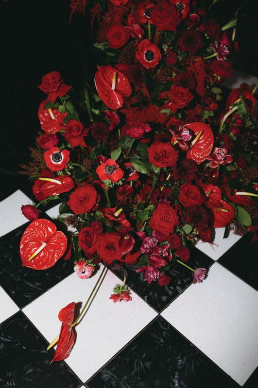 Menus by Unadorned Stationery introduced bold typography and sharp design, perfectly complementing the rest of the tablescape. The sweetheart table was framed in candlelight and dramatic florals by De La Flore, overflowing with red Naomi roses, hydrangeas, anthuriums, Spanish moss and unexpected accents like dried chili peppers and cranberries. The result was a romantic yet editorial aesthetic that felt both elevated and fresh.