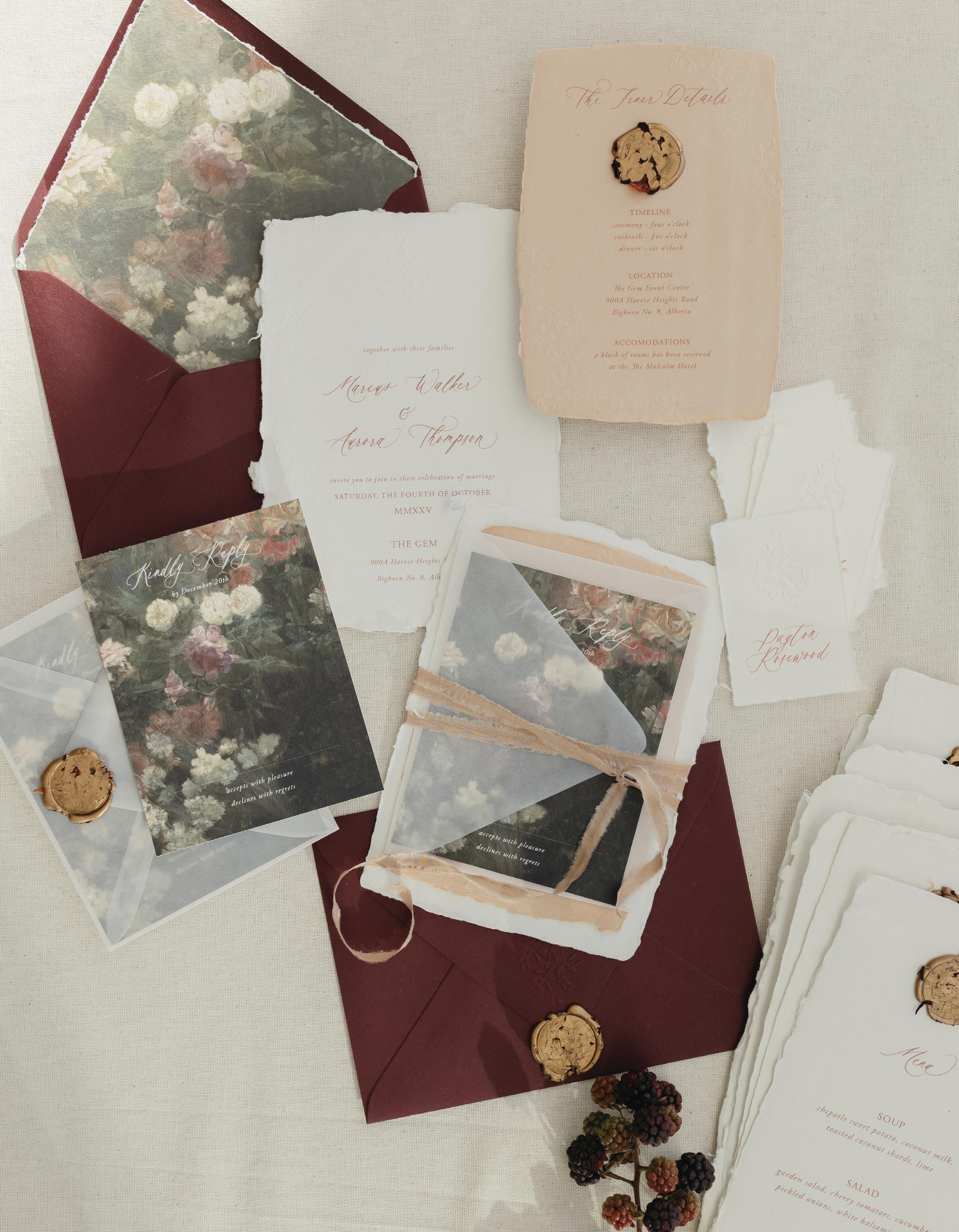 Inspired by the natural beauty of mushrooms, wedding planner Fiore Fine Events, dreamt up this grounded yet elevated design. The intention was to create an aesthetic that felt earthy and artfully undone, anchored in organic textures with a romantic edge. The Gem Event Centre’s loft-style venue, with its soaring ceilings, full-glass façade and breathtaking views of the Rocky Mountains, offered the perfect canvas to bring that vision to life. A modern and organic invitation suite by Seeking Light Studio hinted at the rich tones and layered depth that would unfold throughout the celebration.