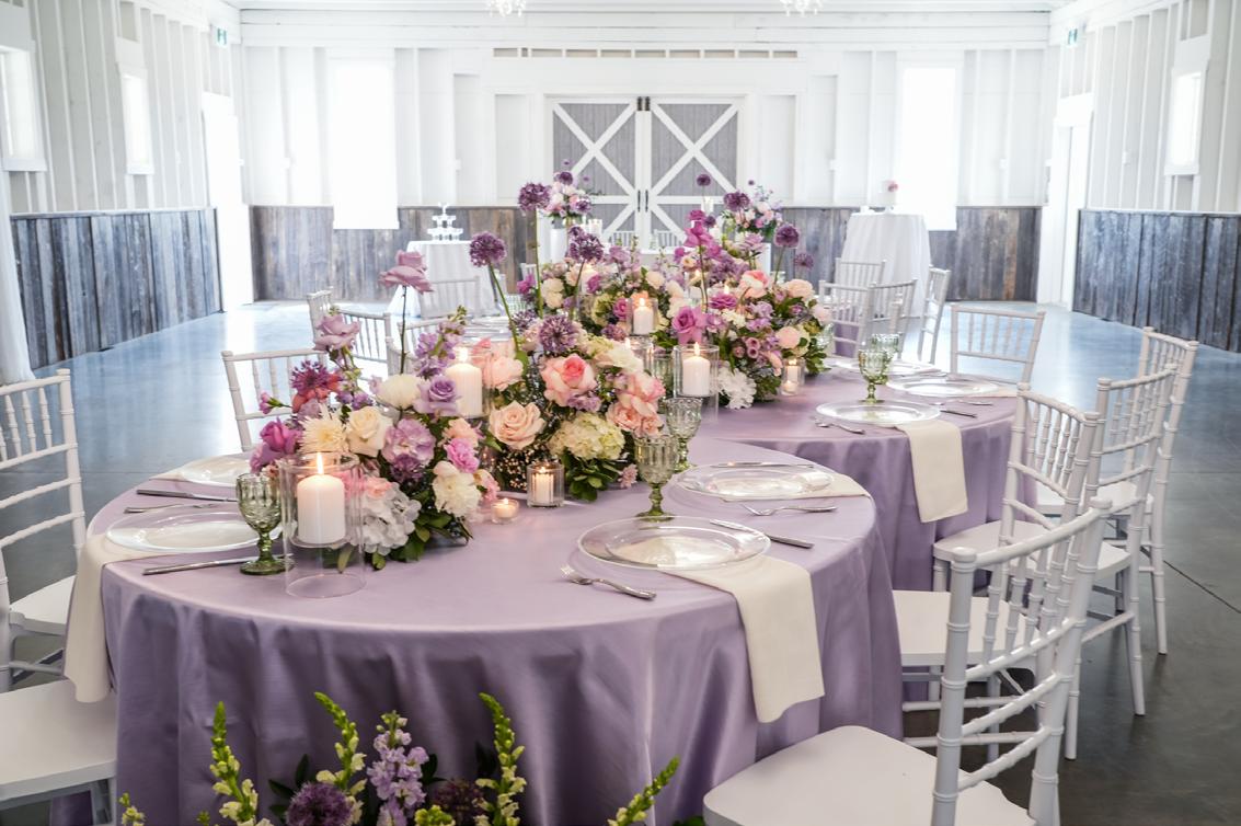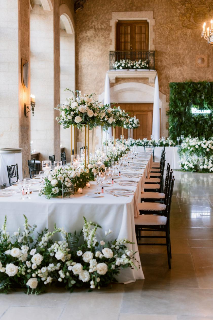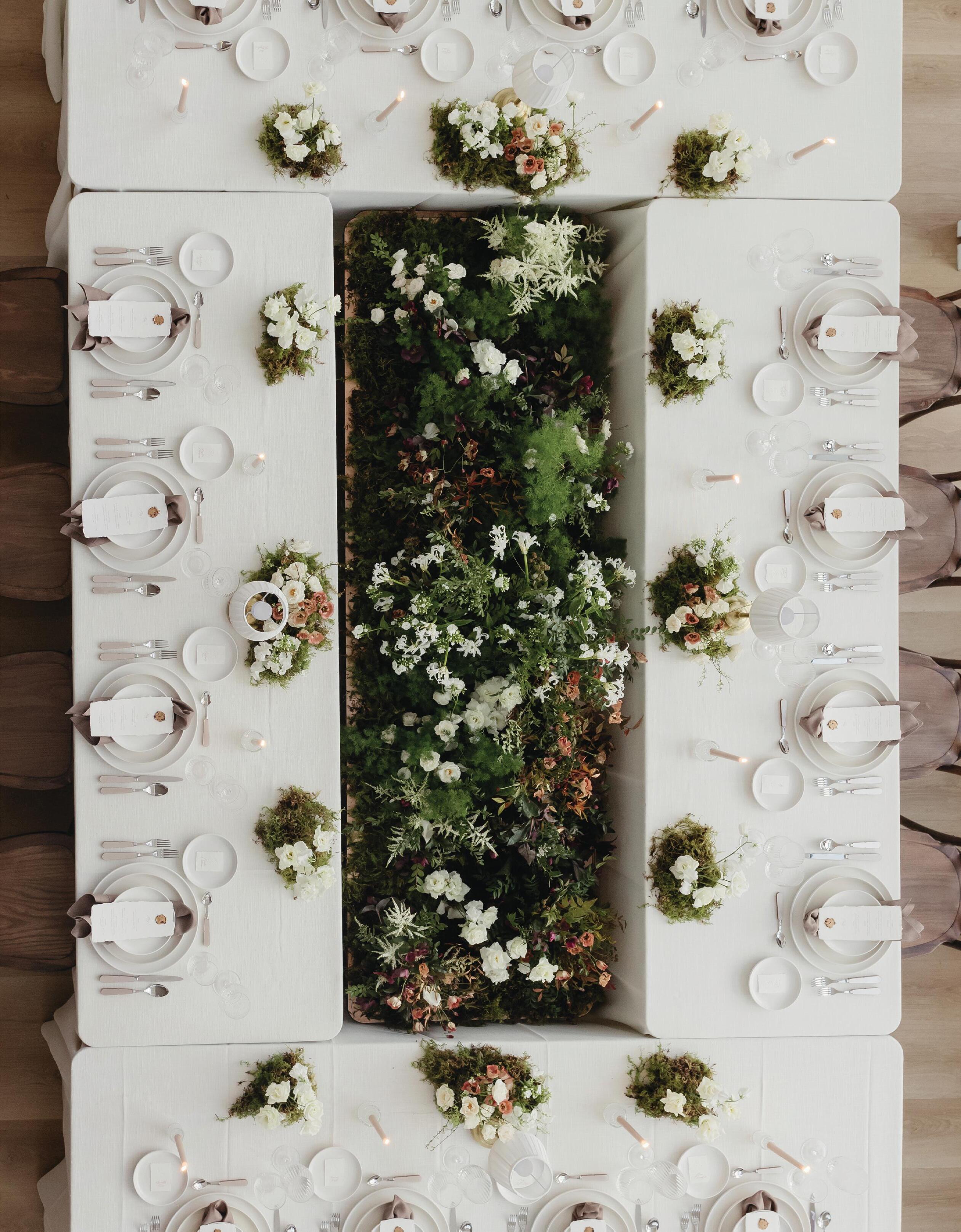 For the reception, four tables were arranged to form a striking open rectangle, creating an intentional layout that fostered connection and conversation. At the center, a lush floral meadow overflowed with moss, sweet peas, phlox, spray roses, spirea and lisianthus. The design mimicked a natural garden bed, blooming organically between guests. Airy clusters of blooms added texture and movement to the earthy base, while subtle touches of burgundy hinted at the richness of winter. Taper candles and petite table lamps cast a warm, intimate glow, enhancing the mood and inviting guests to linger long into the evening.