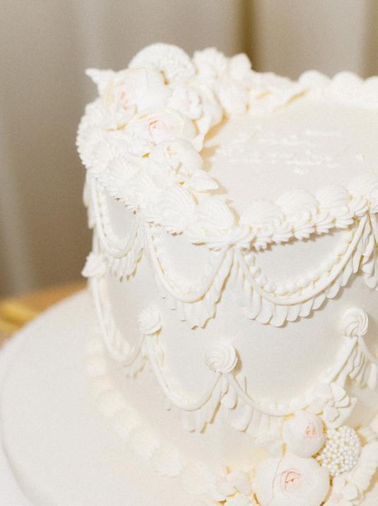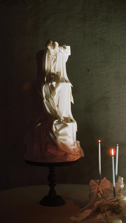 A head-turning multi-tiered cake by The Cake & The Giraffe mirrored the draped movement seen throughout the shoot. With smooth and ribbed texture fondant, the draped folds mimicked silk in motion and soft bow detailing. The cake stood beside the champagne tower as both centerpiece and sculpture; decadent, dimensional and undeniably unforgettable.