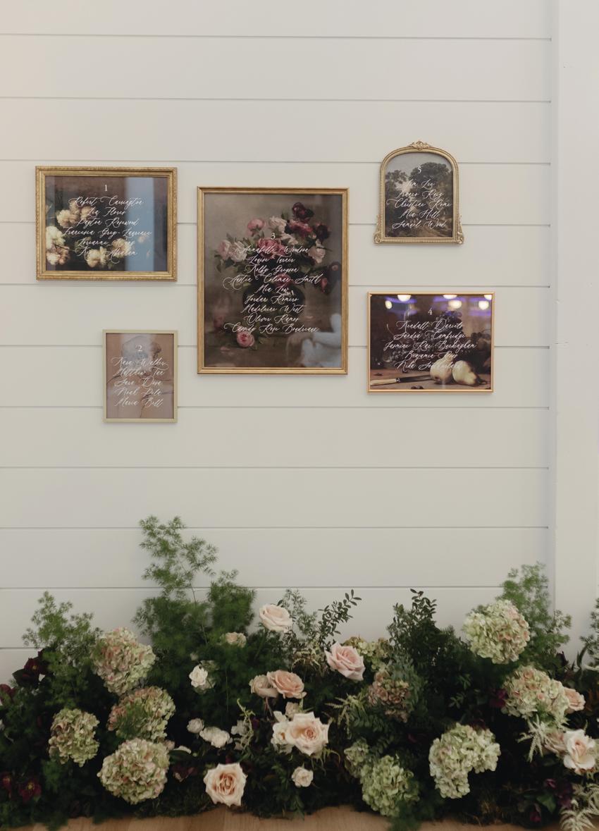 Guests were invited to find their seats with an art gallery inspired seating chart backed with vintage floral artwork. For a sweet ending, Black Dog Bakery crafted a showstopping cake infused with raspberry, rose and rhubarb. Each layer was bursting with tart and floral notes. Its Lambeth-style buttercream piping nodded to Old Hollywood glamour, while a champagne tower added celebratory sparkle. The combination paired beautifully with the shoot’s modern-vintage aesthetic.
