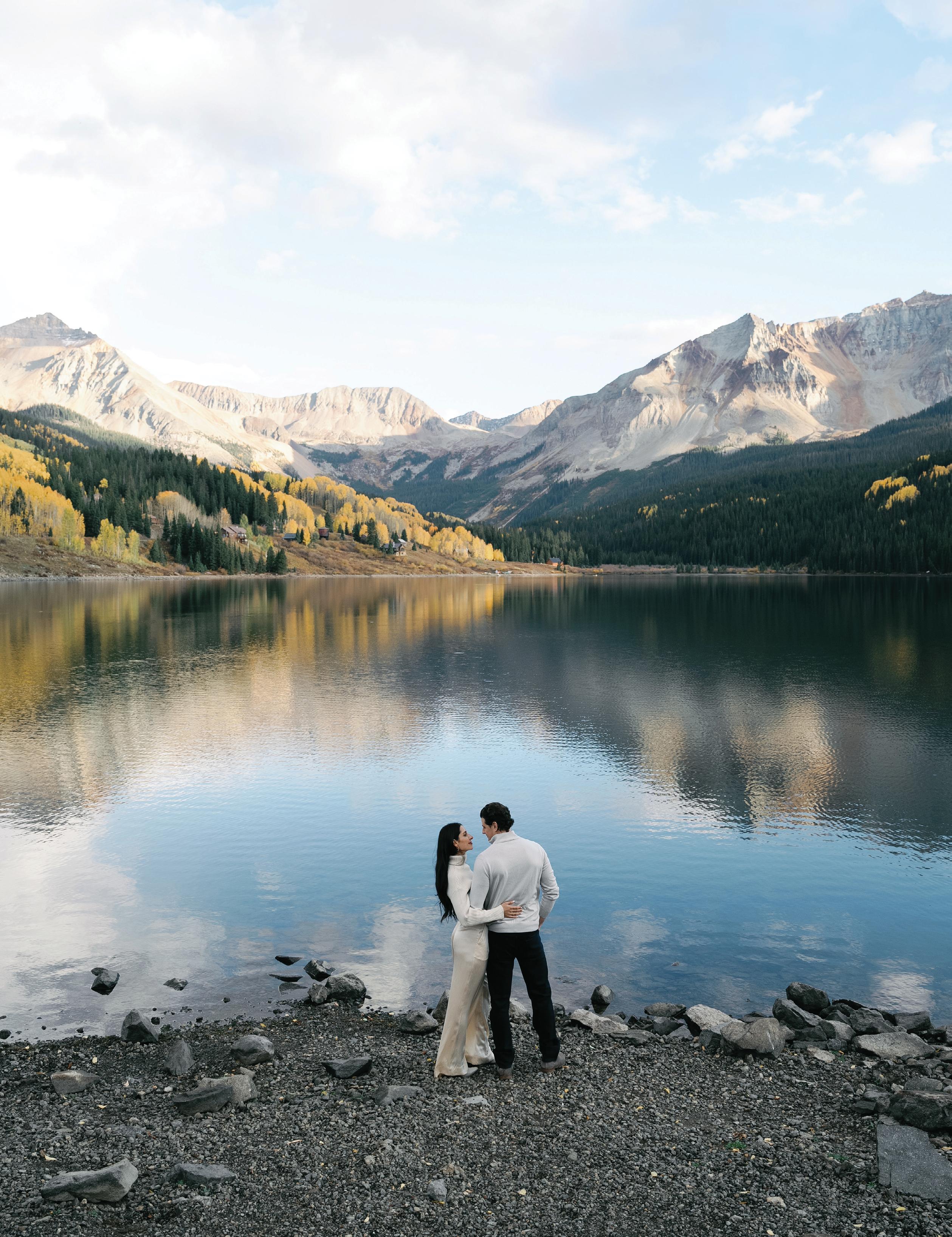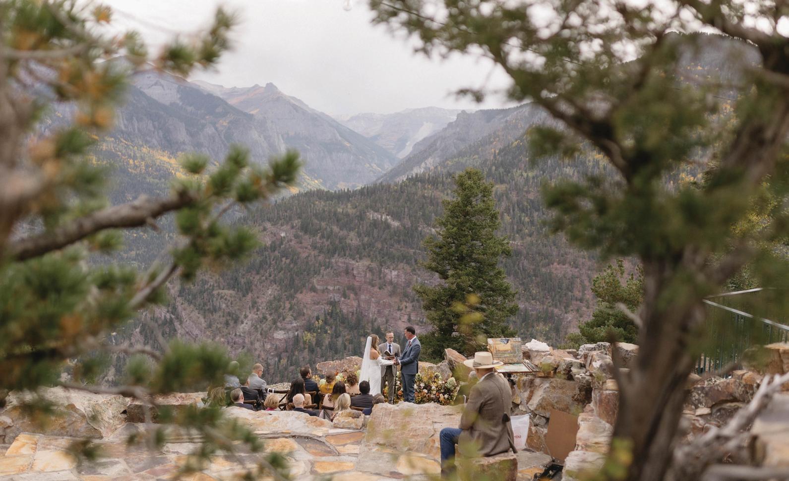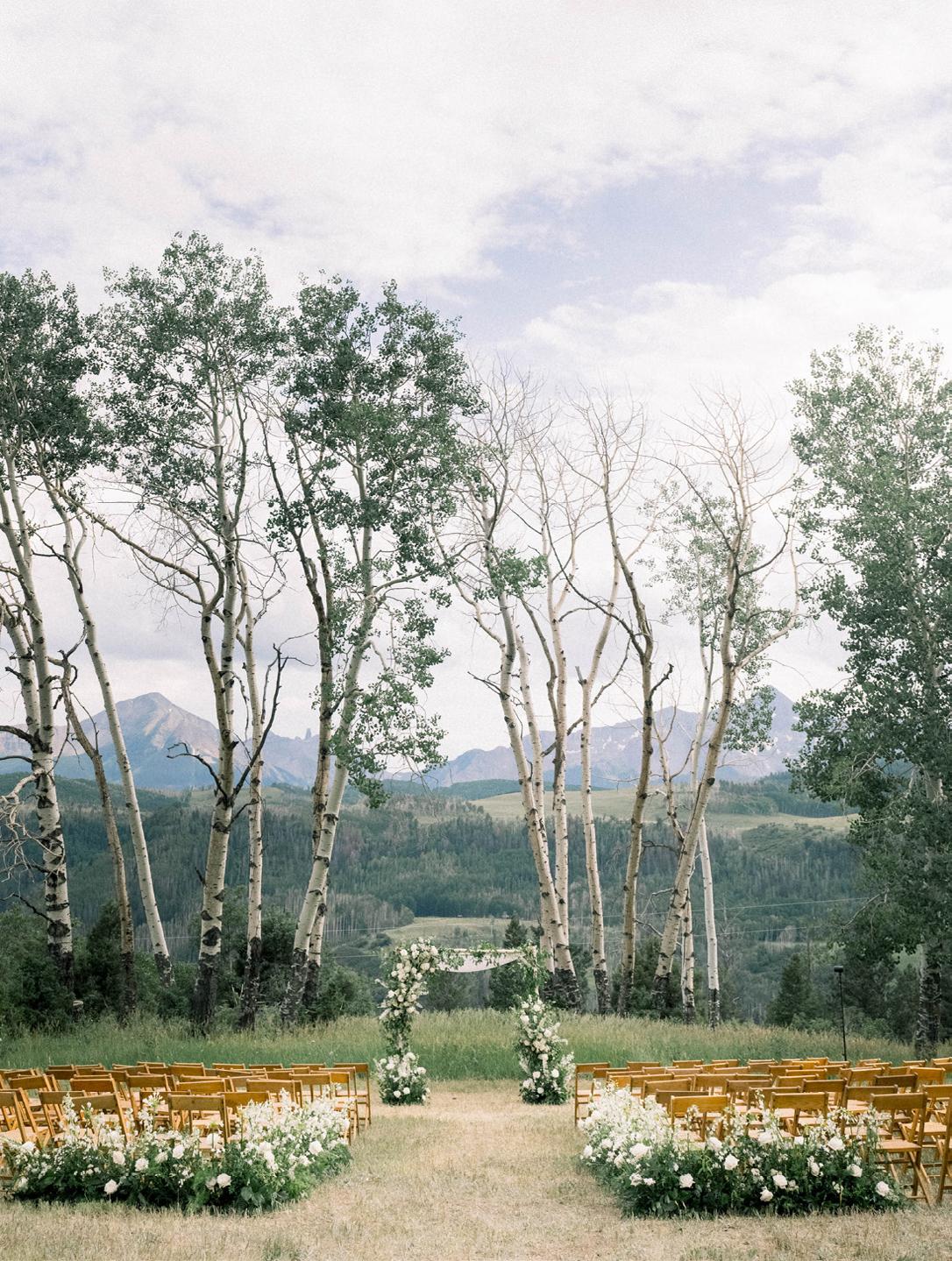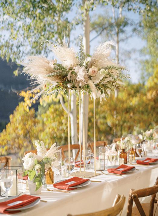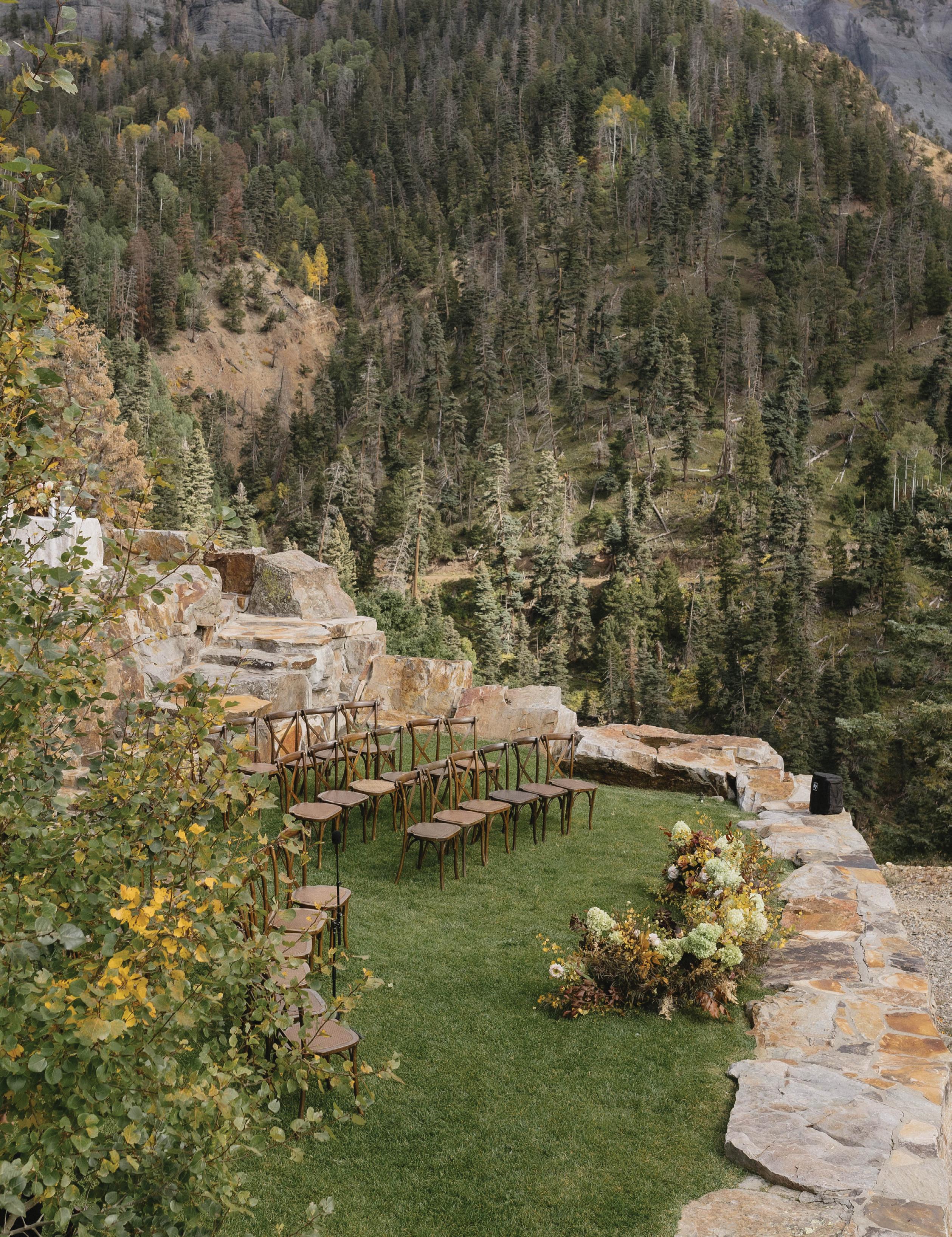 Set against the sweeping peaks of Colorado’s San Juan Mountains, this fall-forward editorial at Purgatory Resort captures the golden beauty of autumn in the Rockies. Inspired by the season’s vibrant shift when aspens and maples light up the mountainside in rich golds, fiery reds and burnt oranges, planner and designer Cinder and Pine Weddings brought the changing landscape to life through immersive ceremony florals and natural, locally foraged foliage. Towering aspens appeared to grow organically from the ceremony aisle, while fresh-cut flowers like mums, roses and amaranthus were carefully layered into the scene. As Casey Baird of Cinder and Pine shared, they “constructed a life-sized display that felt as though it had organically emerged from the mountainside. Using innovative mechanics, we were able to support towering, seven-foot trees within foam blocks, carefully filling in with fresh cut flowers so that every element appeared intrinsically connected, growing together just as they do in the wild.”