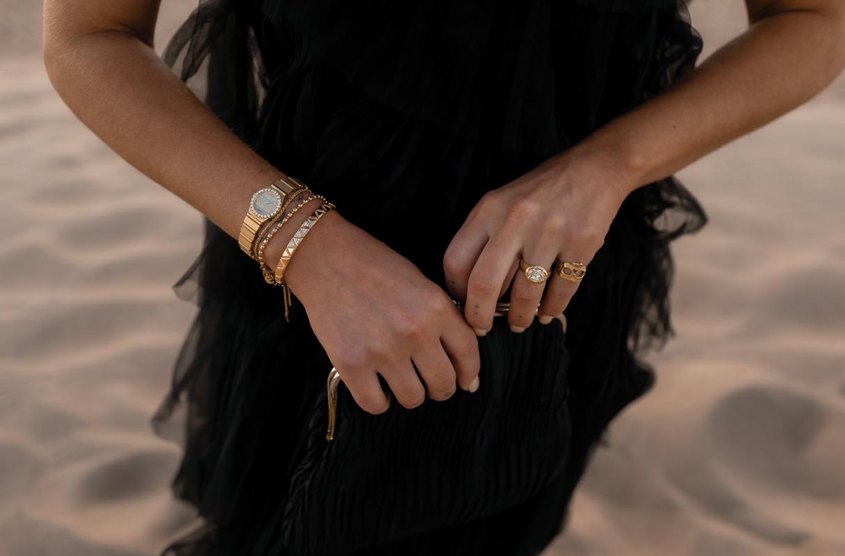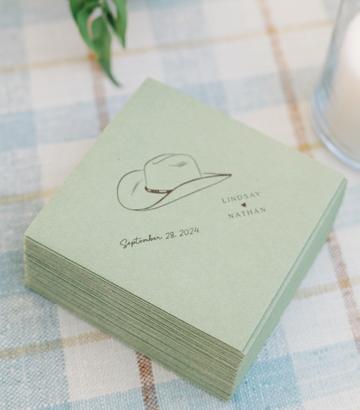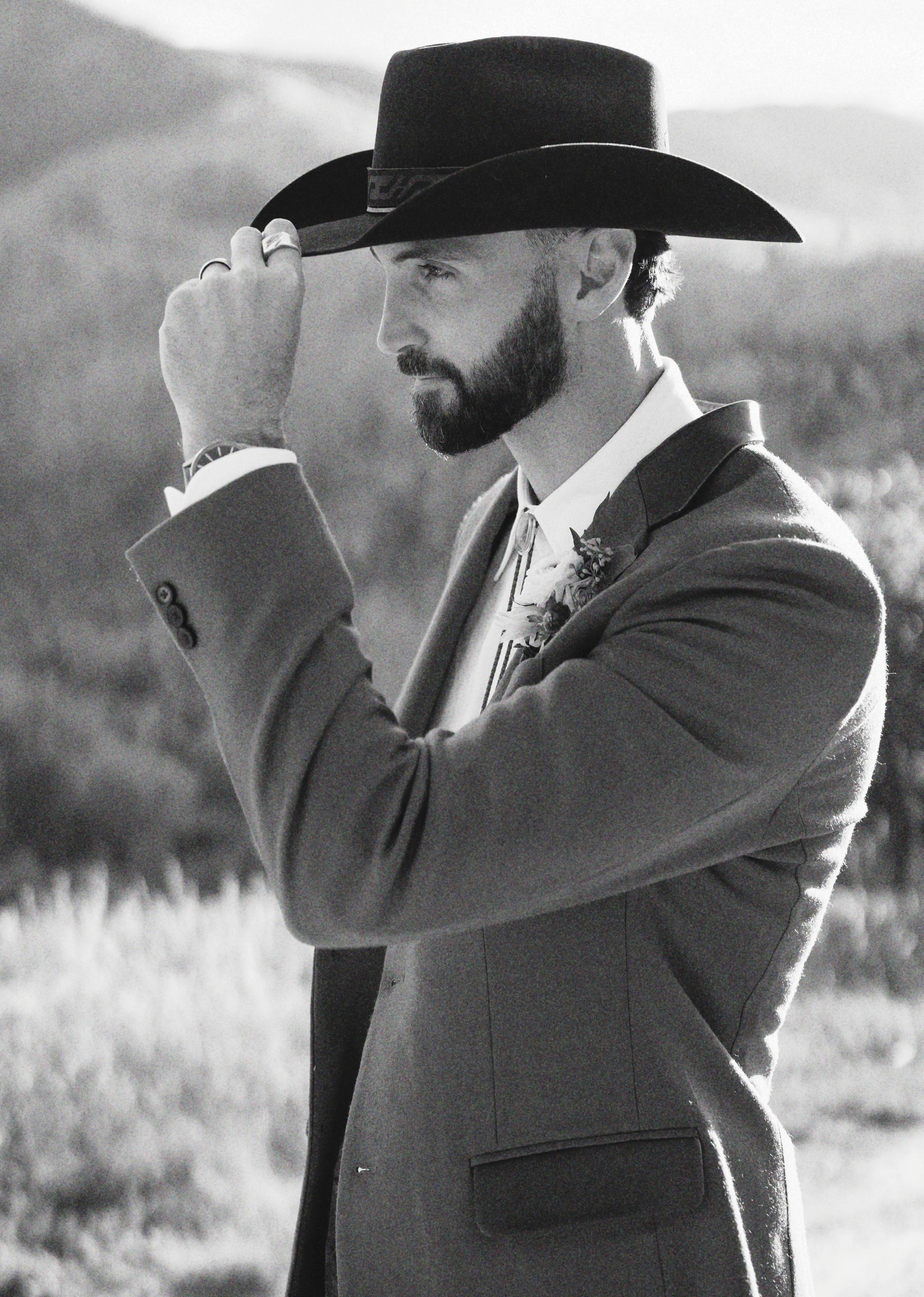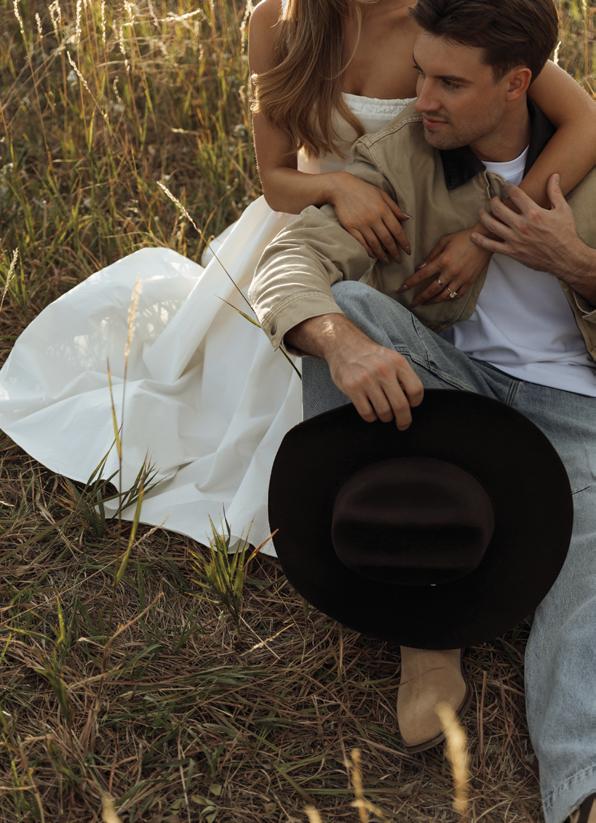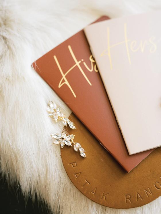 The paper goods from Montana Paper Co set the tone, showcasing pressed floral prints and textured deckleedge stationery. Guests would find their names written in delicate script atop place cards finished with gold wax seals, complementing a tablescape that felt luxurious even in the open fields. The fashion was equally striking. The bride stunned in a sculptural strapless Lela Rose gown from Little White Dress Bridal Shop, accented with sparkling diamonds from Sarah O. Jewelry; the Jenna Marquise Engagement Ring with a 1.5 ct center stone, paired their Thin Gold Stacker Band and completed with the Emma three diamonds in bezels necklace. While the groom’s tailored look from SuitShop balanced elegance with a Western edge. No old money Western moment is complete without custom cowboy hats, and Hats by Parker Thomas delivered timeless, personalized toppers that brought the couple’s chic ranch aesthetic to life.