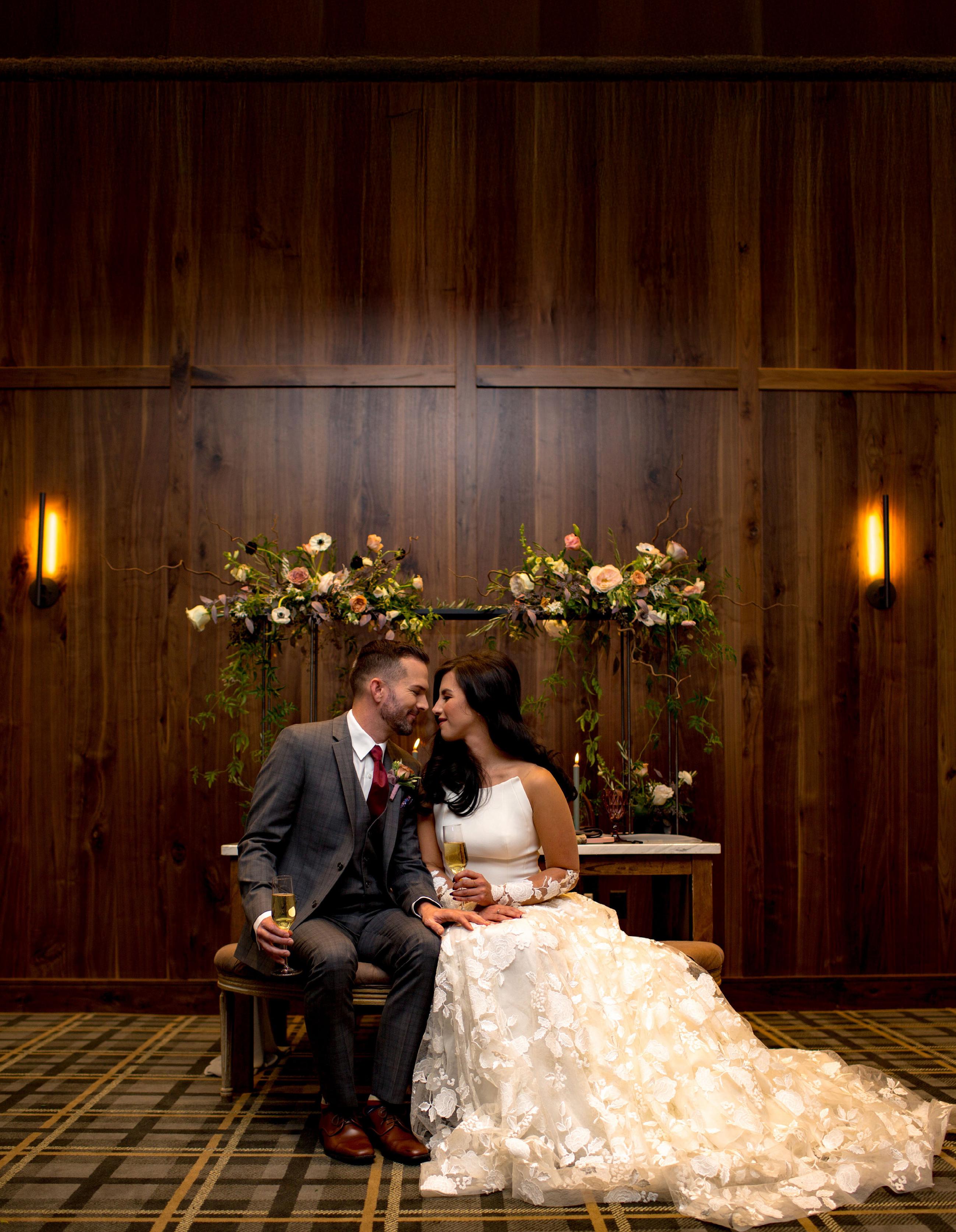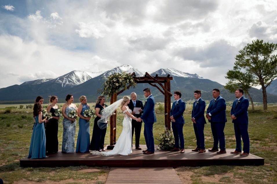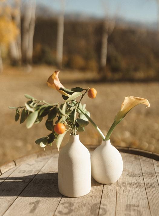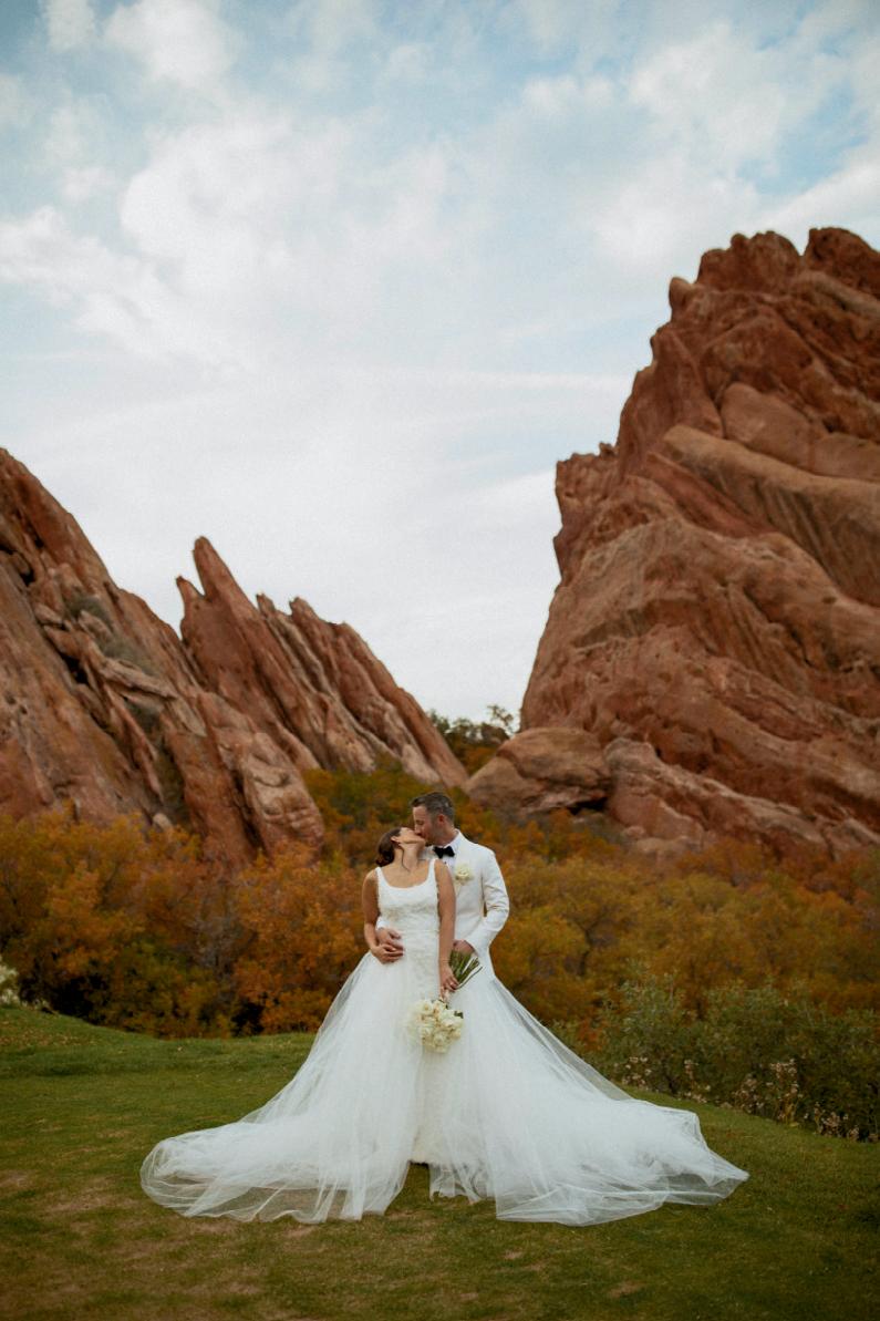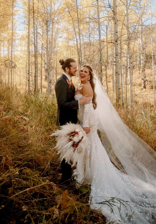 In keeping with the organic sophistication of the day, the bride wore a lace gown from Katerina’s Darling Bridal, paired with a soft, romantic veil that echoed the delicate flutter of aspen leaves in the breeze. The groom’s tailored slate suit was styled with a modern twist, featuring a bold floral collar in place of a traditional boutonnière. Bursting with warm fall blooms, the updated design added a fashion-forward flair to his look while also complementing the surroundings.
