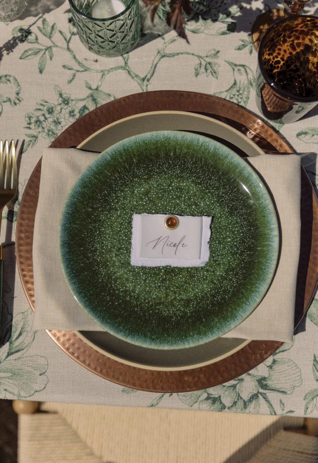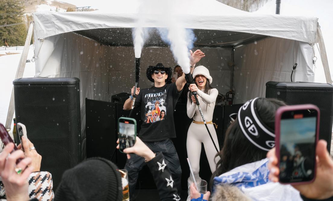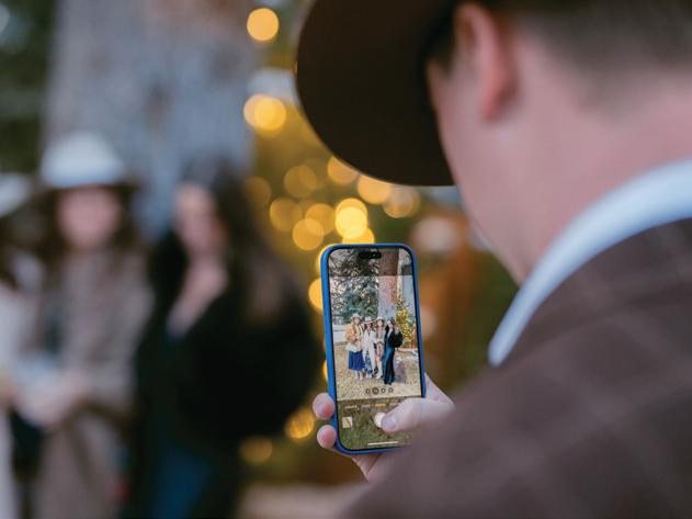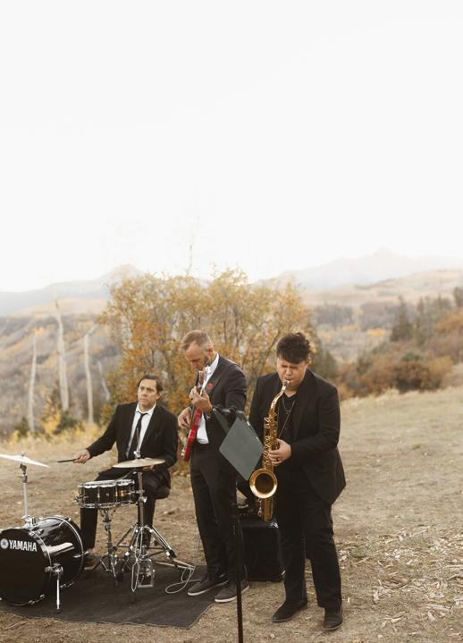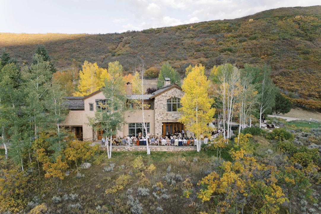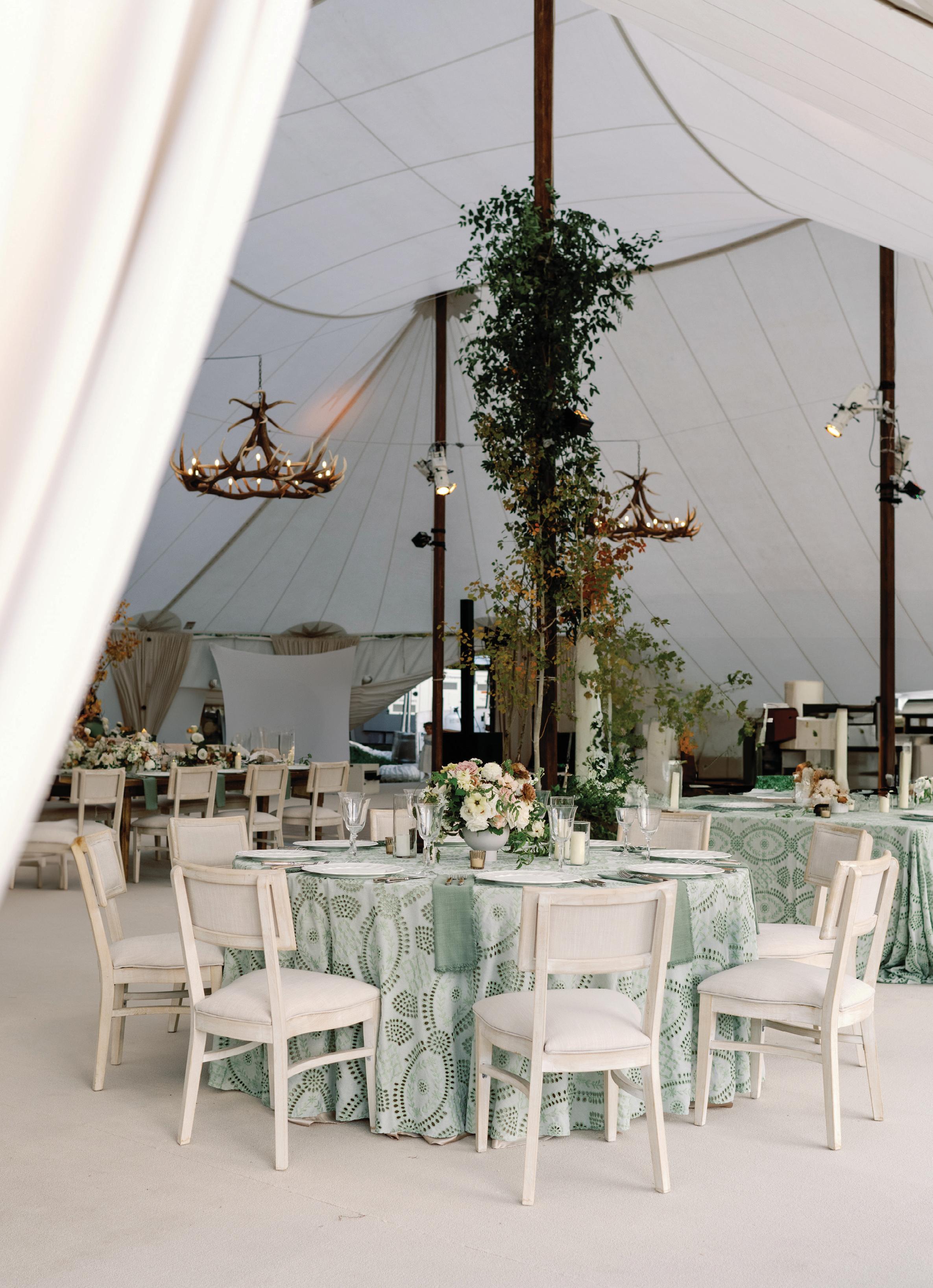 With a full weekend of festivities planned, the celebration began on Thursday with an intimate rehearsal dinner at Acquolina followed by cocktails at Las Montañas, both infused with a cowboy chic vibe. On Friday, guests gathered for a welcome party where they sipped drinks and mingled under the Colorado sky before the big celebration. Drawing from a palette of soft greens and dusty blues, the design complemented the surrounding fall foliage rather than competing with it. Florist Amy Lauren brought the landscape to life with lush, organic arrangements that lined the ceremony aisle, featuring hydrangeas, garden roses, lisianthus and wisps of textural greenery. Inside the tent, the reception design was inspired by a circular sage green custom bar wrapped in Aspen logs by Radix Creative Design House. Towering aspen trees and climbing vines framed the space, creating a refined yet organic atmosphere accented by antler chandeliers and luxurious patterned linens. Guests were treated to a Hillstone-inspired dinner curated by Catering by Design, complete with Macho salad, spinach artichoke dip, sliders and tableside fries, before dancing the night away to the sounds of Mannequin the Band under the glow of a twinkle-lit canopy.