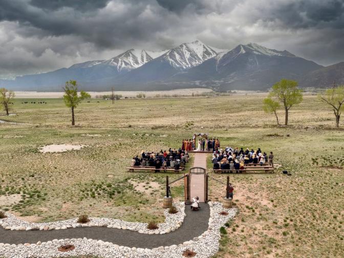 Perched in an aspen grove with stunning Continental Divide views, our chairlift-accessed ceremony site offers an unforgettable setting. After the vows, guests enjoy lawn games and cocktails while awaiting the couple’s return. As night falls, a curated culinary experience is served as guests dance under the moonlight, stargaze on the deck, and savor s’mores by the fire.