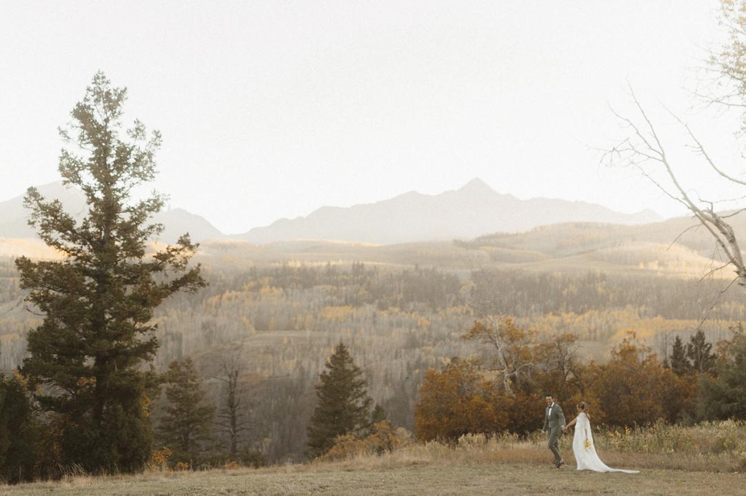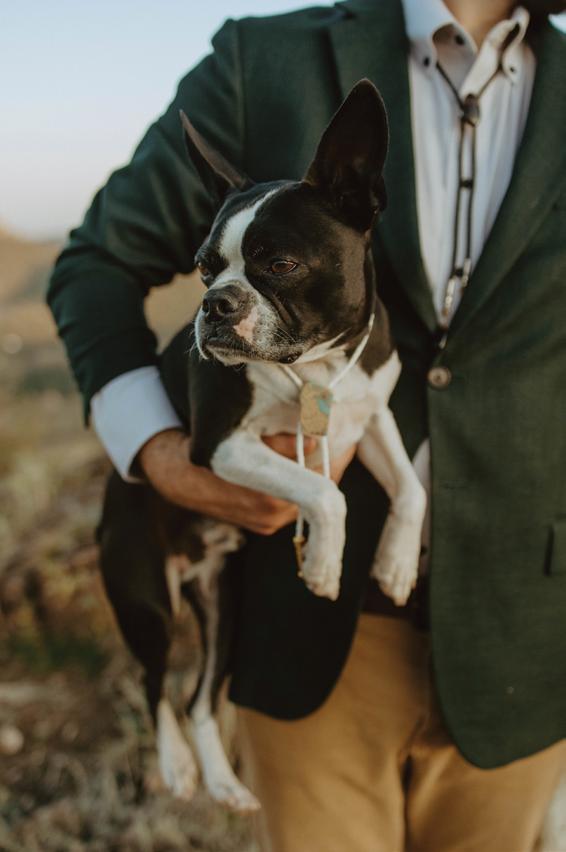 With the help of Telluride Unveiled, Tasha and Brad planned a timeless and warm autumn wedding at Lower Golden Ledge featuring golden-hour views beneath the towering aspens trees. Tasha stunned in a strapless Sarah Seven gown with a floral corset bodice and flowing cape, paired with Lucchese boots and a high ponytail for an effortless Western twist. Meanwhile, Brad wore a sage green tuxedo-inspired suit with a stitched outline of their corgi, Banana Bread, hidden inside the jacket; a nod to their most loyal guest. Their ceremony took place beneath a sweeping floral arch by Alex Fairchild, bursting with autumn tones that mirrored the surrounding scenery. Guests were then welcomed into a cozy sailcloth tent for an Italian family-style dinner featuring handmade pasta filled with butternut squash in a brown butter and sage sauce by local chef Will Nolan. Instead of florals, Alex created food sculptures for the table centerpieces that aligned with the menu including tomatoes, olives, grapes, garlic, and bread. To make the dinner even more memorable, Tasha and Brad drove in their favorite wines from Teutonic Wine Company in Oregon. Instead of cake, the night ended with passed Sweet Cow Ice Cream cones so that guests never had to leave the dancefloor!