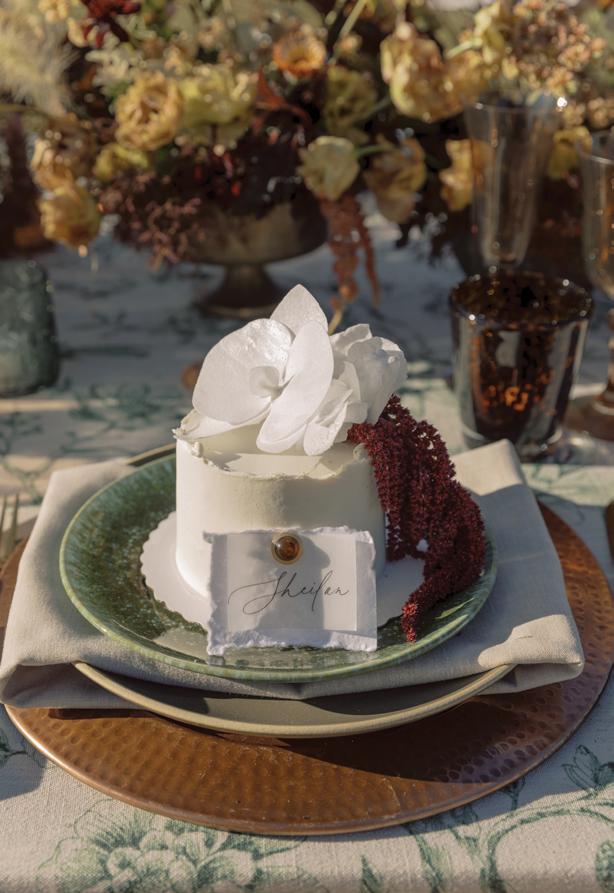 For the reception, guests were invited to gather in an open meadow framed by mountains and golden light. The lounge setup by Oak & Twine Rentals combined cozy textures with tailored finishes like rich wood furniture, fur throws and earthy-toned floral accents that brought warmth to the wild. A single long table was set for dinner, dressed in green printed linens and layered with emerald flatware and vintage-inspired details like fine china and crystal glassware. But the showstopper? A three-tier cake by Alyce in Flourland, adorned with sculptural wafer florals and cascading amaranthus, with an indulgent brown sugar chocolate chip cookie crumb and rich cookie dough filling. Each guest was even served their own miniature version, offering a sweet and sophisticated finish to a storybook romance.