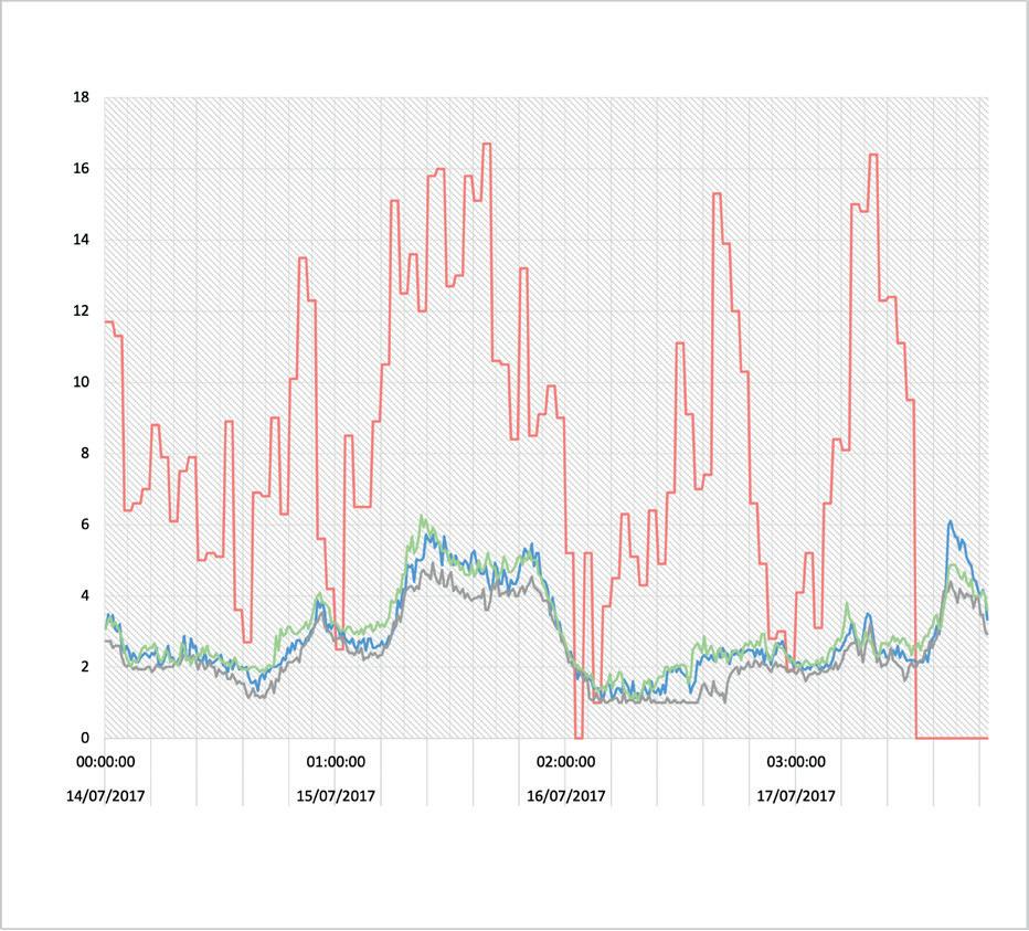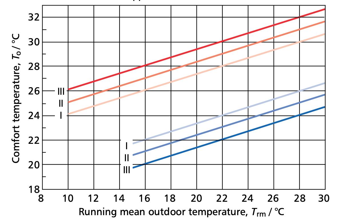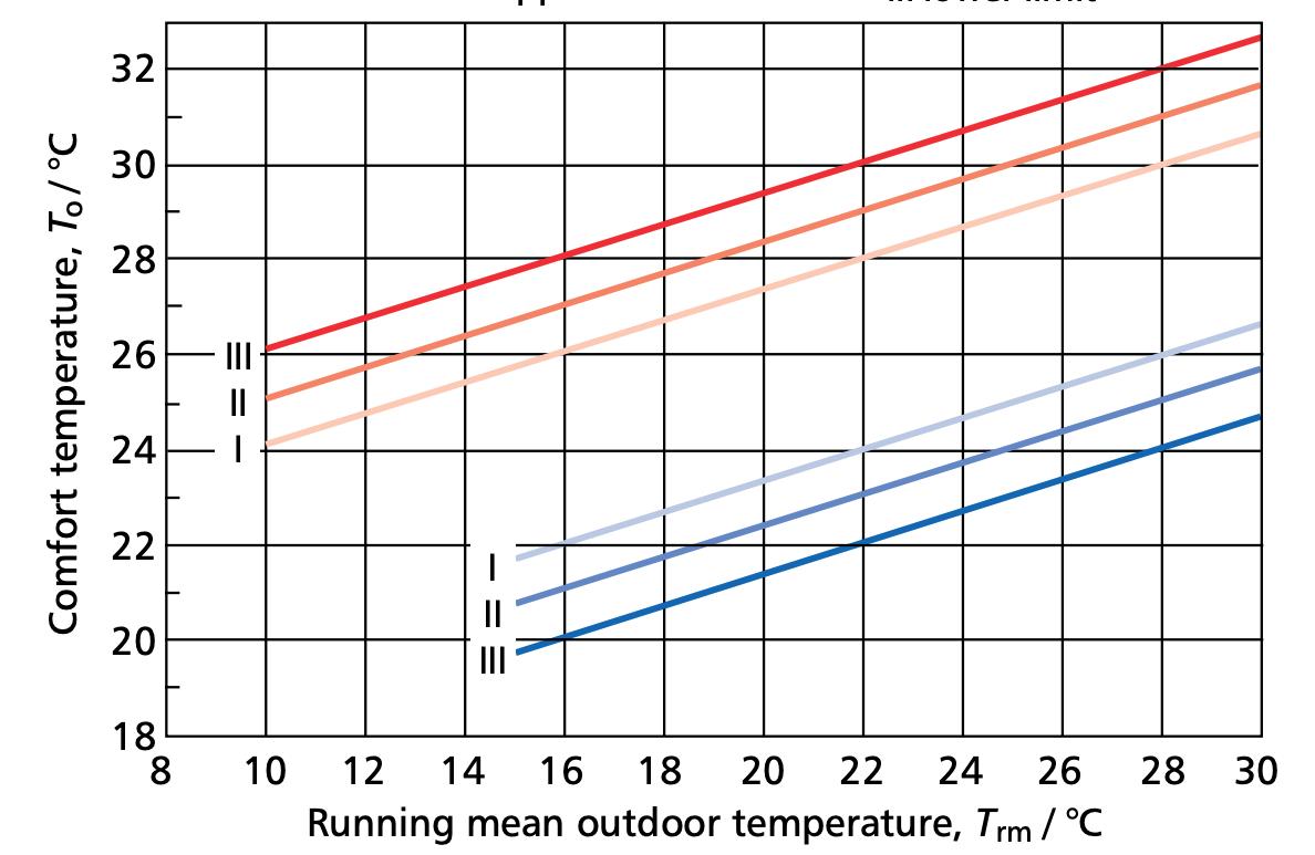 Alternatively, in room 413 which is an open plan with a potential occupancy of 10+ people, CO2 levels are much lower than the other two rooms, this may indicate that ventilation or an opened window area during the investigated time is more than that of the other rooms – this can also be supported by the indoor temperature compared to the external, where room 413 presents an indoor temperature of 23.8 °C which is closer to the outside value of 17.8 °C unlike what is presented in rooms 416 and 418 of 24.4 °C. It is assumed that indoor heating was not turned on during the assessed period, as this was during the summer month of July, but the building design and materials lead to solar penetration and gain despite the slightly cooler weather outside. Nevertheless, all rooms presented an internal vs. external temperature of more than 5 °C – not applying to the thermal comfort guidelines of Buildings Bulletin 101 but conforming to the thermal comfort range of BS EN 1525:2007 (see figure 3.2).