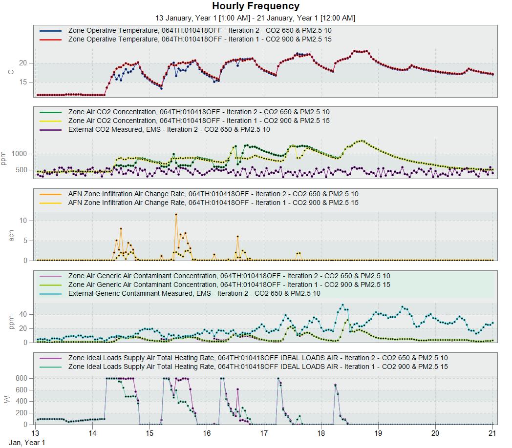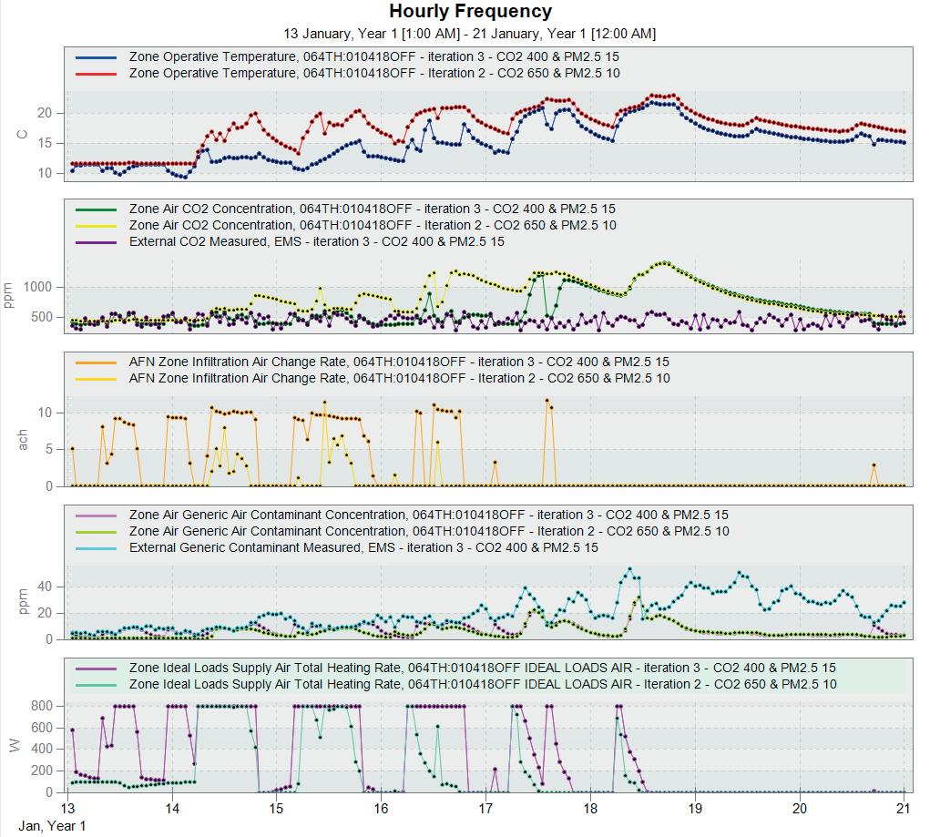 Here the threshold for CO2 is 650 ppm, while the threshold for PM2.5 is 10 μg/m3. The results are presented in figure 4.3 and compared to iteration 1. In this simulation, indoor CO2 concentrations are higher than what was presented in iteration 1, and PM2.5 presents similar concentrations – this is assumed to be because external PM2.5 concentrations are rarely below 10 μg/ m3, and hence as setup by the EMS script, ventilation is not set up to operate in this scenario.