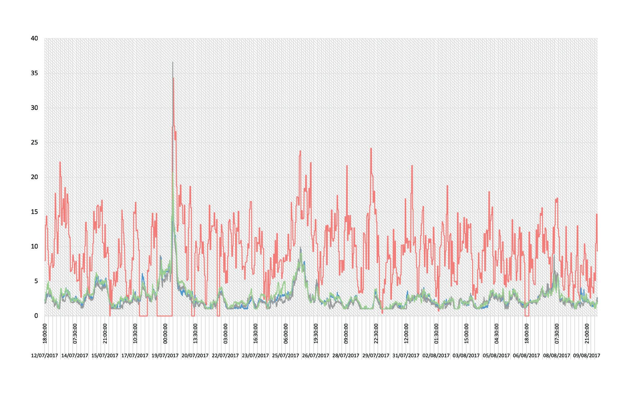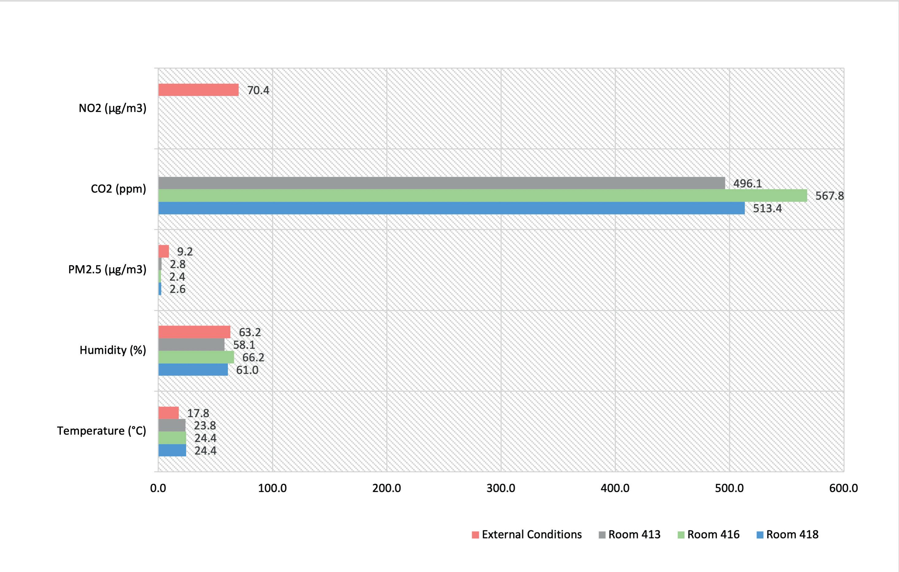 The indoor air quality conditions within all three rooms do not present intensely alarming pollutant concentrations – indicating that there might not be many sources of pollution indoors. Measurements of elevated CO2 levels indoor air are an effective method of identifying poor ventilation in indoor spaces, however all rooms present an average that falls below WELL and Buildings Bulletin 101 guidelines except REHVA’s < 400 ppm target. In a low occupancy or large volume space, a low level of CO2 cannot necessarily be used as an indicator that ventilation is sufficient to mitigate transmissions risks – it is not a good proxy for transmission risk when there is air cleaning as these strategies remove pollutants alone but not CO2.