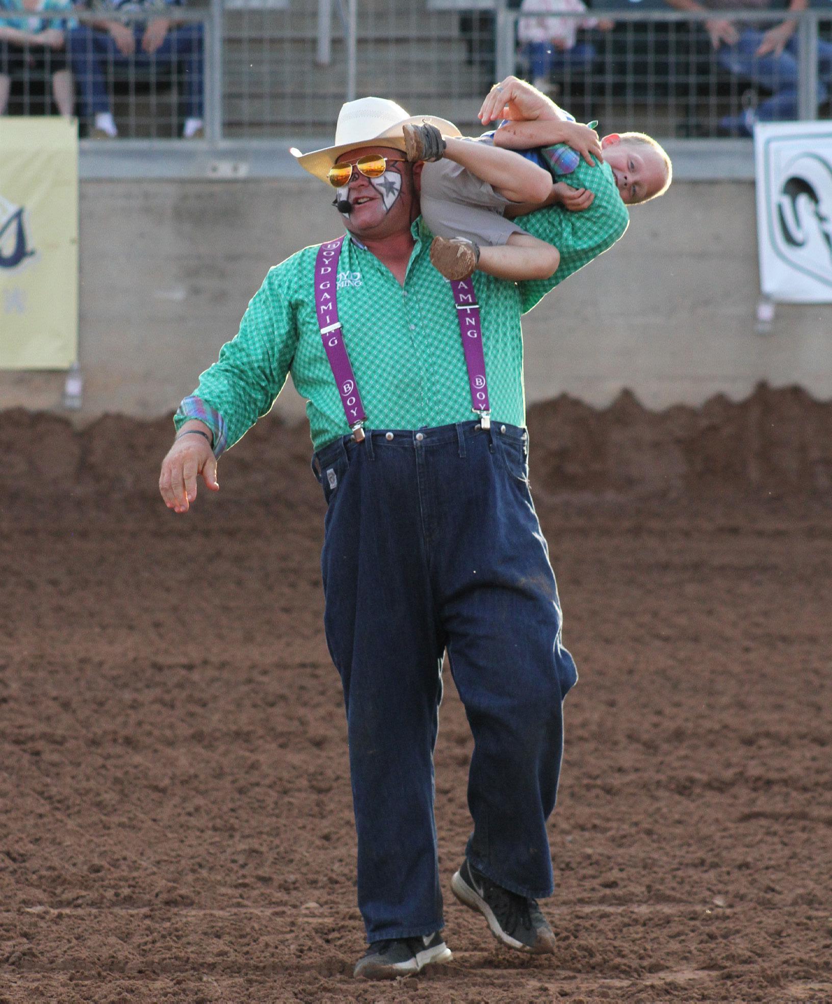 Nate Jestes with local Woodward kid after Calf Scramble at the Woodward Elks Rodeo in Woodward, OK.