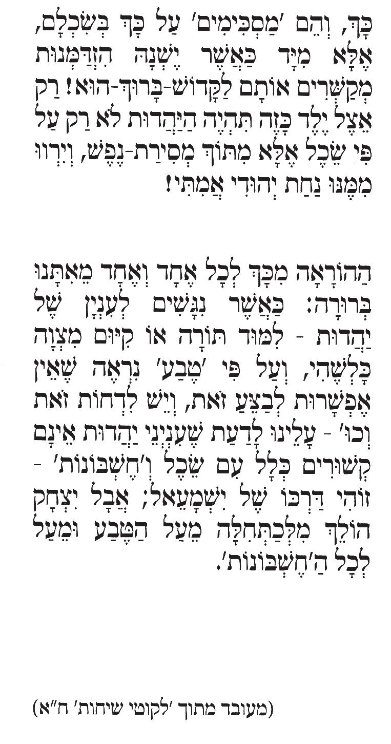 книге «Тания», что есть люди, чья природа утонченна, и они не тянутся к страстям, и само собой, не тянутся к нарушениям Также есть люди, которые усидчивы имогут заниматься Торой без помех Об этих людях говорит Алтер Ребе, что во всей их миссии, ради которой они пришли в этот мир, есть недостаток: им не хватает борьбы со злым началом. Недостаточно, чтобы человек служил Всевышнему «естественно, само собой».