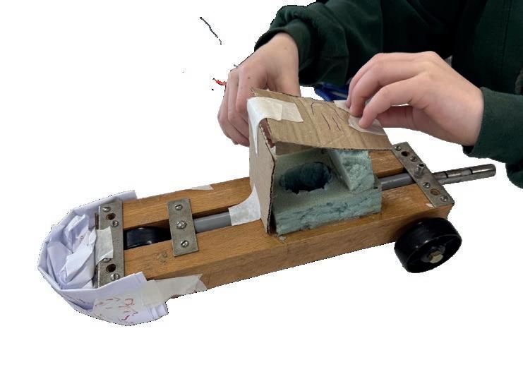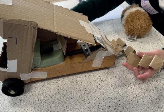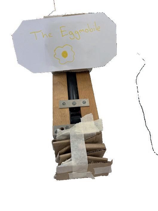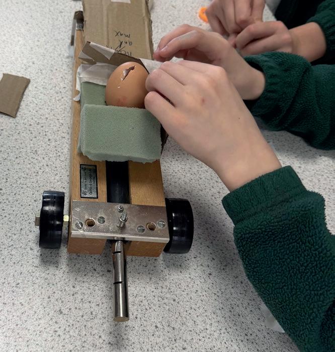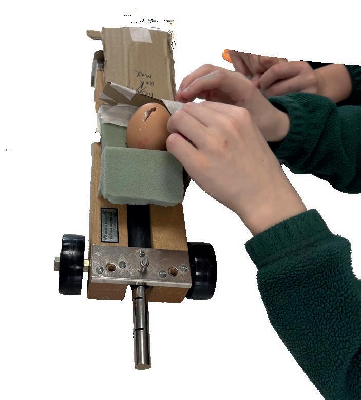 After looking at the science behind crumple zones on cars, and checking their pupils' understanding, Constance, Emilia, and Natalie (Yr12) gave them a practical challenge. Using cardboard, masking tape, and paper, they had to design and construct a crumple zone for their 'car', to help keep its driver (an egg) safe in the event of a crash.