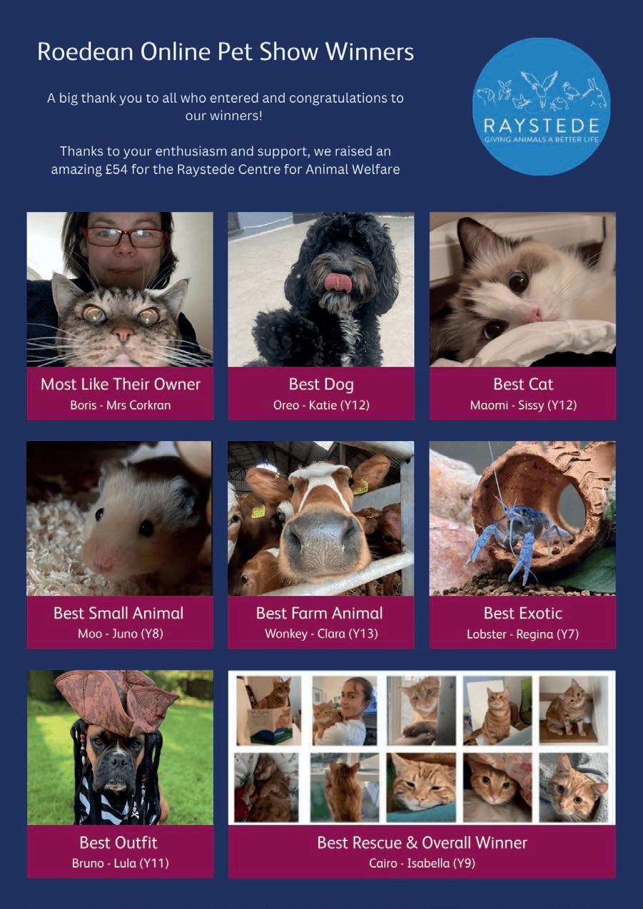 The overall winner is Cairo, owned by Isabelle (Year 9). Congratulations! The entry stood out because of the wonderful story behind Cairo's purchase and the clear bond they share. Their pet was rescued by Raystede, making this achievement especially meaningful. It is a powerful reminder of the life-changing work Raystede does and the happy futures they help create. Isabelle received an afternoon tea voucher at Raystede, and we hope they enjoy this welldeserved and special treat.