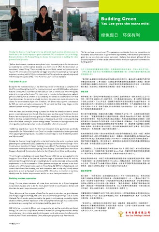 位於上環的香港蘇豪智選假日酒店,憑其傲視同儕的綠色身份,開張以來好評不絕。 《 PRC 建設》雜誌專訪了有利集團的執行董事黃慧敏小姐,分享她興建城中最環保之酒 店的經驗心得。 「我們曾為地皮探討過作其他例如住宅或商業項目的可行性,最終決定興建酒店乃因它提 供最佳的投資回報。」黃小姐道:「這物業是有利集團擁有及建造的第二家酒店,我們曾 在銅鑼灣建過規模更大的類似項目,並由於跟洲際酒店集團愉快的合作經驗,尤其對智選 假日酒店「恰到好處」的服務標準印象深刻,促成了再度合作的良機。」 綠色元素 除卻地基工程,這間274間客房的酒店設計到峻工全由有利包辦。建築總耗資三億五千萬 港元,其中環保設施投入約1,326萬港元,僅為整體成本的3.85%,黃小姐預計該部份能 於四年之內回本。「為公平起見,我通常只考慮採用投資回收期五年內的環保技術,並 好能向股東交代。現在我可以向大家展示回本期比預期更快,令產品能更吸引買家。其 實我只多放一點投資,就能節省58.5%的用電量及70%的碳排放,當然,真正關鍵在於 各個系統的完美融合及發揮。」 黃小姐手持最新數據,欣喜地向我們透露,儘管酒店開業不足一年,已超額完成其年度目 標。她說: 「若要我揀選最引以為傲的環保設施,那會是 Peltia 床頭冷氣系統。我們是首 家開發和申請專利,將技術應用在床頭板上的酒店,然而在其他房間陸續安裝期間,會繼 續完善其設計同時推動節約更多能源。這技術可確保客人在睡覺時,只供應冷風予有需要 的客房範圍。 LEED 特別按這創新研發而給予多寶貴的一分,甚至有客人指明要入住裝有 Peltia 的房間。我們曾收過客人的回應,指在調較溫度時製冷系統產生噪音,我們立刻關 閉房間五天,把系統改善,直至問題完全解決。」 香港蘇豪智選假日酒店-是全球首間同時獲三鉑金級環保建築驗證之酒店,包括:美國綠 色建築委員會的 LEED (領先能源及環保設計—新建造)、香港綠色建築議會的BEAM Plus( 建築環保評保法)以及新加坡建設局的 Green Mark。以創新優先及堅守可持續發展做法, 例如節能及環境最優化、用水效率設計、建築物料之選用及空內環境與質量之管理等創出 驕人成績;而中國方面的認證仍在審批中。 黃小姐解釋說:「大多數香港建築只申請 Beam Plus 和 LEED 驗證,有利亦因在新加坡 業務日趨多元化,為酒店申請了新加坡的 Green Mark;希望利用本酒店向現有及潛在客 戶,展示環保技術及設施全球通用之餘,亦能按當地情況成功推行。」 其他運用的綠色科技,包括了利用五維建築信息模型作施工進度監察及成本控制,確保 不會超支超時,加上有利獨家研發的 PowerBox 大廈監測系統,能實時監控,尋找可進 步之空間;同時使用了全港最大型的太陽能板,以受選用可循環再用的高強度混凝土建 材等等,酒店可以稱得上是每一寸設計也是以環保為出發點。 建立市場聲譽 黃小姐稱:「對於我而言,這些舉措均出自內心。作為一間綜合綠色企業,有利目標是 在每個涉獵的業務領域內成為環保先鋒,然後竭盡所能多行一步 。」酒店會於每日下午 五時,為住客舉辦綠色導賞團,介紹內裡的環保設施及香港自然生態,亦會替住客推介 如濕地公園等本地的生態旅遊。黃小姐續說:「最令我感觸的,是懸掛於每間客房內的 畫作,那是出自一群輕度殘障小朋友的手筆,以上環街景作靈感而畫成。當他們看見自 己作品時,那份興奮至今難忘,而入住的賓客亦一致讚許!」 蘇豪智選假日已超越初開業時訂下的八成入住率目標,並開始獲得具社會責任意識的企業 青睞。甫開業三個月,酒店已獲得客房預訂大獎,客源均衡遍布歐洲、美洲、亞太地區與 中國大陸,達致真正國際化。 「至目前為止,我們接待過全球超過70個組織,涵蓋酒店、建造業的同仁,及政府部門, 都親由本公司董事及高層管理人員作技術簡報。我深信,幾乎每一位曾到訪的賓客,均對 當發展商真正致力於環保建造時,能實現的 成果記憶尤深。」黃小姐總結道。