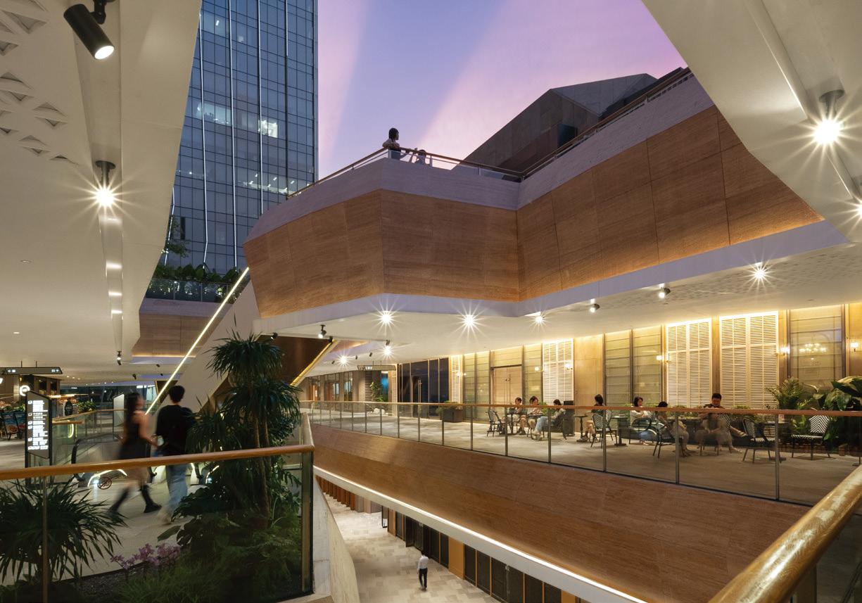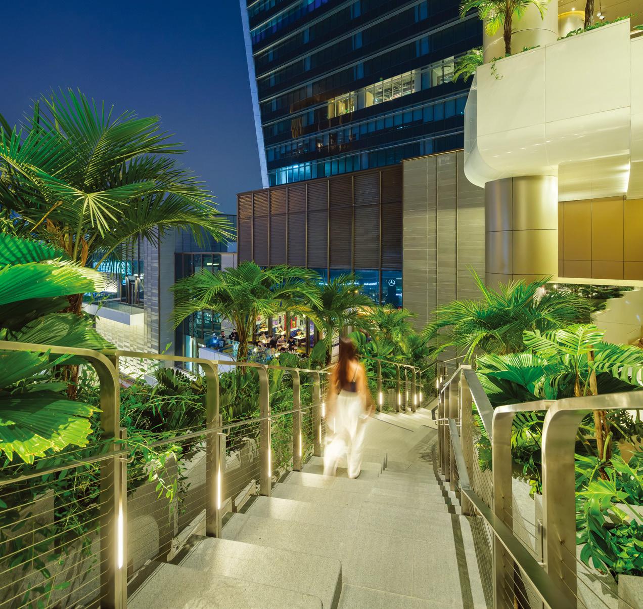 The urban ribbon, a pedestrian walkway at L2, connects the office towers while integrating with adjacent developments, the plaza, and a neighbouring public park. At select points, the ribbon rises and descends, leading visitors to a beautifully landscaped sky garden where they can dine under the stars or enjoy tranquil moments amidst the city’s energy.