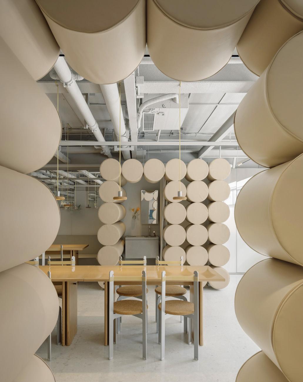 Material choices reinforce the brand’s playful yet refined identity. A standout stainless steel “chubby” superstructure and rolling canopies merge branding with practicality. Terrazzo patios with rounded edges stretch into the courtyard, encouraging fluid movement. Padded cylindrical partitions, inspired by noodles, dampen sound and create intimacy. Bespoke furniture crafted from compostable rubber bands, cork, and aluminium echo the improvisational spirit of hutong craftsmanship. Office AIO blends minimalism with Sichuan vibrance, shaping a socially engaging, adaptable space that flexes with time and urban rhythms. The result is a restaurant that doesn’t just serve food—it defines the experience of sharing it. Bold, inventive, and unmistakably Pang Mei.